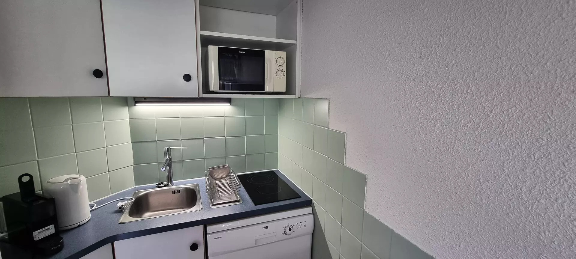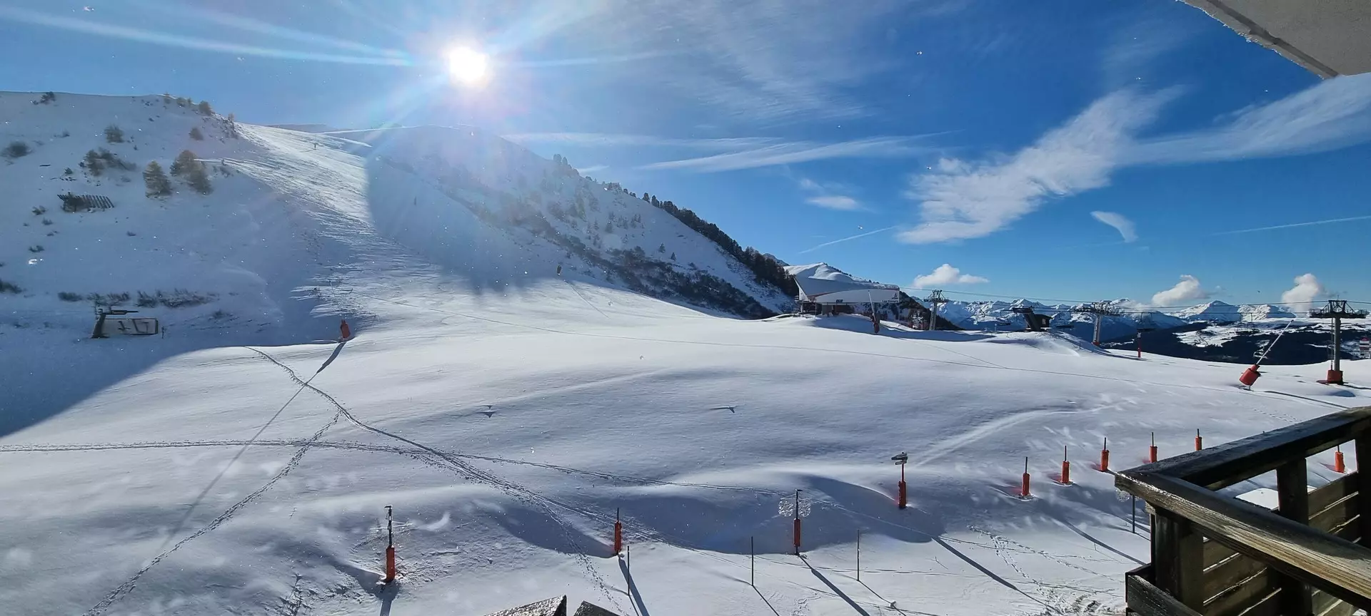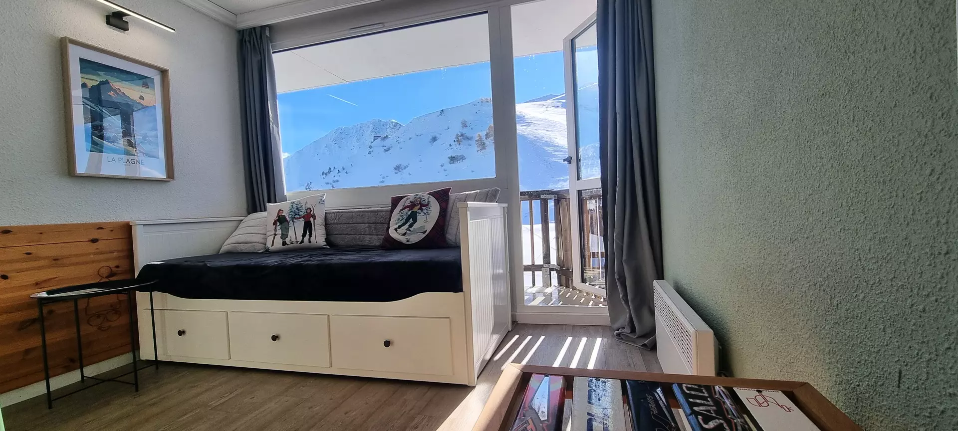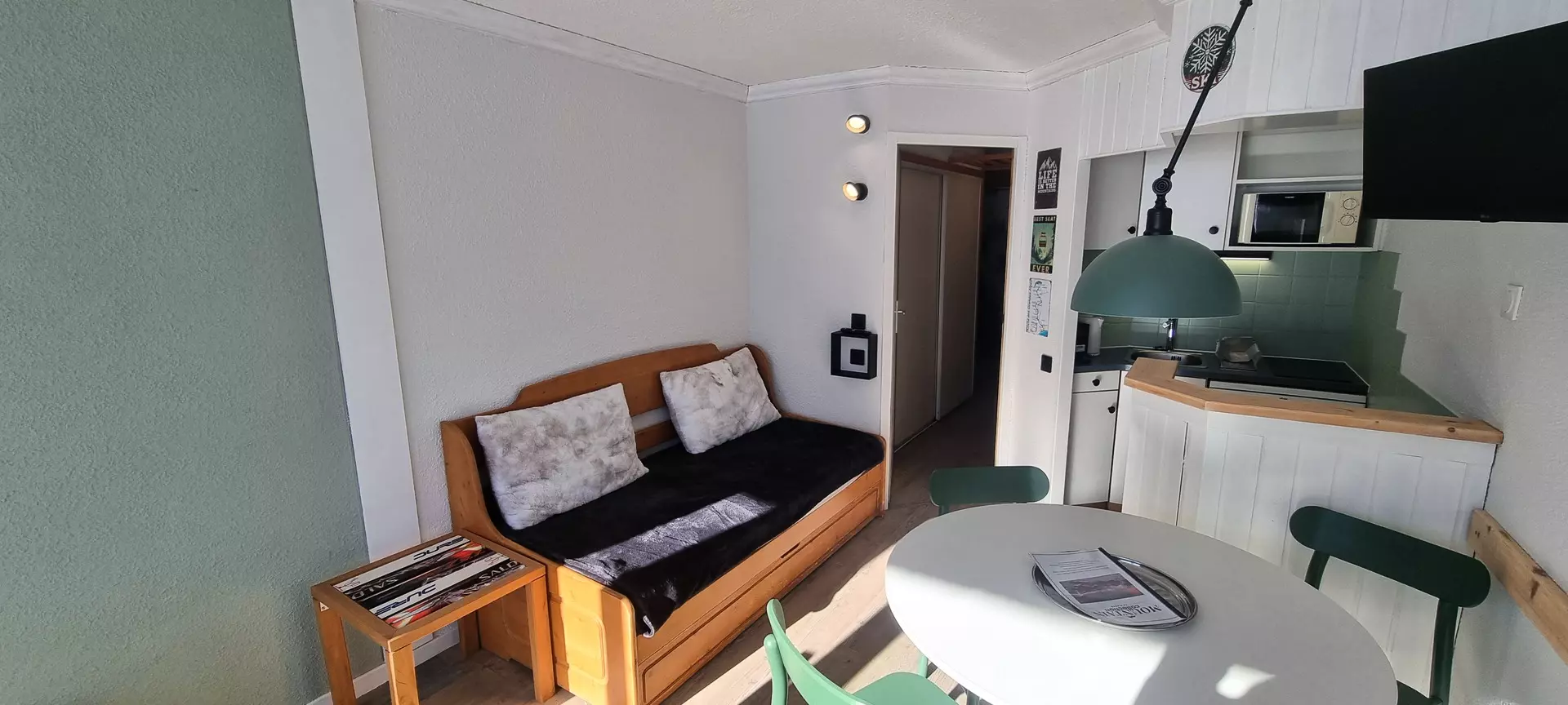 Dieses Studio befindet sich auf Ebene „M“ des Paquebot des Neiges und ist mit dem Aufzug „Chamois“ erreichbar. Es besteht aus einer zum Wohnzimmer offenen Küche, einem Badezimmer und einer separaten Toilette. Der Südbalkon bietet einen herrlichen Blick auf die Pisten von Aime 2000.