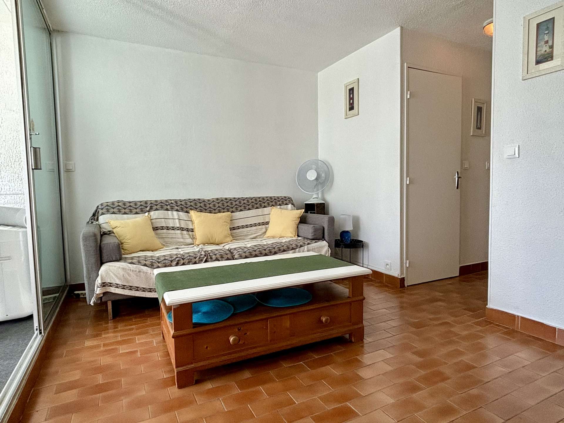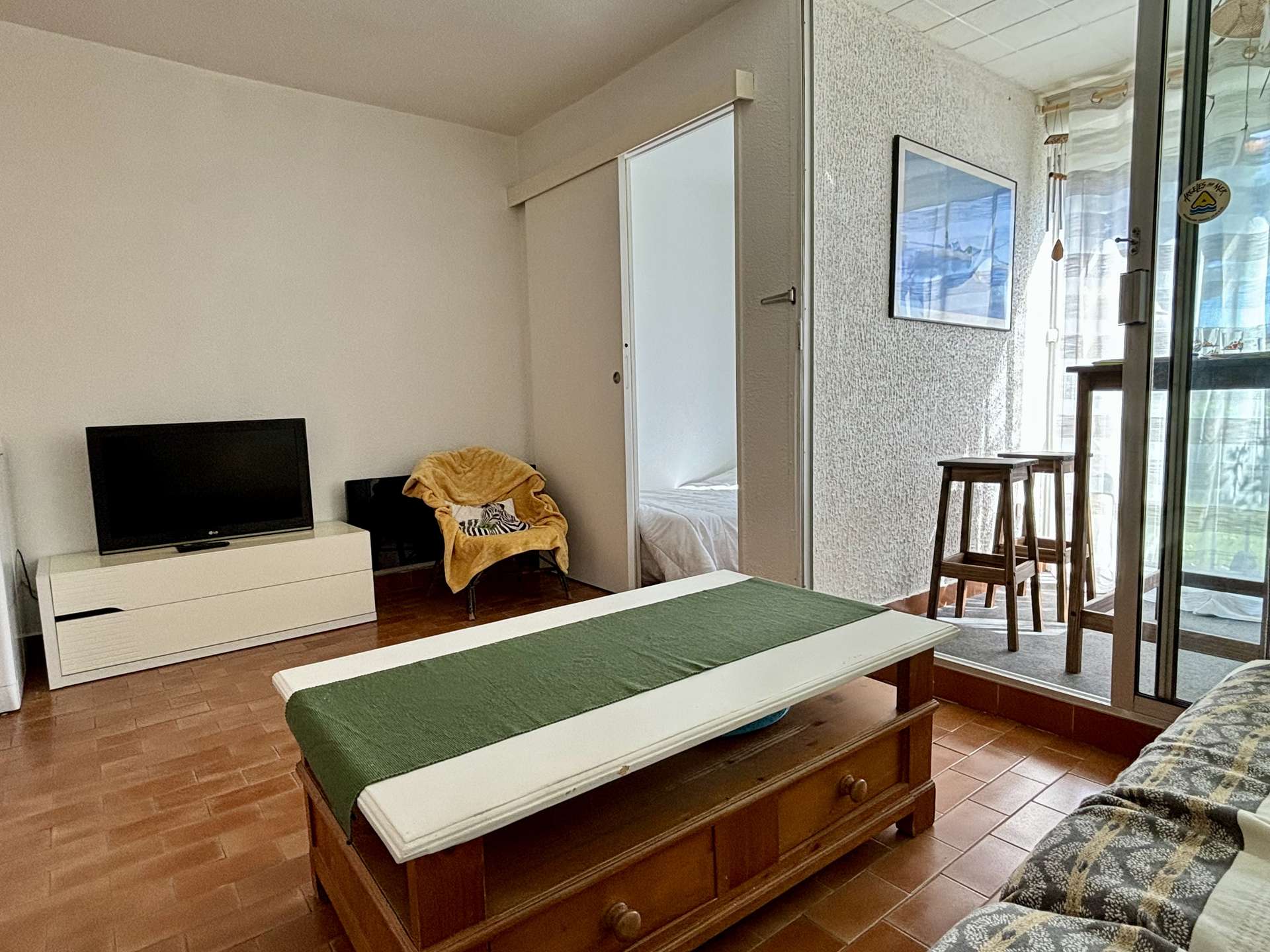 Diese im Süden gelegene Ferienwohnung im Erdgeschoss besteht aus einem Wohnzimmer mit einem 2-Sitzer-Schlafsofa, einer Kabine mit einem 120 cm breiten Bett, der Küche, dem Badezimmer und einer separaten Toilette.