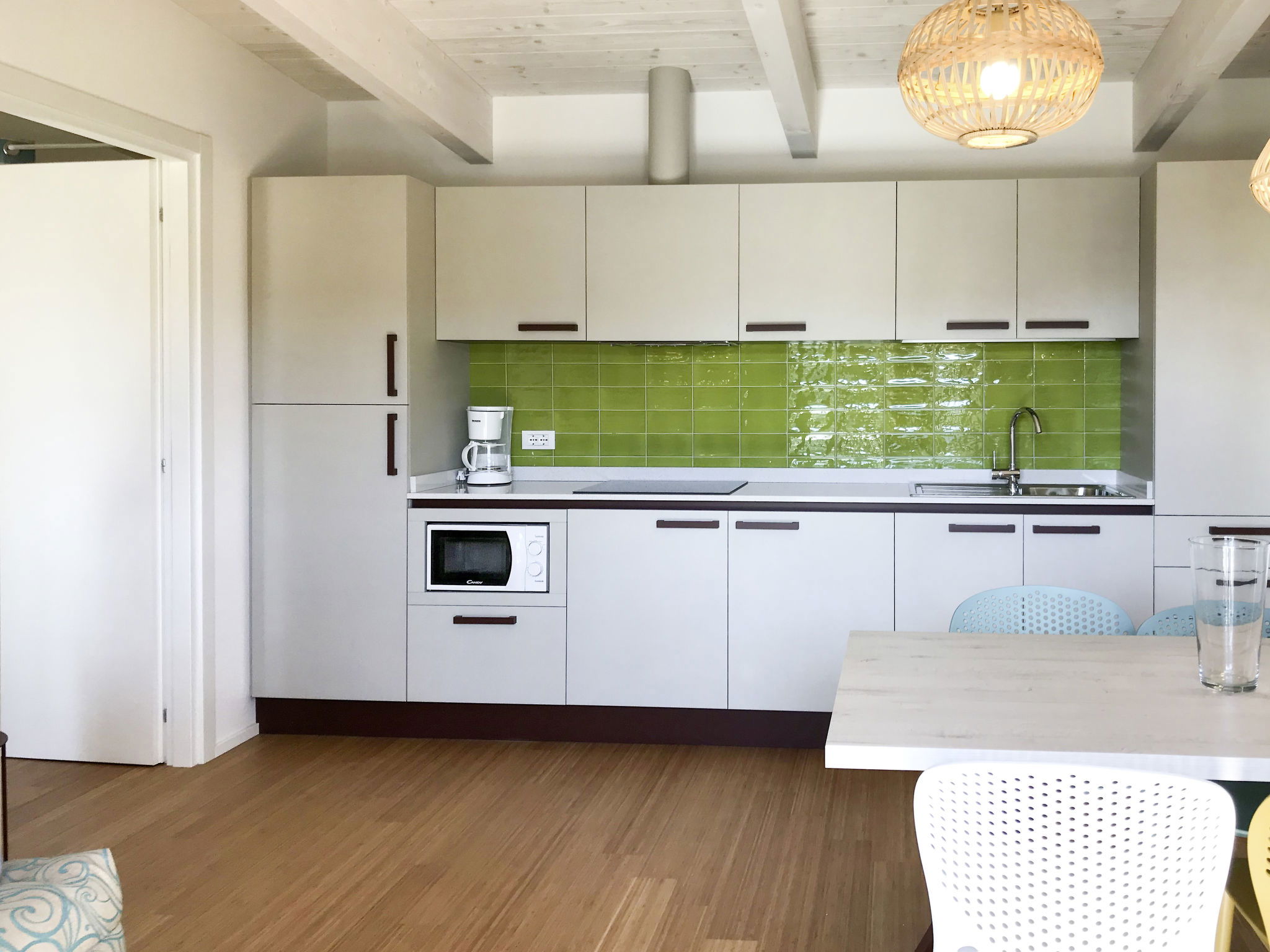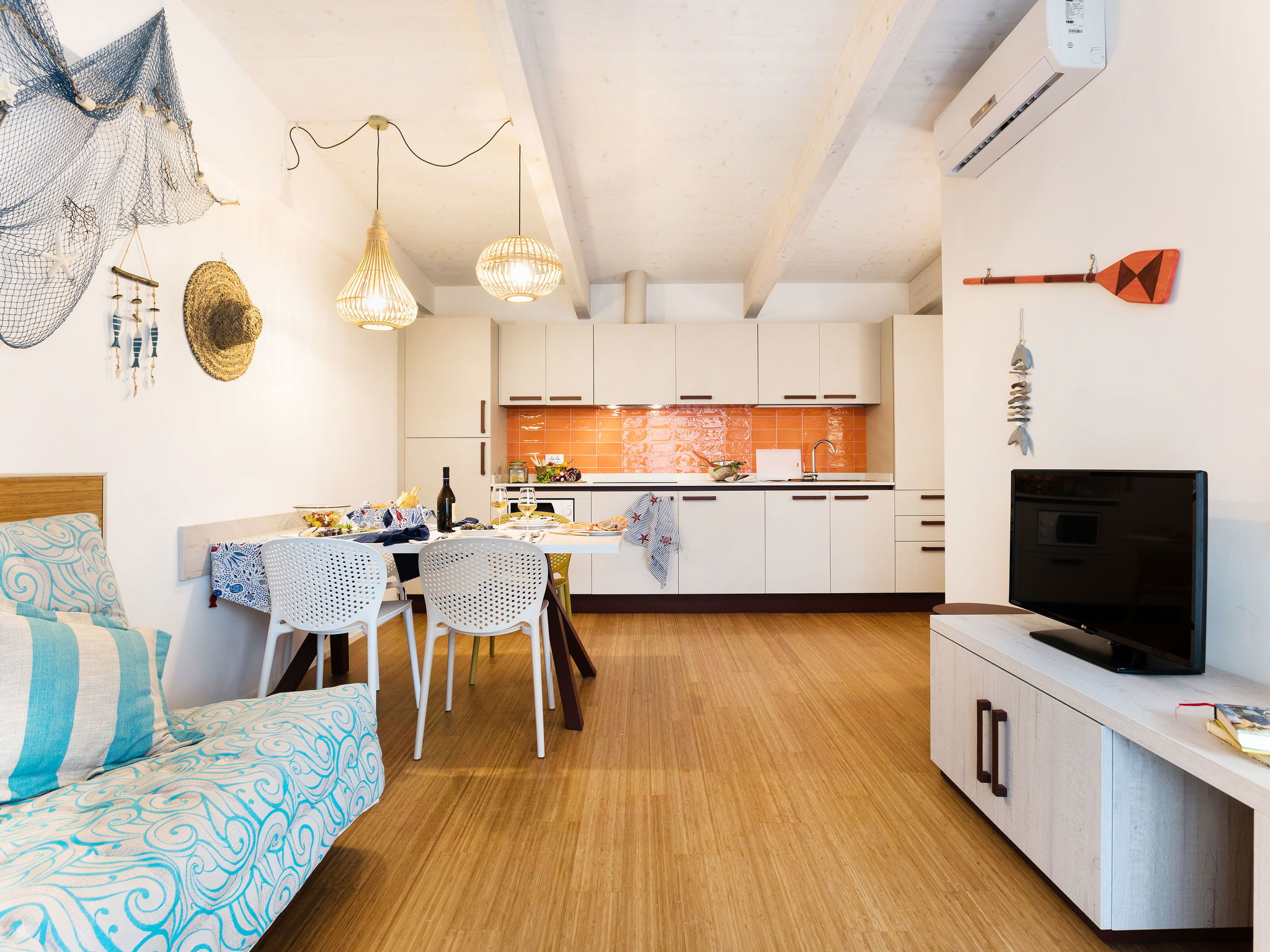 3-Zimmer-Wohnung 50 m2, im erhöhten Erdgeschoss. Schön und stilvoll eingerichtet: Wohn-/Schlafzimmer mit 1 Doppeldiwanbett, Esstisch, Küchenblock, Sat-TV, Klimaanlage und Warmluftheizung. Ausgang zur Terrasse. 1 Zimmer mit 1 Bett, 1 Doppelbett, Klimaanlage und Warmluftheizung. 1 Zimmer mit 2 Betten, Klimaanlage und Warmluftheizung. Offene Küche (4 Induktionskochplatten, Mikrowelle, Tiefkühler, elektrische Kaffeemaschine). Dusche/WC. Terrasse 22 m2, überdacht. Terrassenmöbel. Zur Verfügung: Safe, Kinderhochstuhl, Babybett. Internet (WLAN, gratis). Maximal 3 Haustiere/Hunde erlaubt. Es werden keine zusätzlichen Gebühren vor Ort fällig, ausgenommen der örtlichen Kurtaxe. Bettwäsche, Handtücher, Endreinigung und alle Energiekosten sind inkludiert. IT027034A1TVVZCQAQ