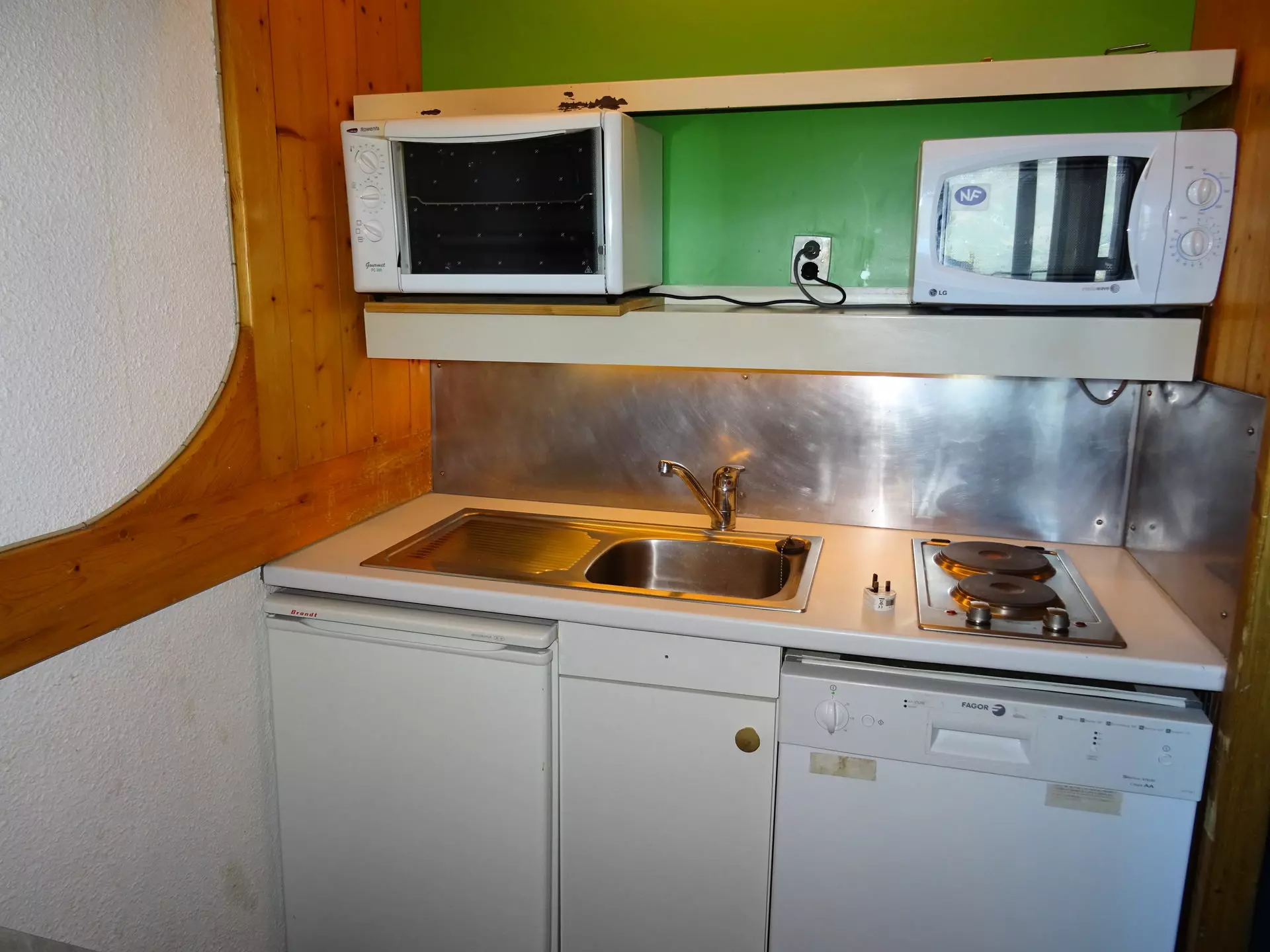 Es ist komplett ausgestattet mit Elektroherd, Backofen, Mikrowelle, Geschirrspüler und Kühlschrank.