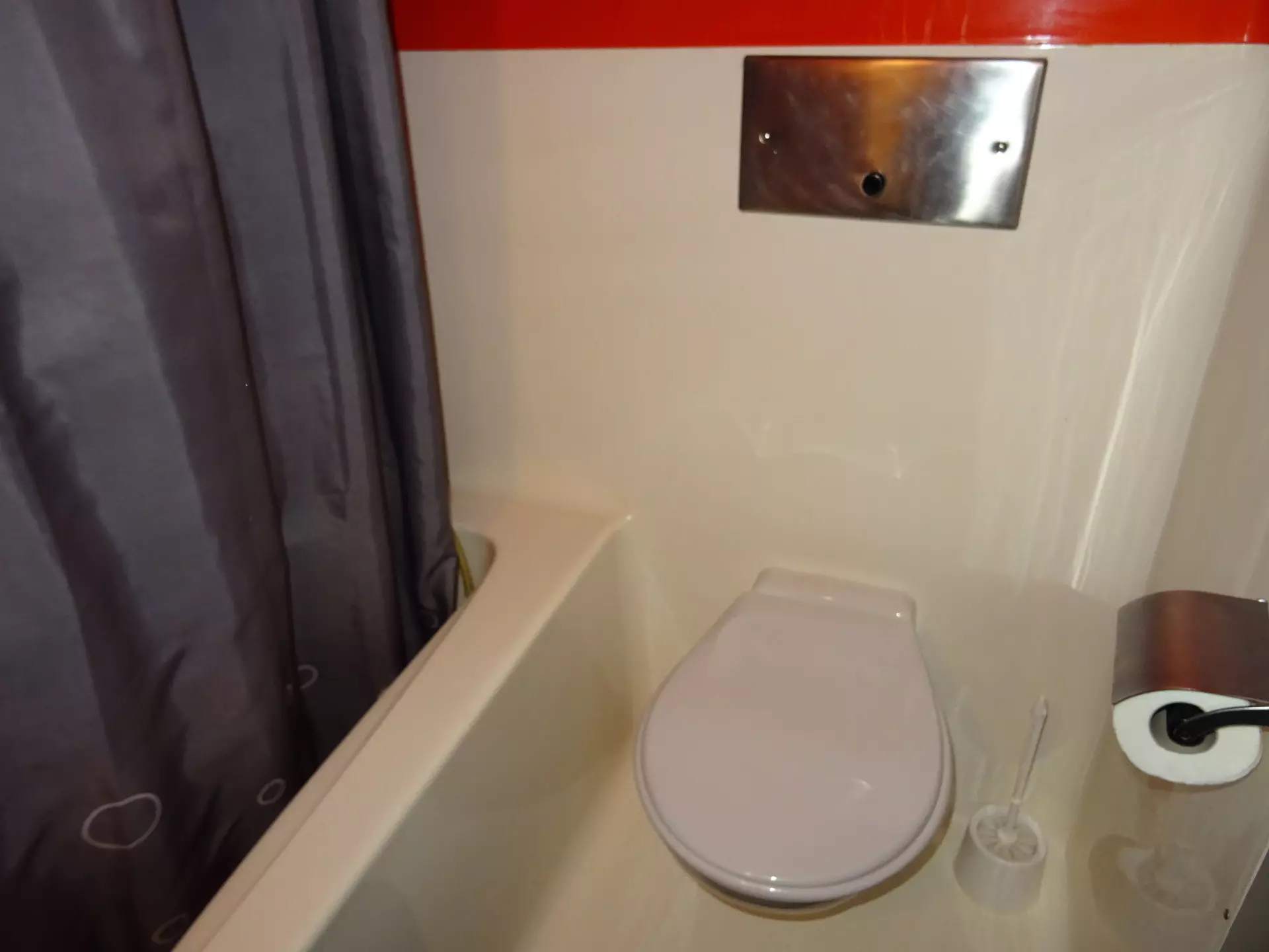 Es ist komplett ausgestattet mit Elektrokochfeldern, einem Backofen, einer Mikrowelle und einem Kühlschrank.