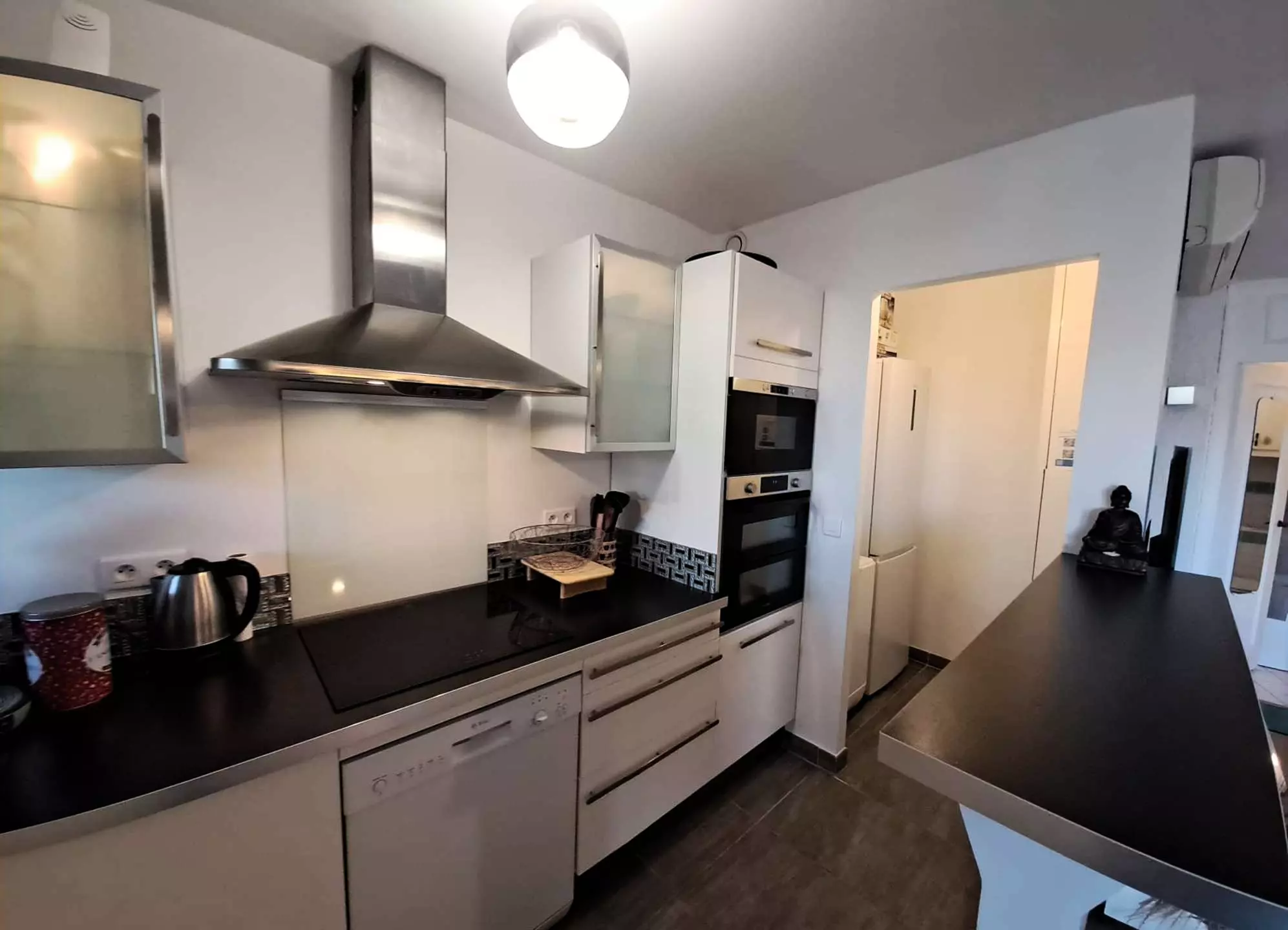 Geschirrspüler, Waschmaschine, Induktionskochfeld, Mikrowelle, Backofen, Kühl-Gefrierkombination, Senseo-Kaffeemaschine, Toaster, Wasserkocher, Flachbildfernseher, Klimaanlage, WLAN, Gasgrill, Raclette, Waffel, Fondue und ein elektrischer Wok.