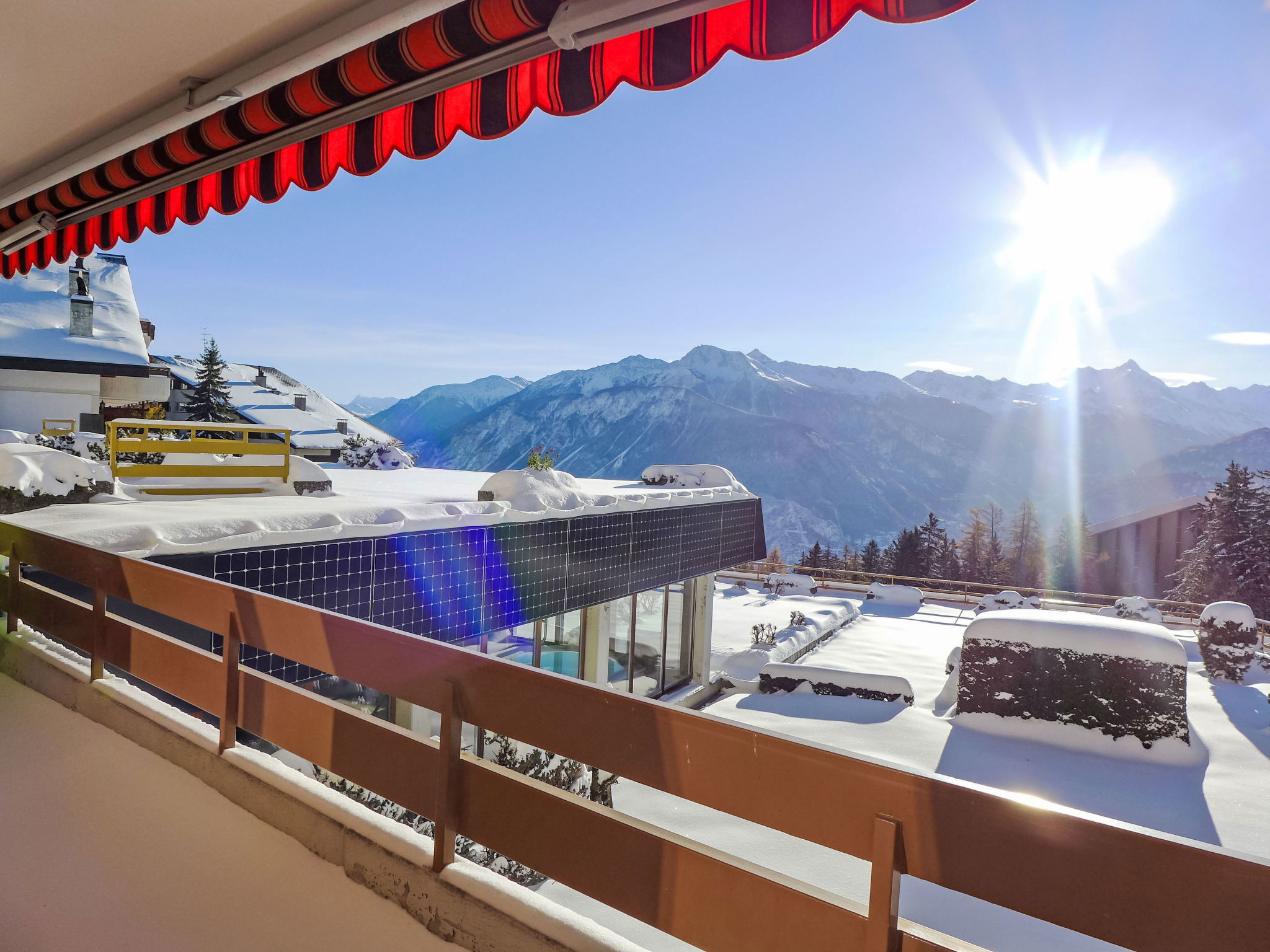 Schwimmbad (ca. 26°) und Sprudelbad (ab 16 Jahre alt) im November geschlossen. Das Gebäude wurde auf einem geneigten Grundstück erbaut. Die Stockwerke werden als Ebenen betrachtet, die ab Residenzboden nummeriert sind. Bei starkem Schneefall, ist es gemäss den Anweisungen des Administrators untersagt, die Terrassen vom Schnee zu räumen. Terrassenhaus "Terrasse des Alpes". Im Ortsteil Marigny, 400 m vom Zentrum von Montana, sonnige Lage, 1.5 km vom See, 1.5 km vom Skigebiet, Richtung Südwesten. Zur Mitbenutzung: Hallenbad beheizt (12 x 5 m, saisonale Verfügbarkeit: 01.Jan. - 31.Okt. und 16.Dez. - 31.Dez. Öffnungszeiten Schwimmbad: 08:00-20:00). Sprudelbad, Terrasse. Im Hause: Aufenthaltsraum, Fahrstuhl, Skiraum, Zentralheizung, Waschmaschine, Wäschetrockner (zur Mitbenutzung, extra). Einkaufsgeschäft, Supermarkt, Restaurant, Bar, Café 400 m, Zentrum zu Fuss in 5 Minuten erreichbar, Bushaltestelle "Montana Poste" 300 m, Bahnstation "Funiculaire Montana Gare" 450 m, Badesee "Moubra" 1.5 km. Golfplatz (18 Loch) 3.8 km, Skisportanlagen 1.5 km. Bitte beachten: Gratis Skibus.