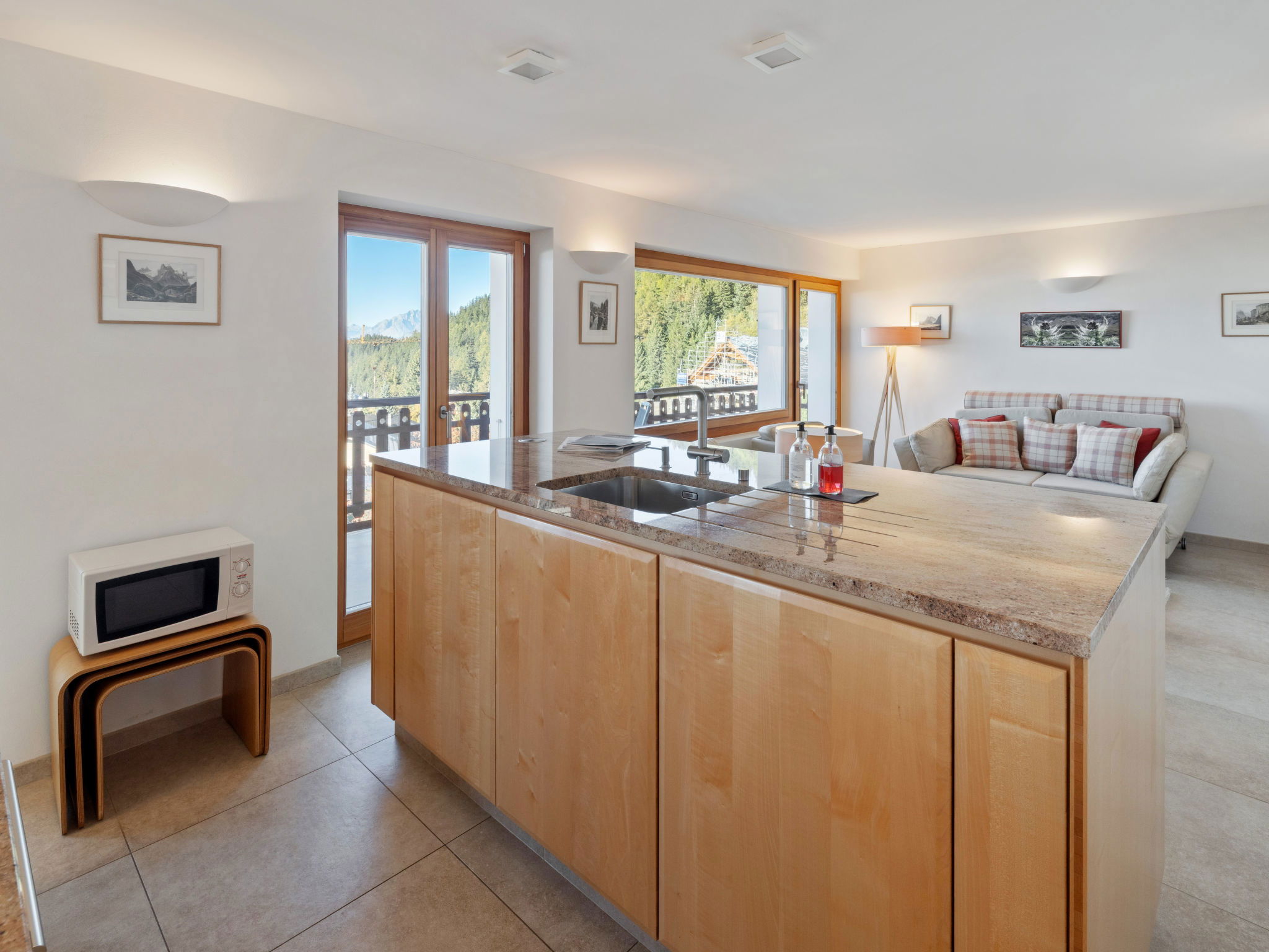 "Les Aiguilles Vertes Rez inférieur", 3-Zimmer-Wohnung 70 m2, im erhöhten Erdgeschoss. Komfortabel und gemütlich eingerichtet: Wohn-/Esszimmer mit Kabel-TV. Ausgang zum Balkon. 1 Zimmer mit 2 Betten (90 cm, Länge 200 cm), Bad/WC. 1 Zimmer mit 2 Betten (90 cm, Länge 200 cm). Wohnküche (Backofen, Geschirrspüler, 4 Induktionskochplatten, Toaster, Wasserkocher, Mikrowelle, elektrische Kaffeemaschine, Kapseln für die Kaffeemaschine (Nespresso) extra, Racletteofen, Fondue Set (Chinoise, Käse)). Dusche/WC. Grosser Balkon 20 m2, Südwestlage. Balkonmöbel, Liegestühle (2). Sehr schöne Sicht auf die Berge und die Landschaft. Zur Verfügung: Bügeleisen, Haartrockner. Internet (WLAN, gratis). Garage Nr. 2, Höhe 190 cm, Breite 230 cm. Bitte beachten: Nichtraucher-Unterkunft. Maximal 1 Haustier/Hund erlaubt. Kein Fahrstuhl.