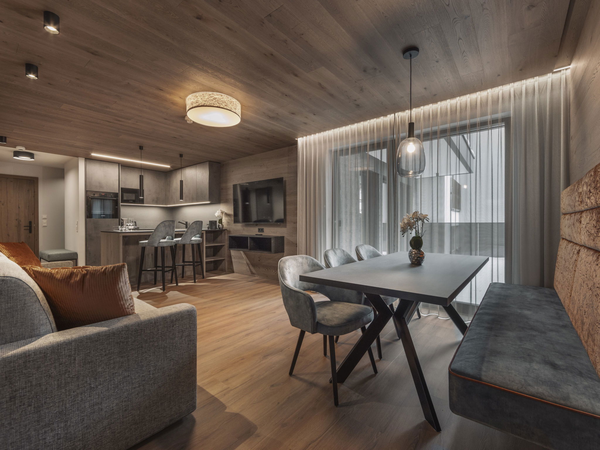 Ischgl: Luxuriöses Appartementhaus "Chalet Fliana". Im Ort, sonnige, erhöhte Lage, 200 m vom Skigebiet. Im Hause: Skiraum, Zentralheizung. Parkplatz beim Haus. Lebensmittelgeschäft 350 m, Restaurant 260 m, Bar 500 m, Bushaltestelle 900 m, Thermalbad "Therme Ischgl" 950 m. Skisportanlagen 200 m, Skiverleih 400 m. Bekannte Skigebiete sind gut erreichbar: Ischgl 200 m.