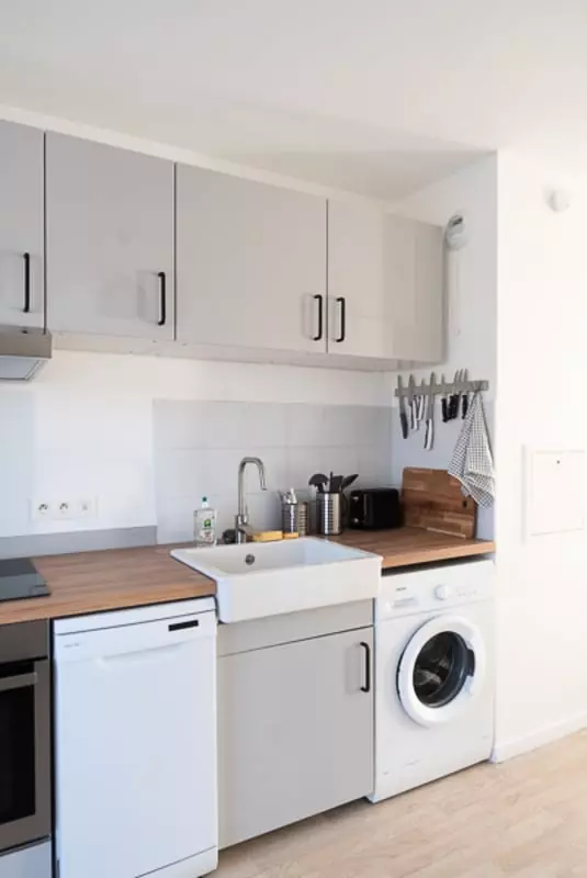 1 voll ausgestattete Küche (Induktionskochfeld, Backofen, Mikrowelle, Geschirrspüler, Waschmaschine);