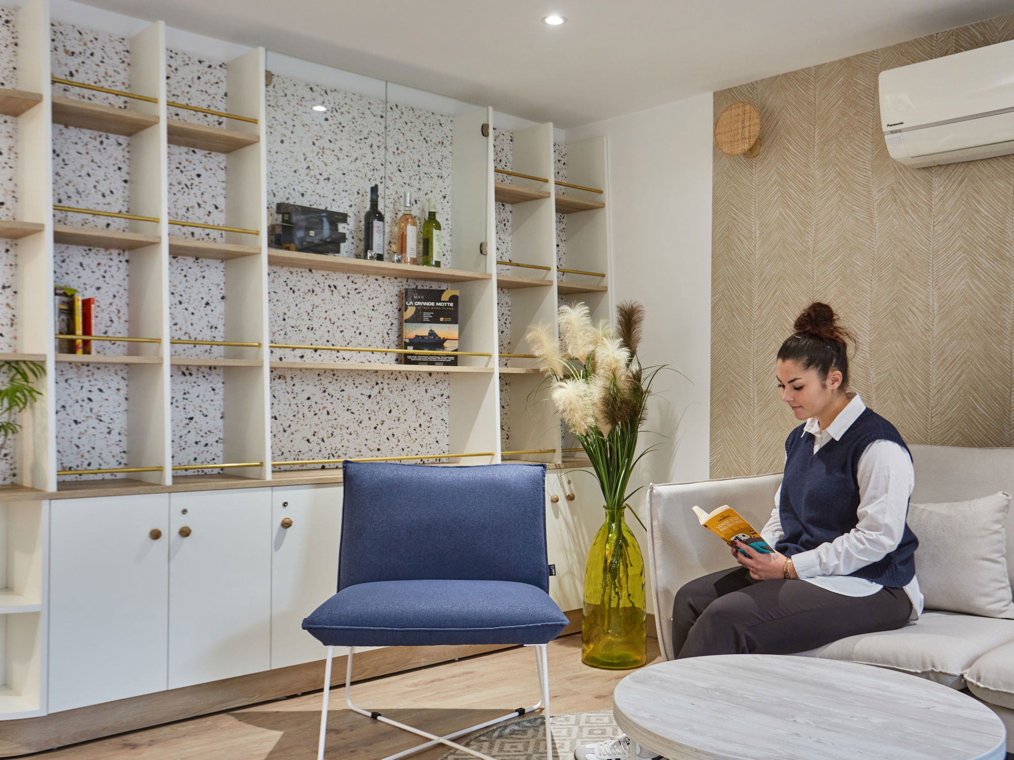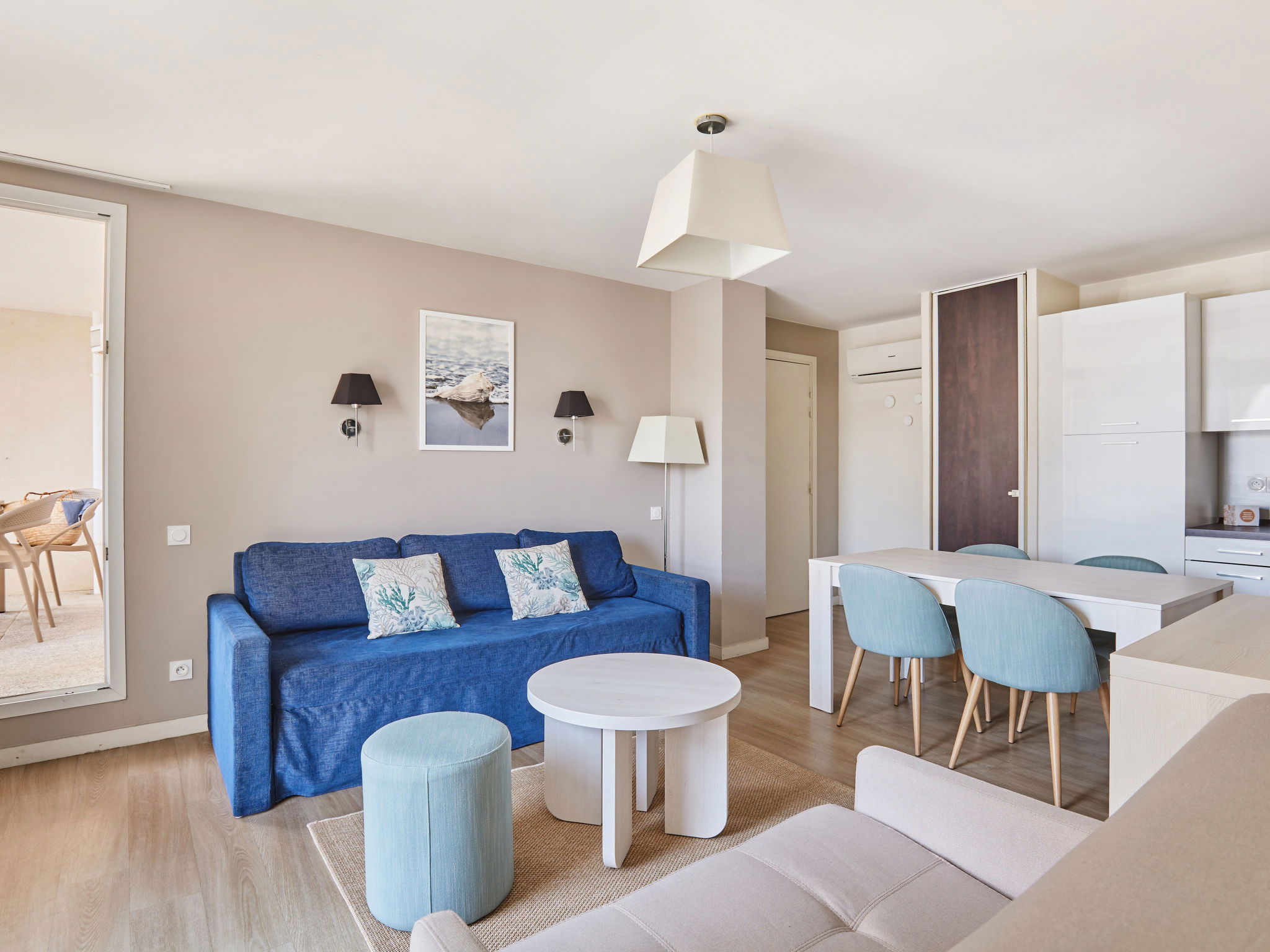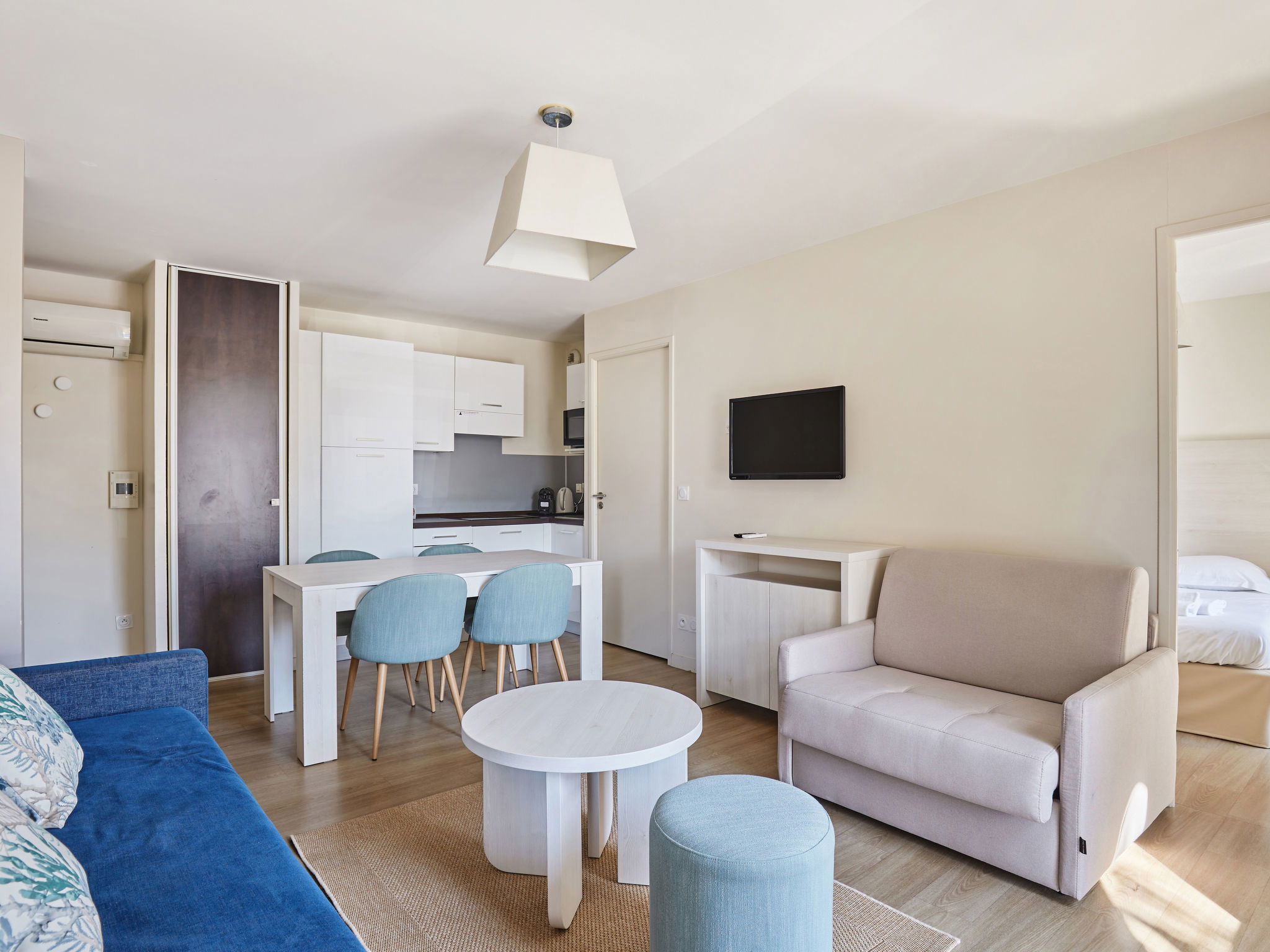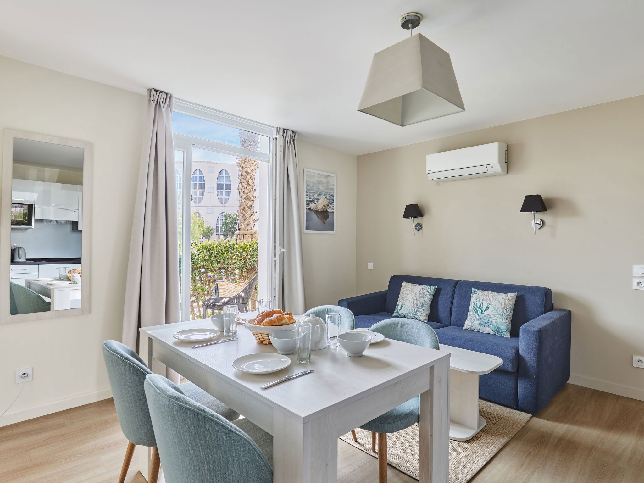 "Odalys Référence du Soleil", 1-Zimmer-Studio 27 m2, im Erdgeschoss. Komfortabel eingerichtet: Wohn-/Schlafzimmer mit 1 Doppeldiwanbett, Esstisch, TV und Klimaanlage. Ausgang zur Terrasse. Kleine, offene Küche (Geschirrspüler, 2 Glaskeramikplatten, Wasserkocher, Mikrowelle, elektrische Kaffeemaschine). Ausgang zum Balkon, zur Terrasse. Dusche/WC. E-Heizung. Terrasse, Westlage. Terrassenmöbel. Zur Verfügung: Kinderhochstuhl, Babybett, Haartrockner. Internet (WLAN, gratis). Bitte beachten: Nichtraucher-Unterkunft. Maximal 1 Haustier/Hund erlaubt. Rauchmelder, Feuerlöscher.