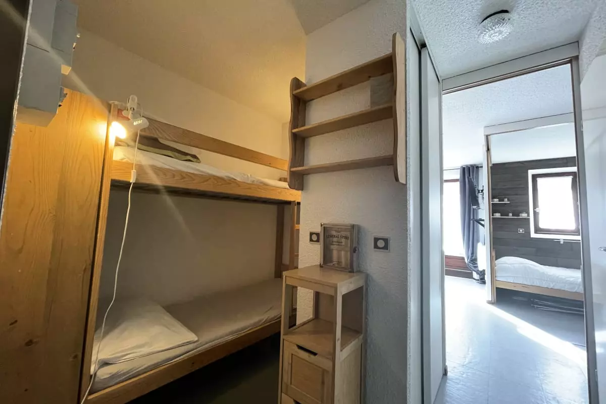 Diese einladende Unterkunft bietet ein Schlafzimmer im Bergstil mit einem Etagenbett (90 x 200 cm), eine Schlafnische mit einem Doppelbett (140 x 190 cm) und ein Wohnzimmer mit einem Schlafsofa (140 x 200 cm) zum Entspannen nach einem erlebnisreichen Tag. Eine voll ausgestattete Küche und ein Badezimmer stehen Ihnen ebenfalls zur Verfügung.