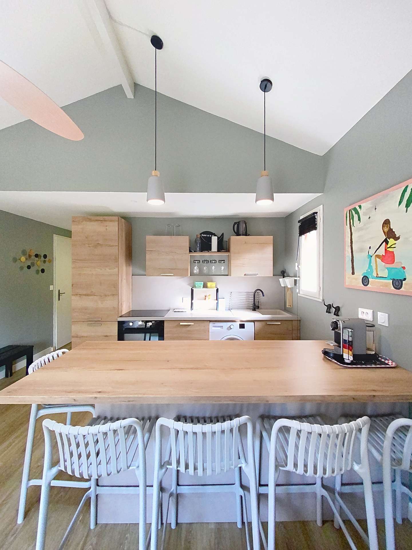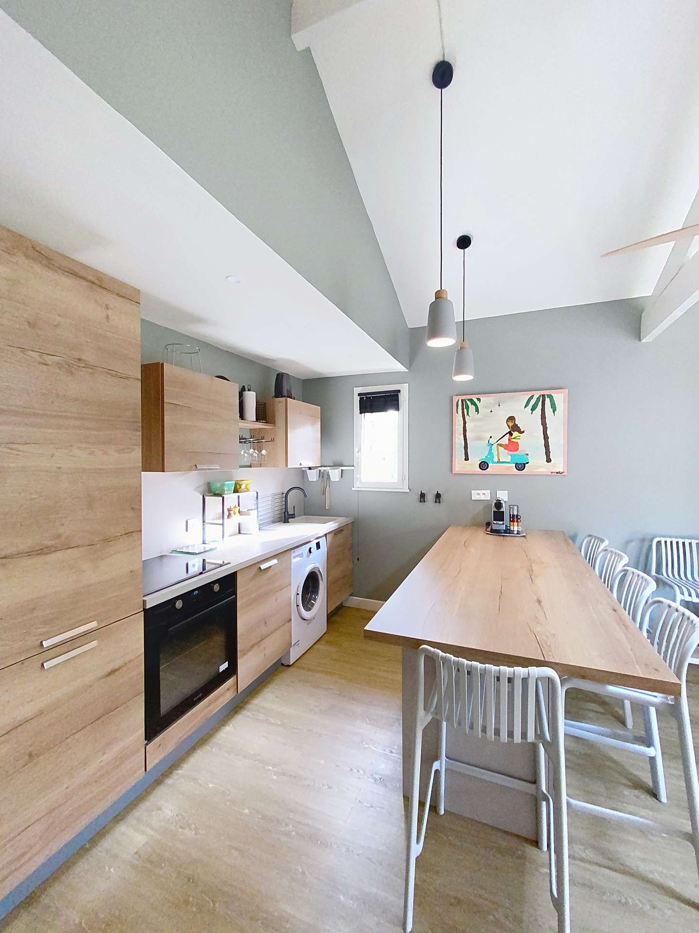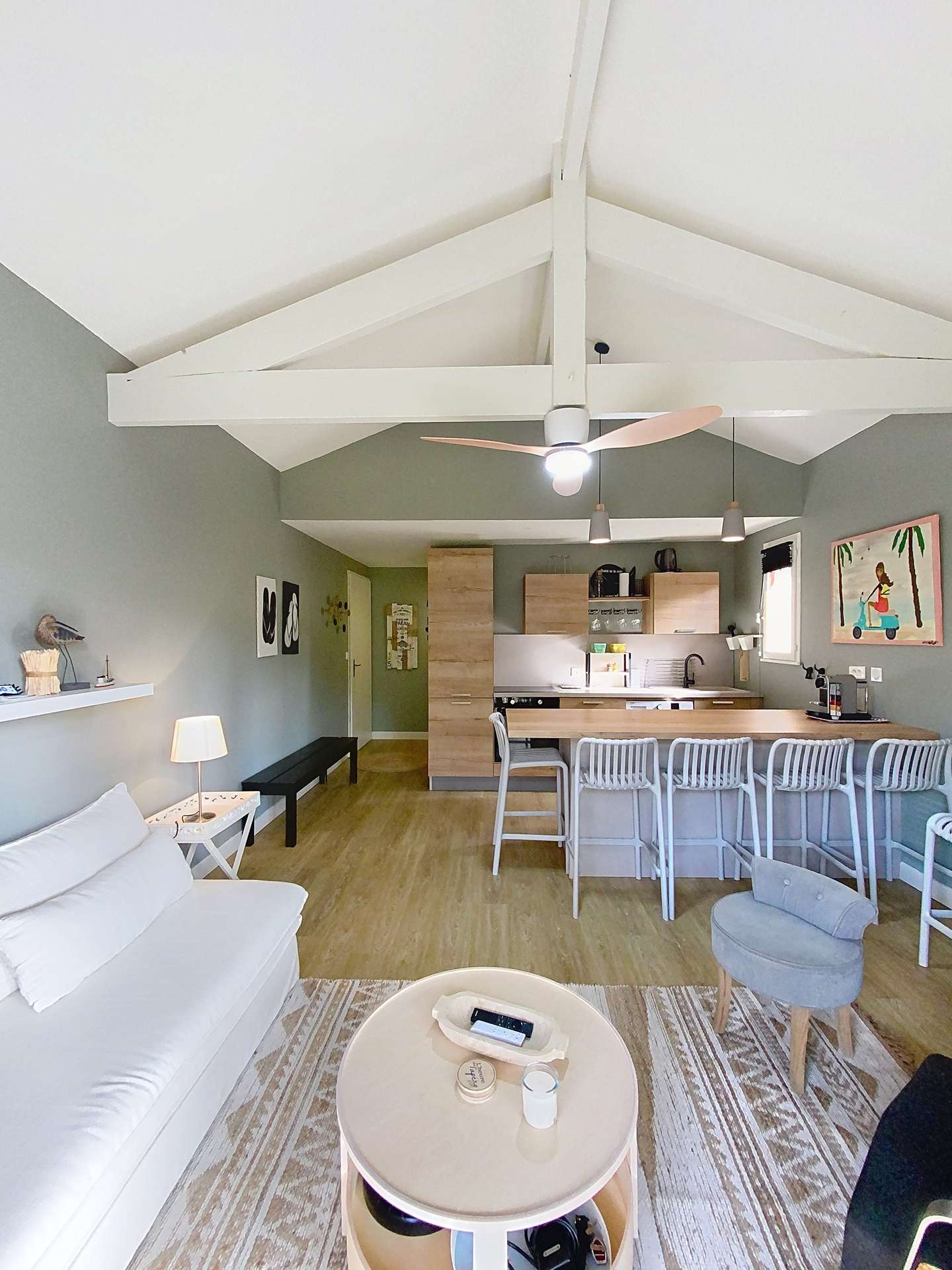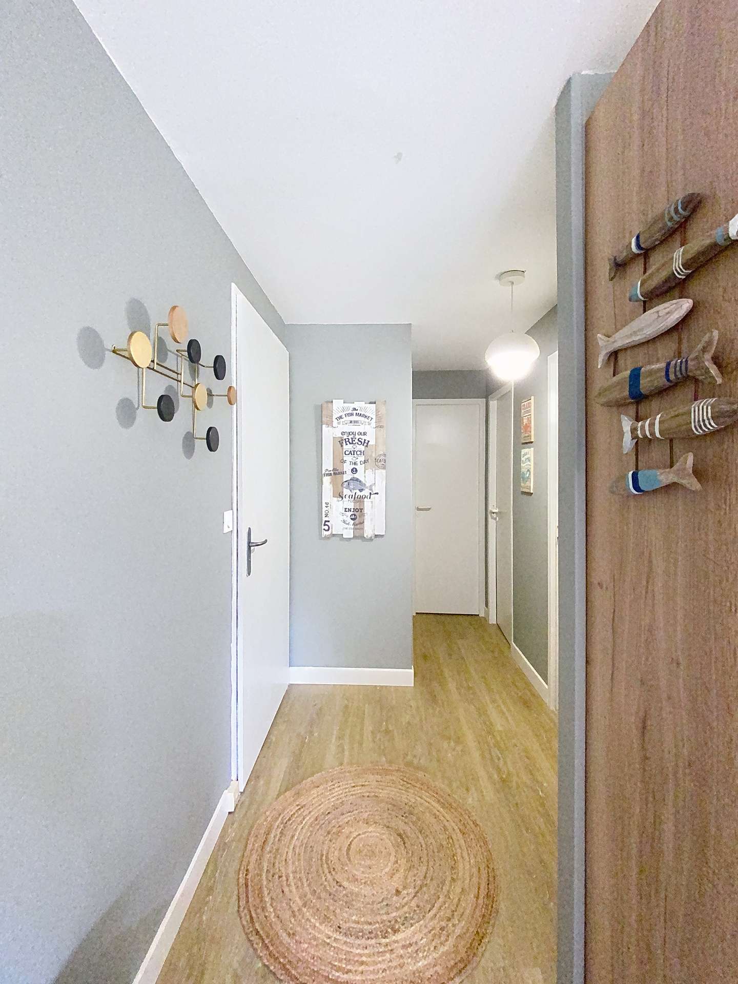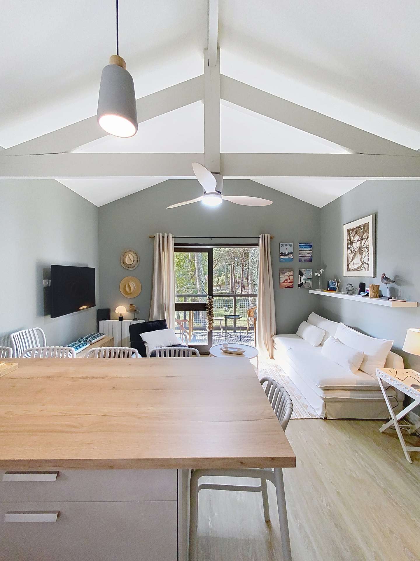 Die Unterkunft verfügt über zwei Schlafzimmer: eines mit einem 160 cm breiten Doppelbett, das andere mit Etagenbetten – ideal für Kinder. Das Schlafsofa im Wohnzimmer bietet Platz für zwei weitere Gäste.