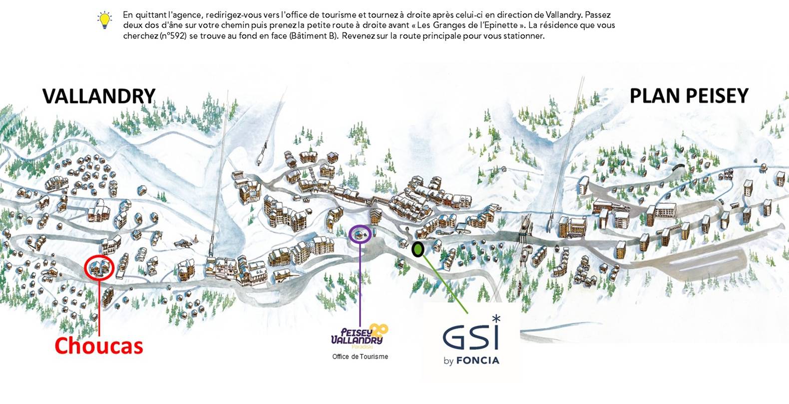 Die Residenz befindet sich in Vallandry. Der Zugang zu den Pisten erfolgt zu Fuß entlang der Straße und über die Zufahrtsrampe, die vor der Residenz Arc en ciel vorbeiführt.