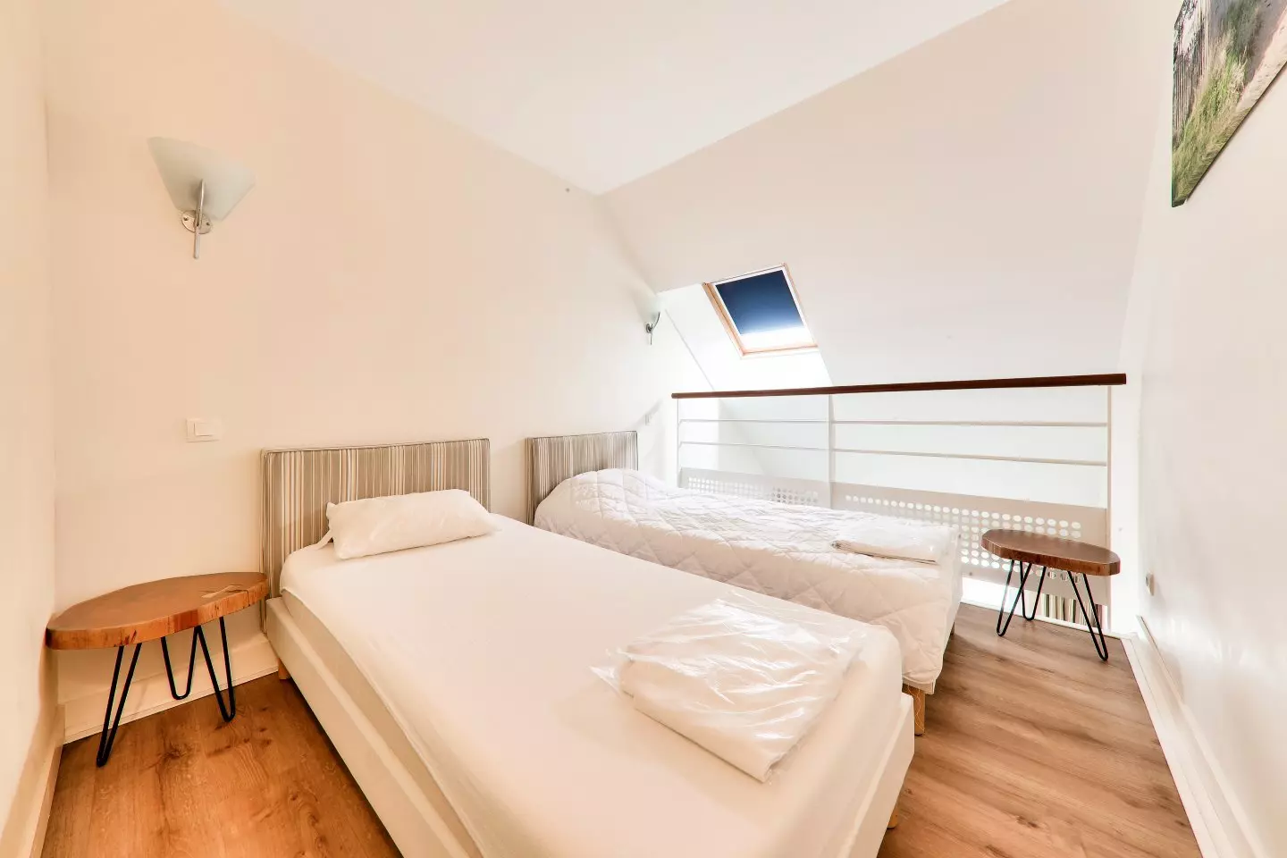 Zusammensetzung des Wohnzimmers: 1 Doppelbett. 1 Mezzanine mit 2 Betten (2 Einzelbetten zusammengeschoben oder nicht). Essseite: 1 Tisch mit 4 Stühlen.