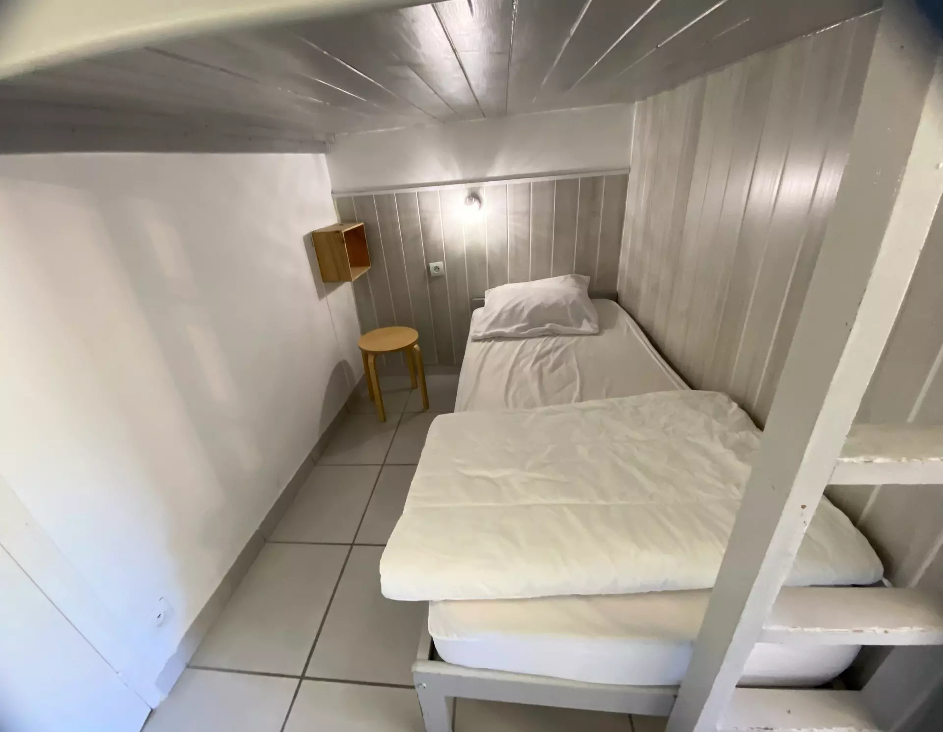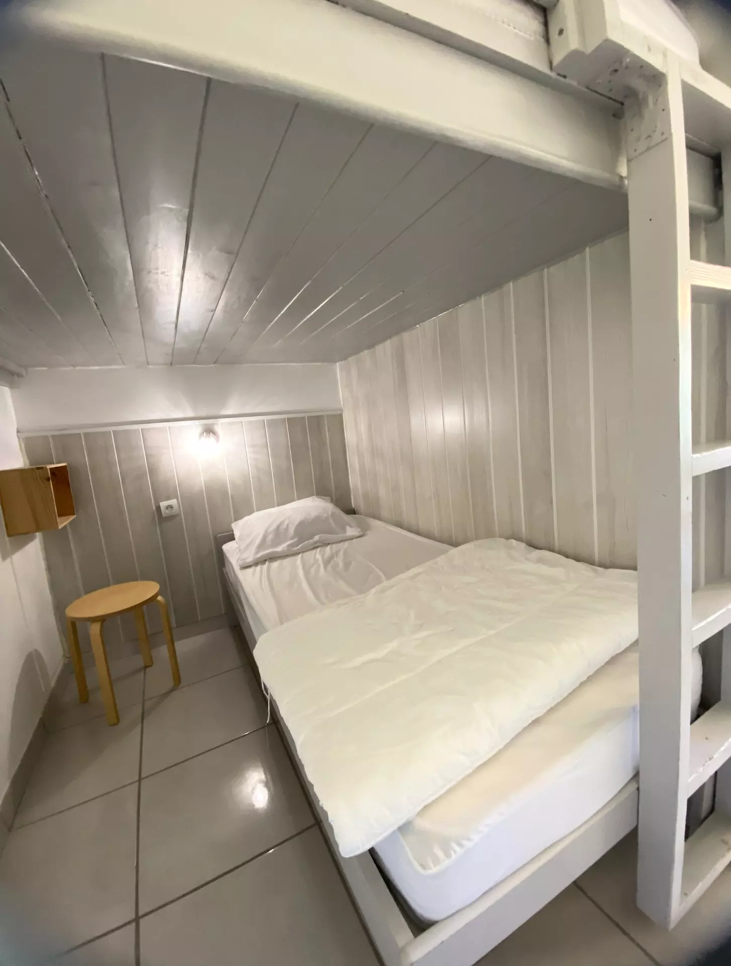 1 Schlafsofa, Trennwand mit 2 Etagenbetten (1 Doppelbett, 1 Einzelbett). Duschraum mit Dusche und WC.