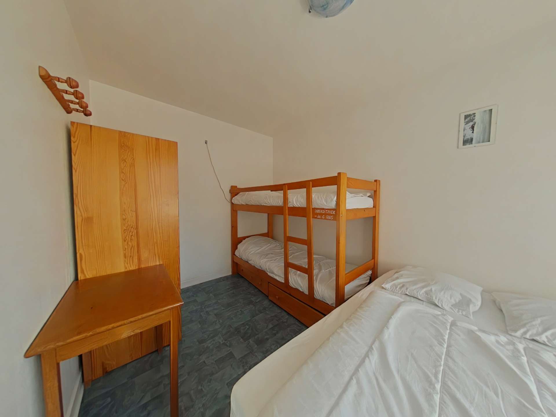 Diese Ferienwohnung im Erdgeschoss verfügt über ein Wohnzimmer mit Doppelschlafcouch und Fernseher, einen Küchenbereich mit Geschirrspüler, ein Schlafzimmer mit 1 Doppelbett und 2 Etagenbetten, ein Badezimmer mit Waschmaschine, Bettwäsche und ein separates WC.