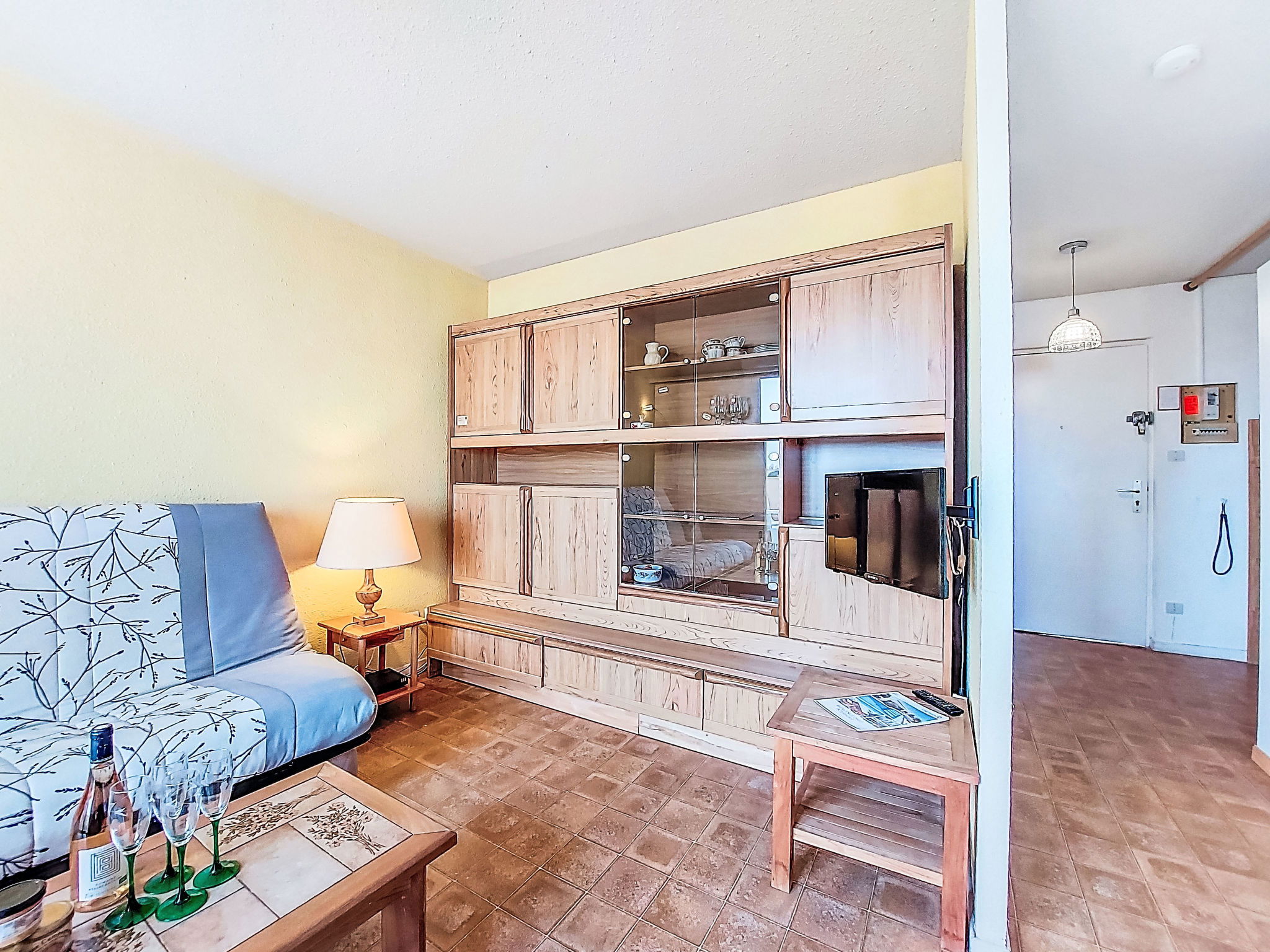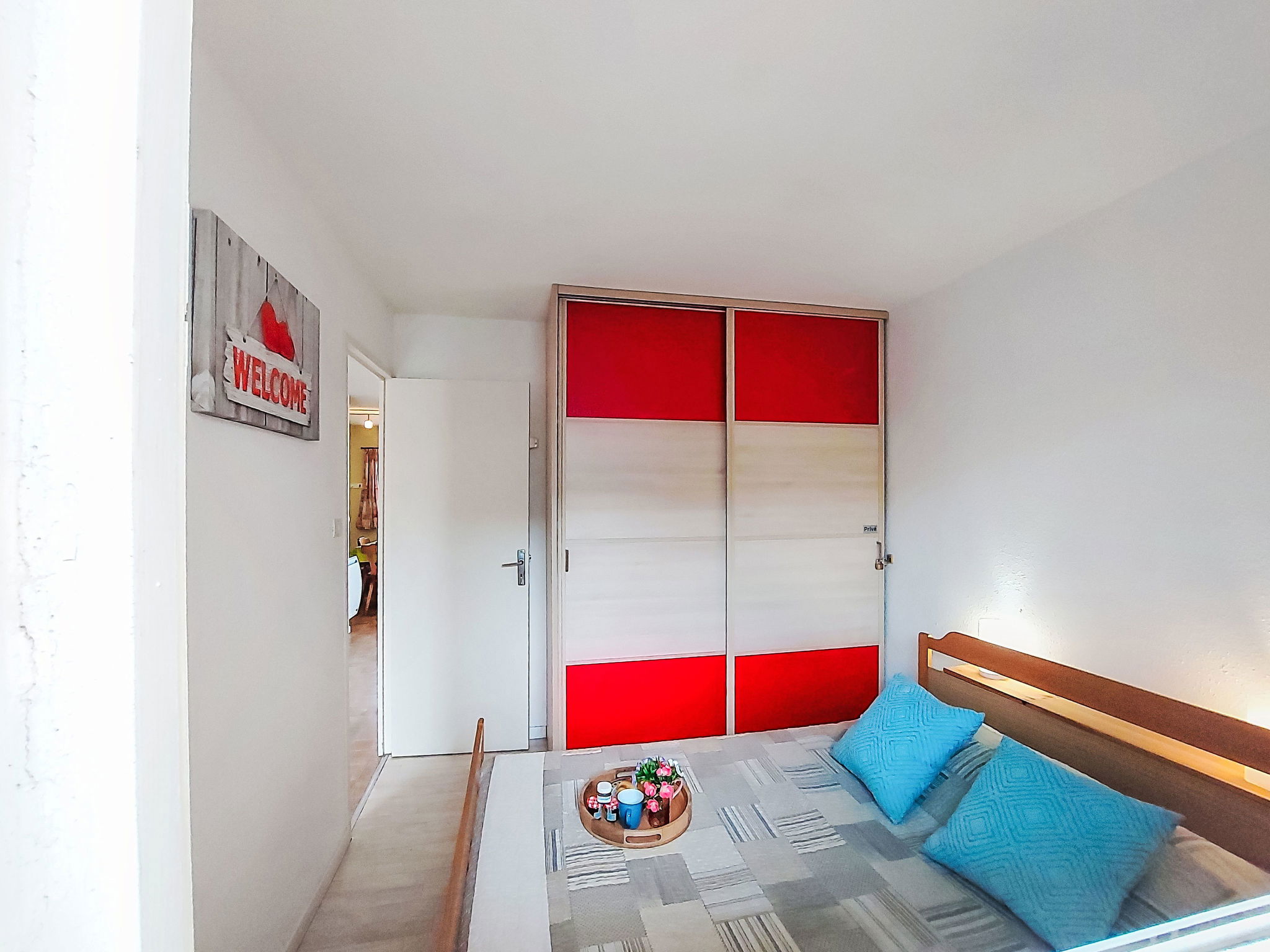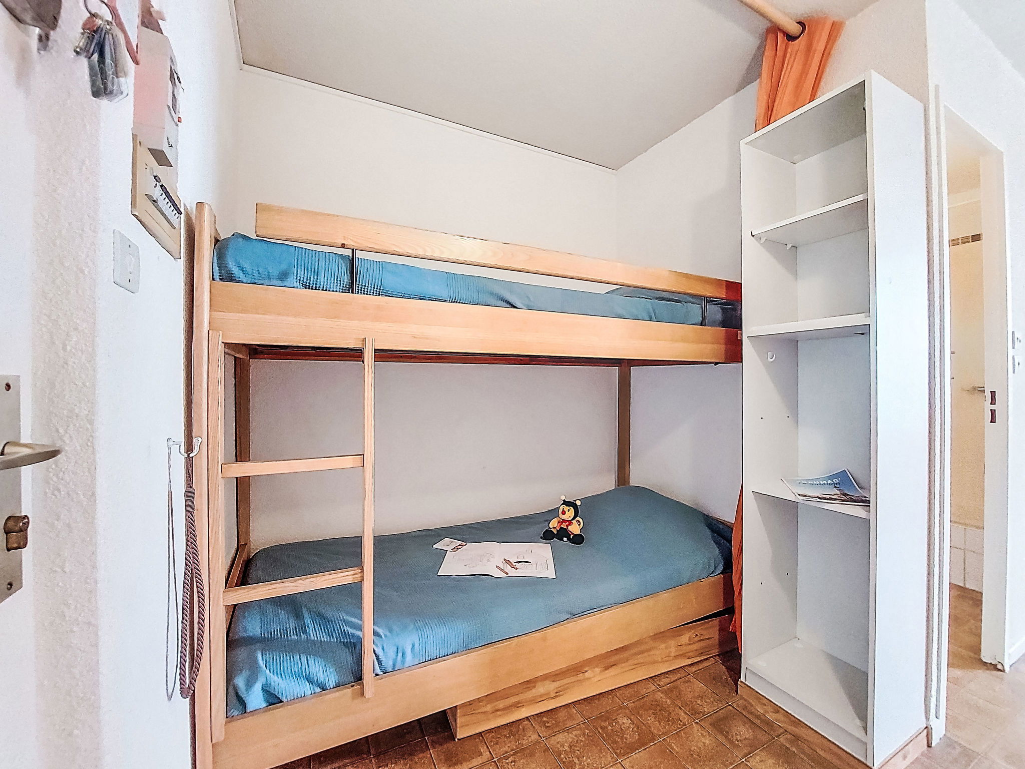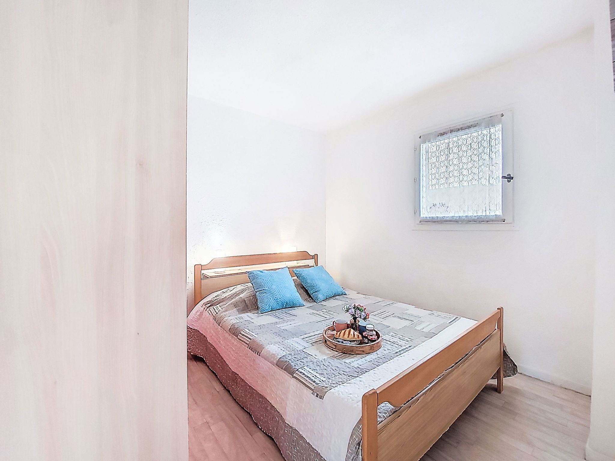 2-Zimmer-Wohnung 30 m2 im 4. Stock. Wohn-/Esszimmer mit TV. 1 Zimmer mit 1 franz. Bett (140 cm, Länge 190 cm). Eingang mit 1 x 2 Etagenbetten (80 cm, Länge 185 cm). Kochnische (3 Glaskeramikplatten, Kombinationsmikrowelle). Dusche/WC. Terrasse 4 m2, Ostlage. Terrassenmöbel. Zur Verfügung: Internet (WLAN, extra). Parkplatz. Bitte beachten: Parkplatz nur für kleine Wagen. Maximal 1 Haustier/Hund erlaubt. Rauchmelder. 30133000849 6C