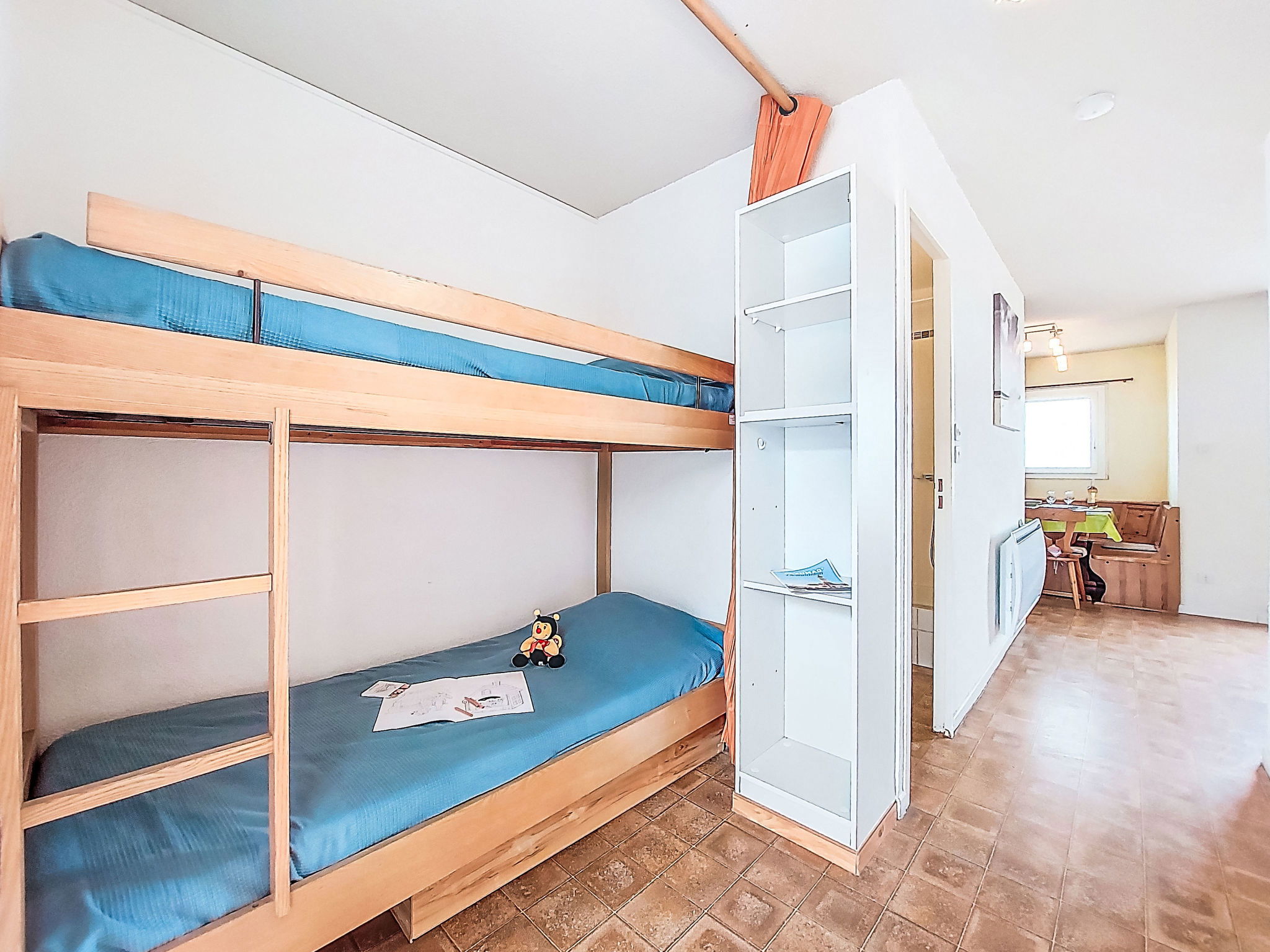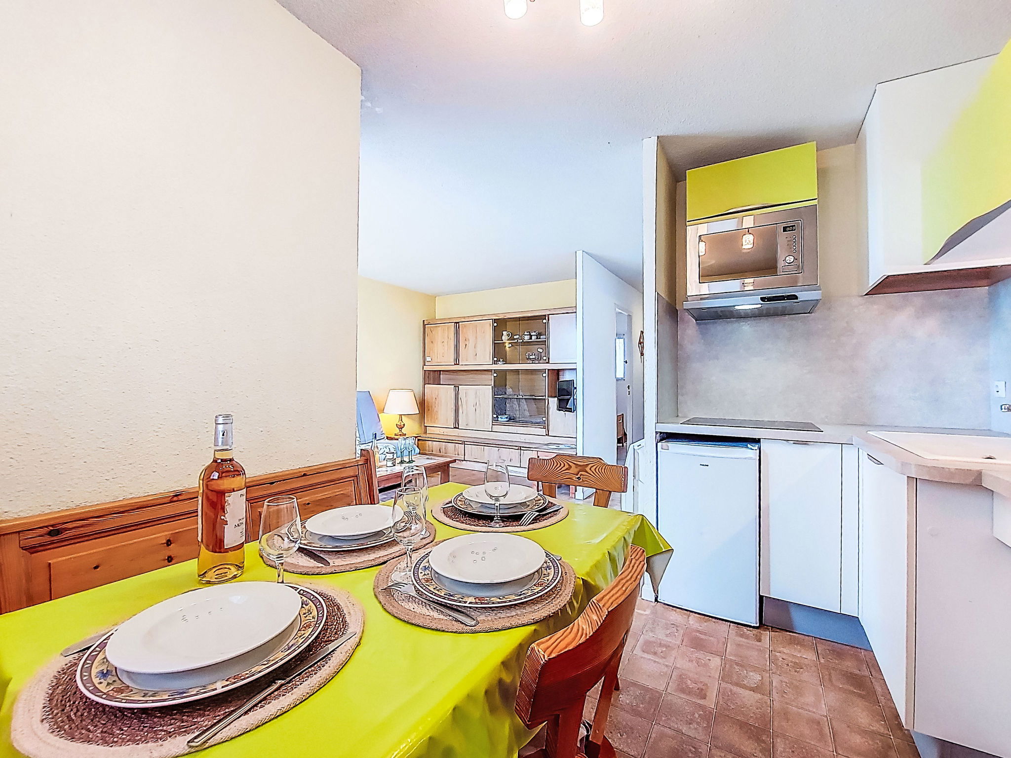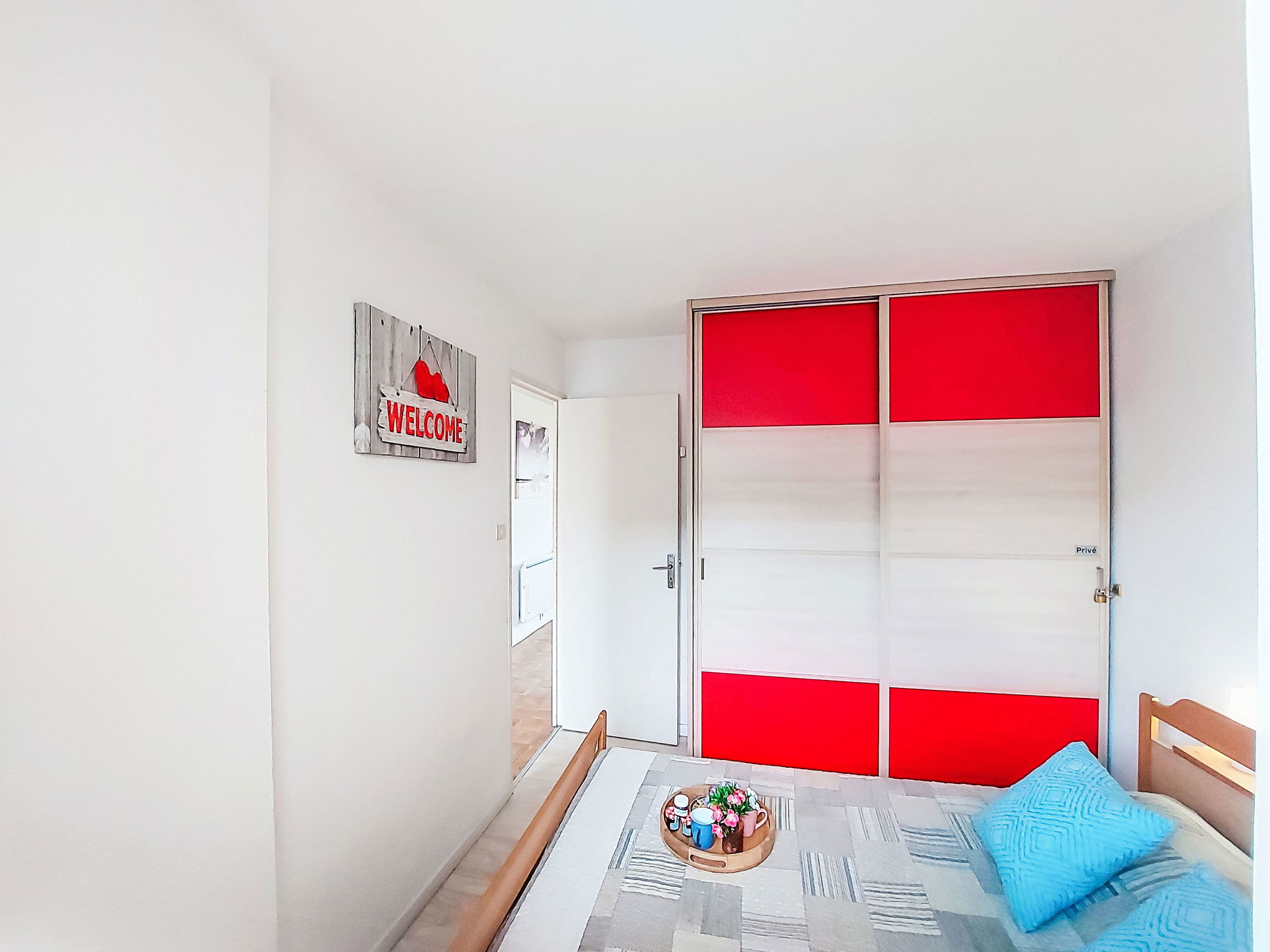 2-Zimmer-Wohnung 30 m2 im 4. Stock. Wohn-/Esszimmer mit TV. 1 Zimmer mit 1 franz. Bett (140 cm, Länge 190 cm). Eingang mit 1 x 2 Etagenbetten (80 cm, Länge 185 cm). Kochnische (3 Glaskeramikplatten, Kombinationsmikrowelle). Dusche/WC. Terrasse 4 m2, Ostlage. Terrassenmöbel. Zur Verfügung: Internet (WLAN, extra). Parkplatz. Bitte beachten: Parkplatz nur für kleine Wagen. Maximal 1 Haustier/Hund erlaubt. Rauchmelder. 30133000849 6C