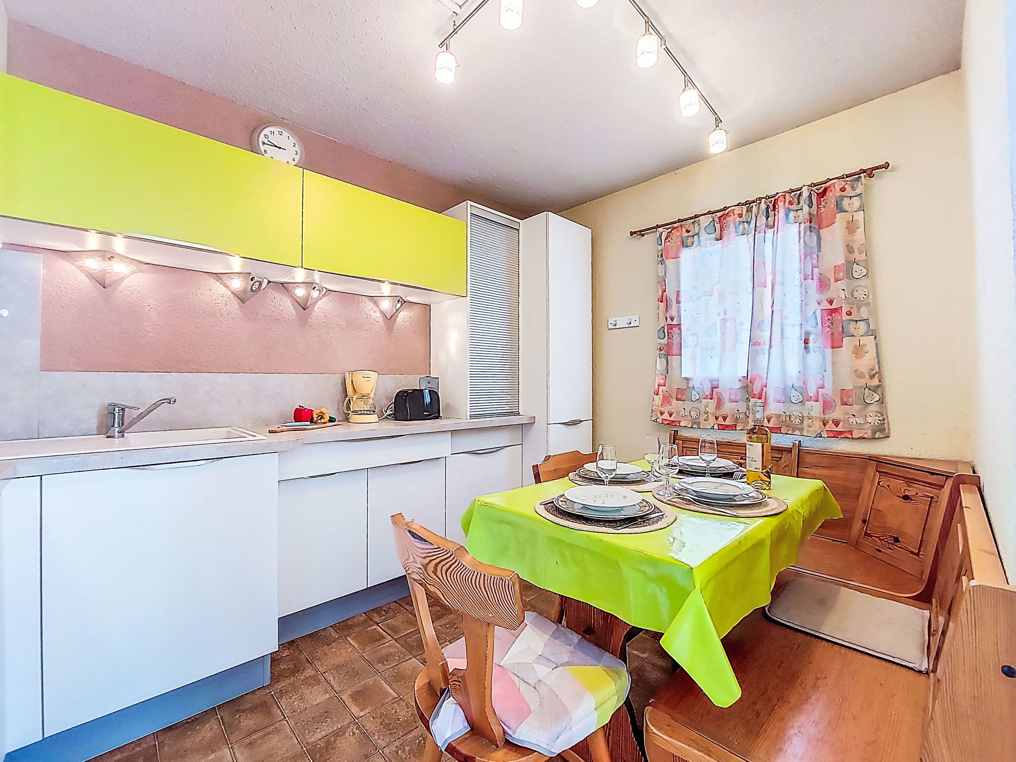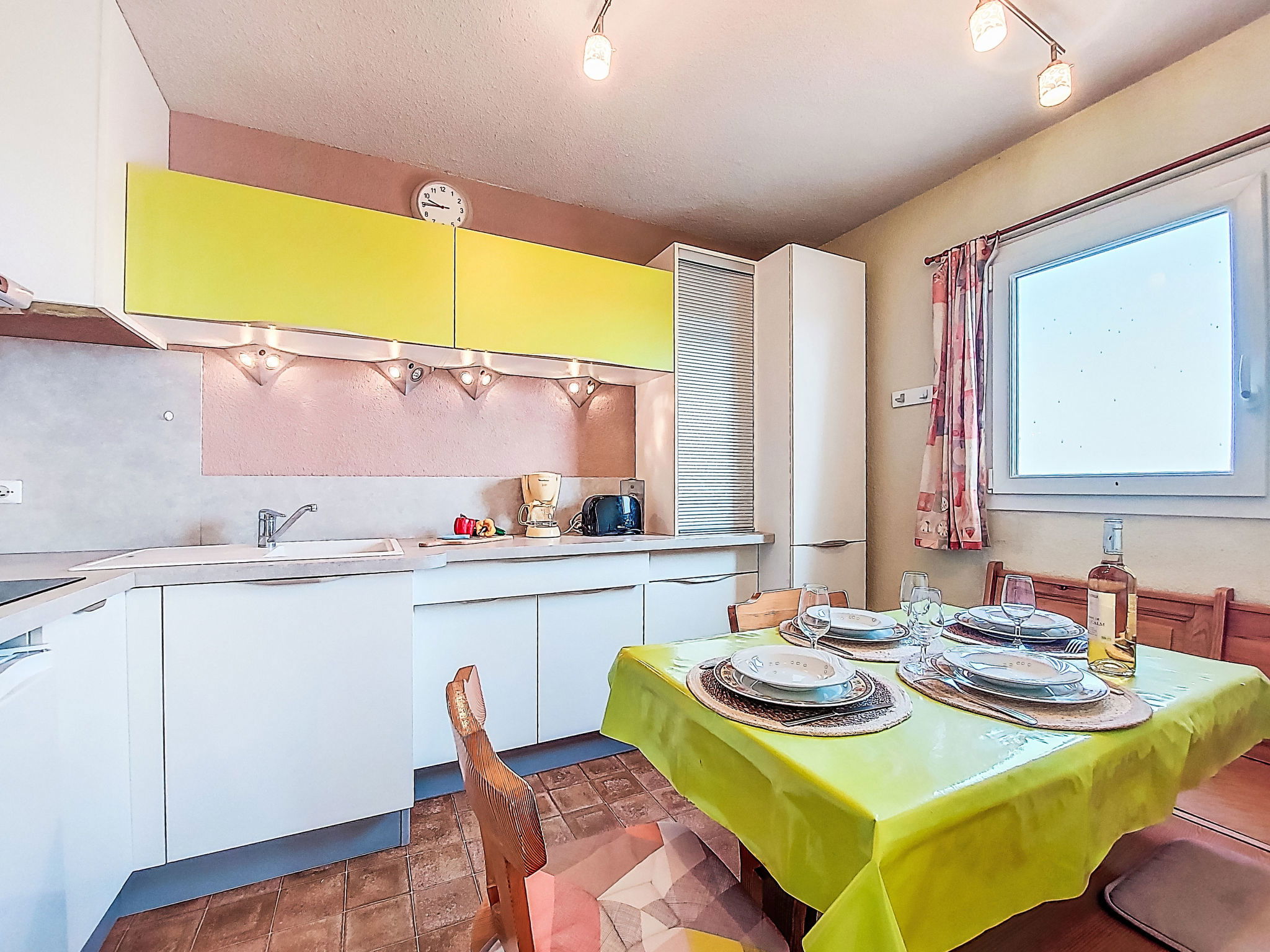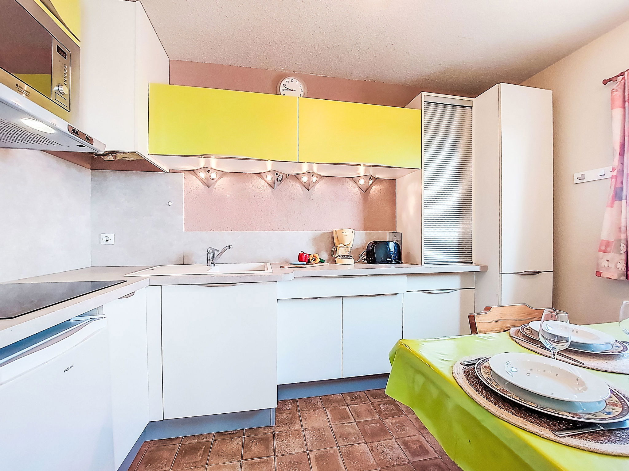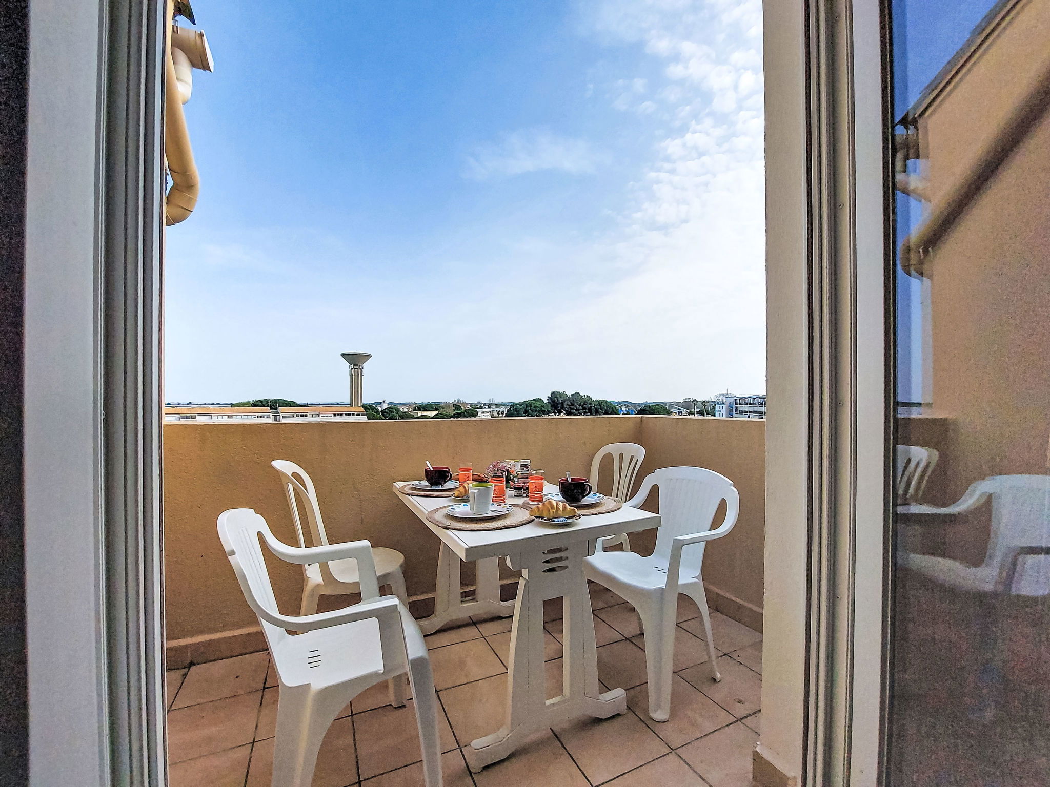 2-Zimmer-Wohnung 30 m2 im 4. Stock. Wohn-/Esszimmer mit TV. 1 Zimmer mit 1 franz. Bett (140 cm, Länge 190 cm). Eingang mit 1 x 2 Etagenbetten (80 cm, Länge 185 cm). Kochnische (3 Glaskeramikplatten, Kombinationsmikrowelle). Dusche/WC. Terrasse 4 m2, Ostlage. Terrassenmöbel. Zur Verfügung: Internet (WLAN, extra). Parkplatz. Bitte beachten: Parkplatz nur für kleine Wagen. Maximal 1 Haustier/Hund erlaubt. Rauchmelder. 30133000849 6C