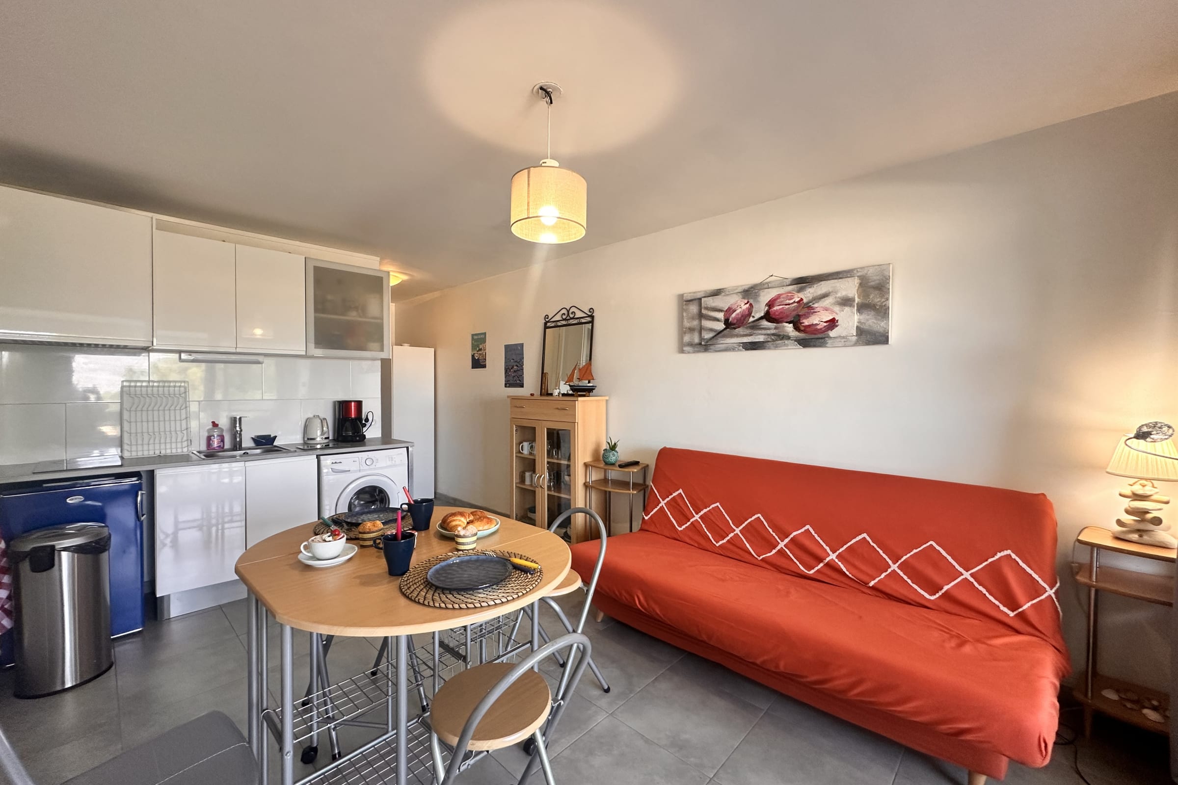Die Wohnung liegt im 2. Stock ohne Aufzug und profitiert somit von einer zentralen Lage und bietet gleichzeitig eine ruhige Umgebung. Es besteht aus einem Kabineneingang mit Etagenbett, ideal für Kinder, einem hellen Wohnzimmer mit offener Küchenzeile und einem großen Balkon, auf dem Sie Ihre Mahlzeiten im Freien genießen können. Ein Duschbad mit WC rundet die Unterkunft ab.