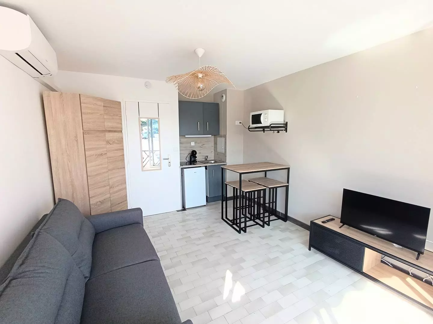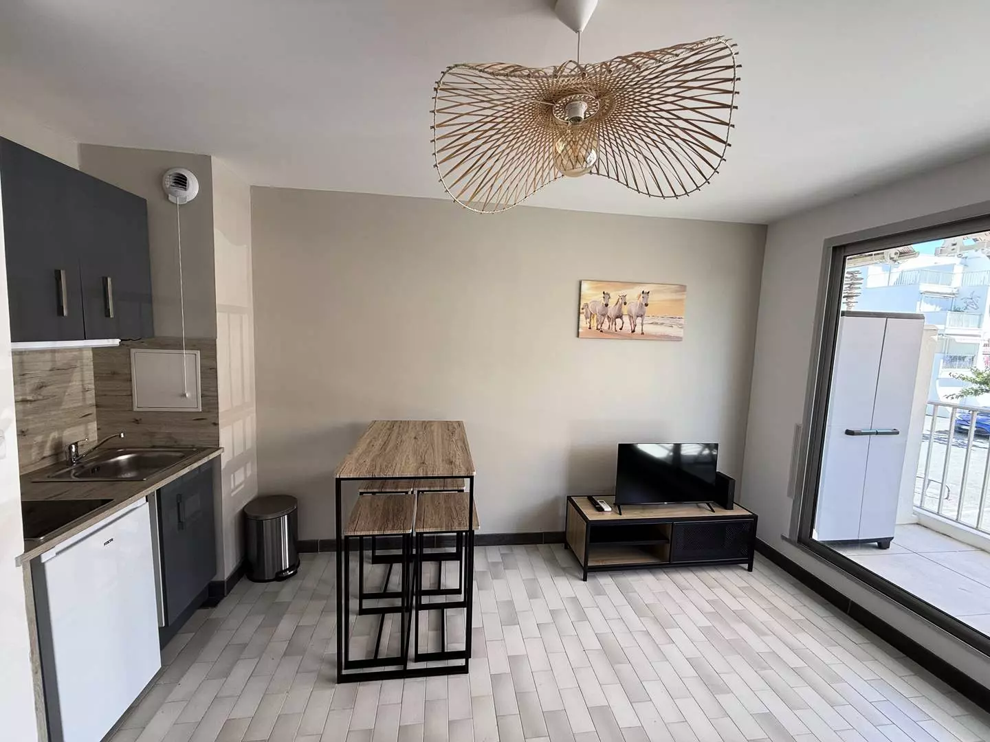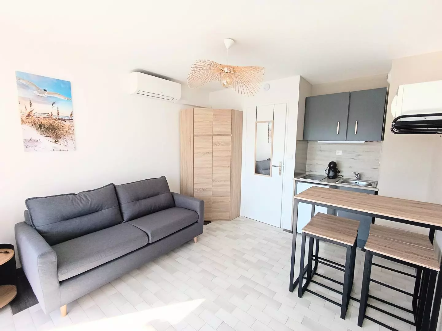 PORT CAMARGUE – SÜDSTRAND – In einer ruhigen, sicheren Wohnanlage mit privatem, nummeriertem Parkplatz. Dieses 18 m² große Studio-Apartment mit Schlafnische und 10 m² großer Terrasse bietet ein Wohnzimmer mit 140 cm langem Schlafsofa, TV und Klimaanlage; eine offene, voll ausgestattete Küche (Kühlschrank mit Gefrierfach, Mikrowelle, Kochfeld, Filterkaffeemaschine); eine Schlafnische mit einem 90 cm langen Etagenbett; und ein Duschbad mit WC. Nur 600 m vom Strand entfernt, in der Nähe der Geschäfte von Plage Sud und des Thalassotherapiezentrums. Möbliert und ausgestattet für 4 Personen. Haustiere erlaubt.