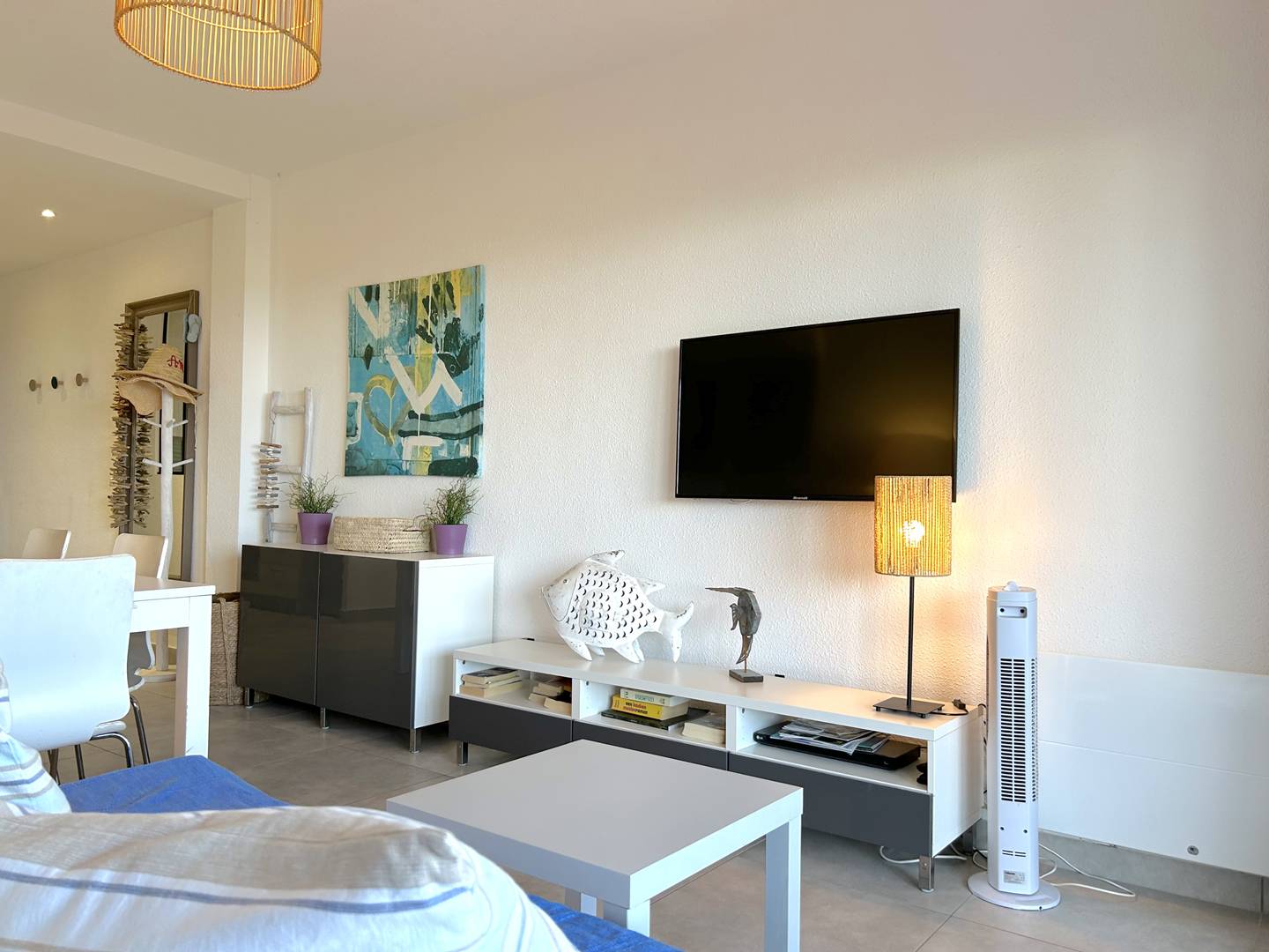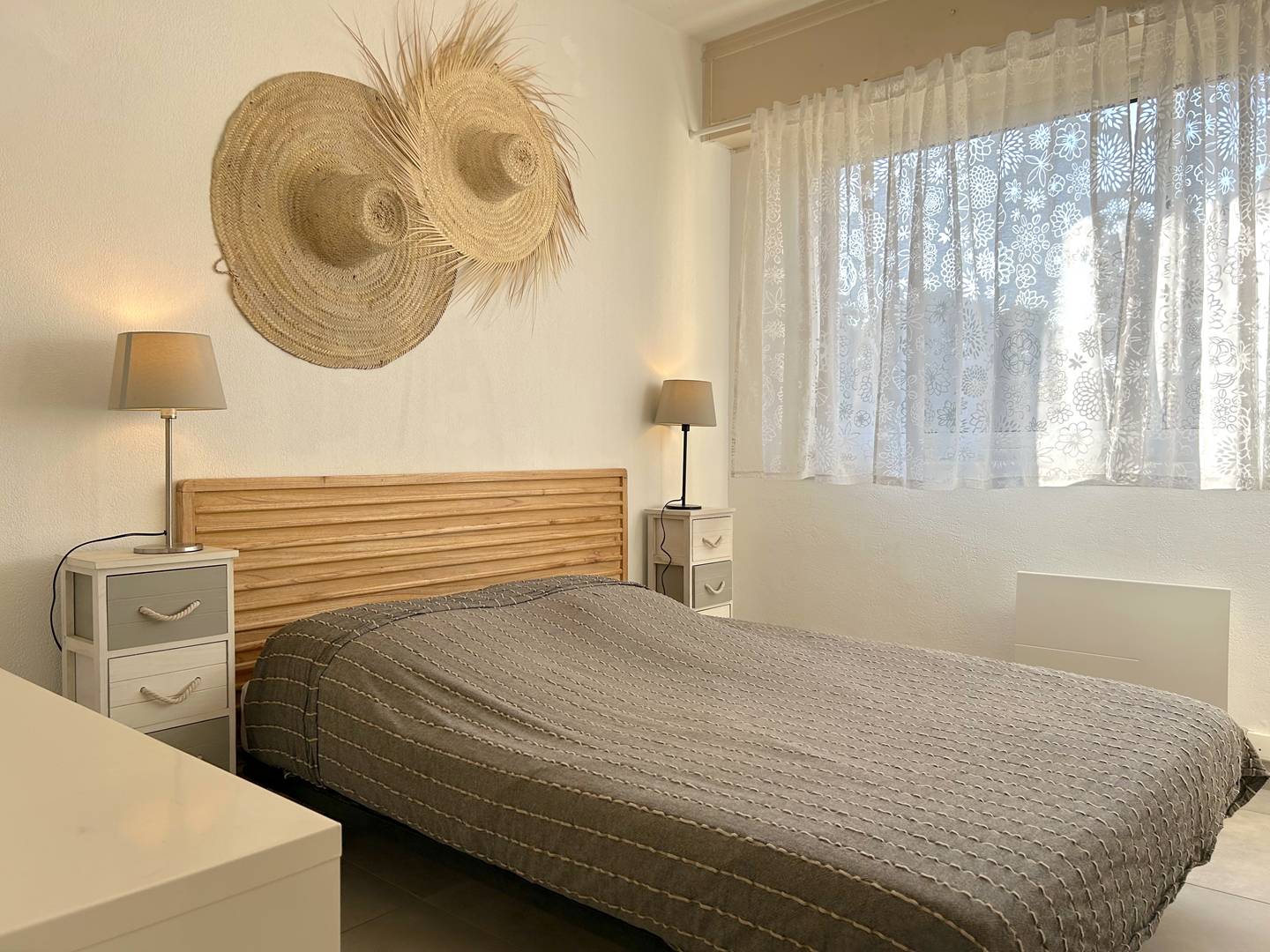 Diese renovierte Mietwohnung im Erdgeschoss besteht aus einer Doppelterrasse mit kleinem Meerblick, einem Wohnzimmer mit einem 160 cm breiten Schlafsofa, einem Schlafzimmer mit einem 140 cm breiten Bett, einem Schlafzimmer mit zwei Einzelbetten, einer Einbauküche, einem Duschraum und einer separaten Toilette.