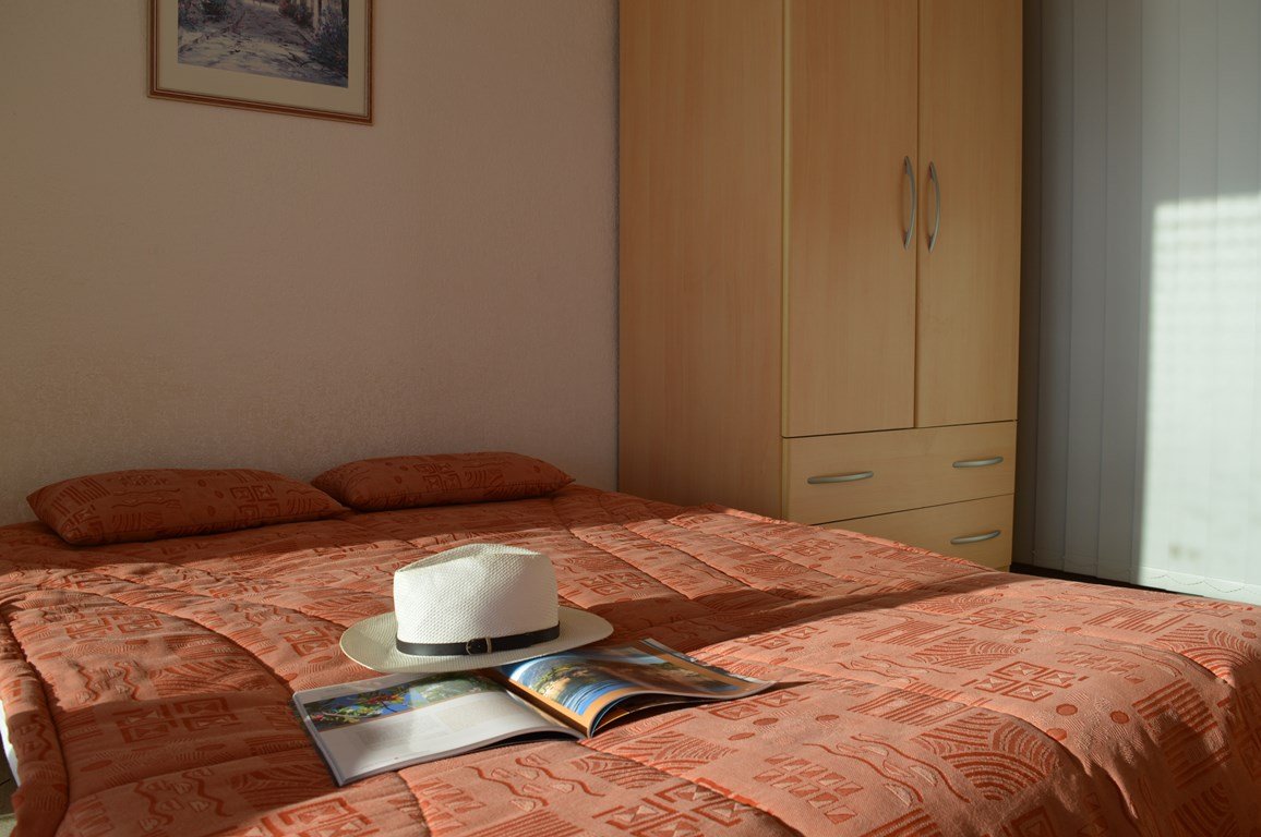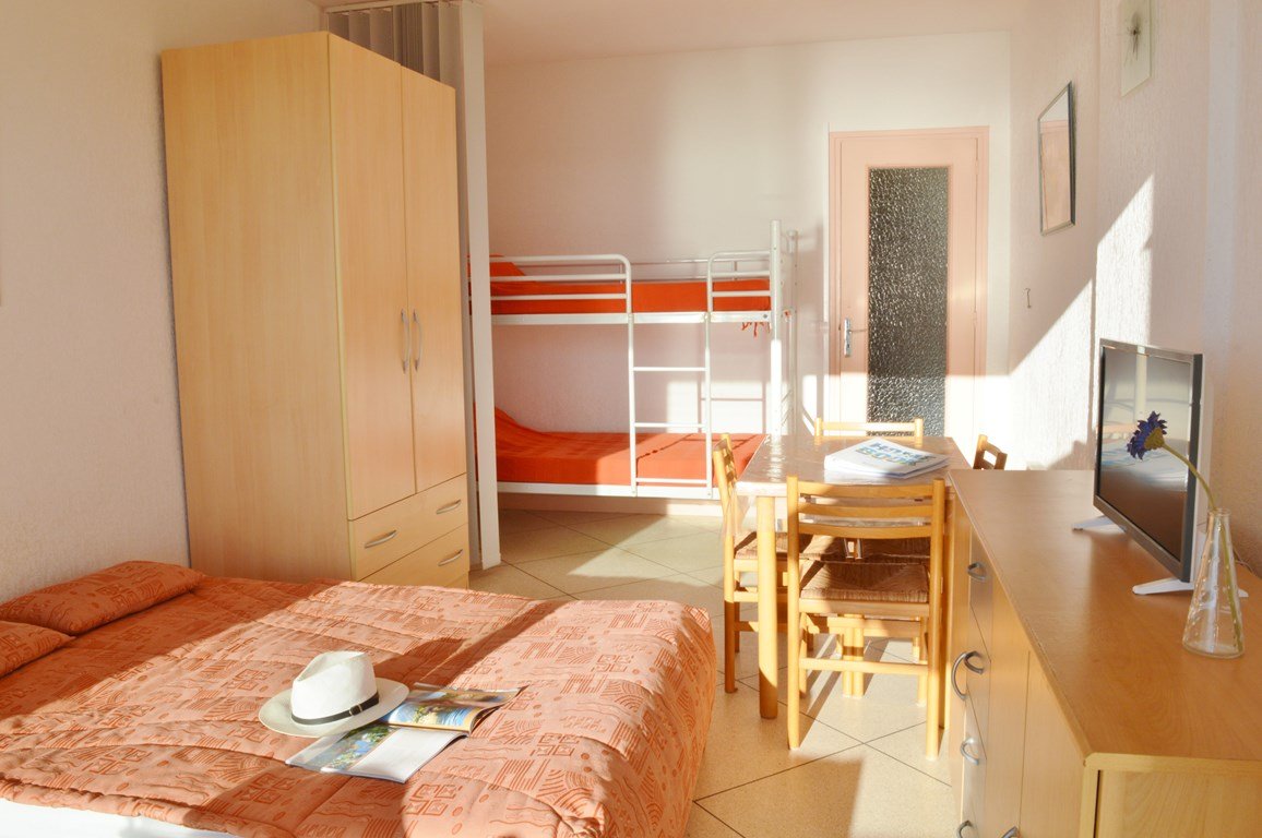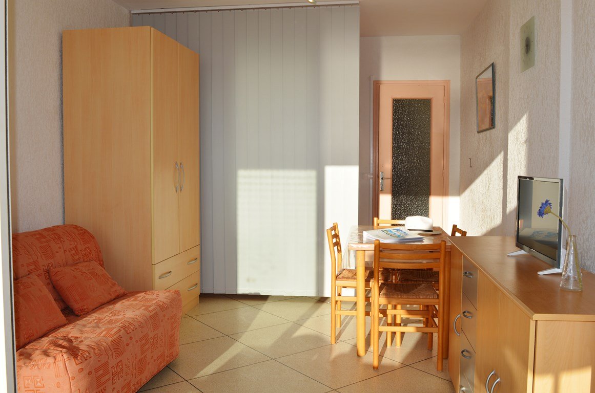Panoramablick auf das Meer von diesem charmanten Studio am Strand. Es besteht aus einem nach Osten ausgerichteten Wohnzimmer mit einem Schlafsofa und Etagenbetten, einer separaten Küche sowie einem Duschbad und WC.