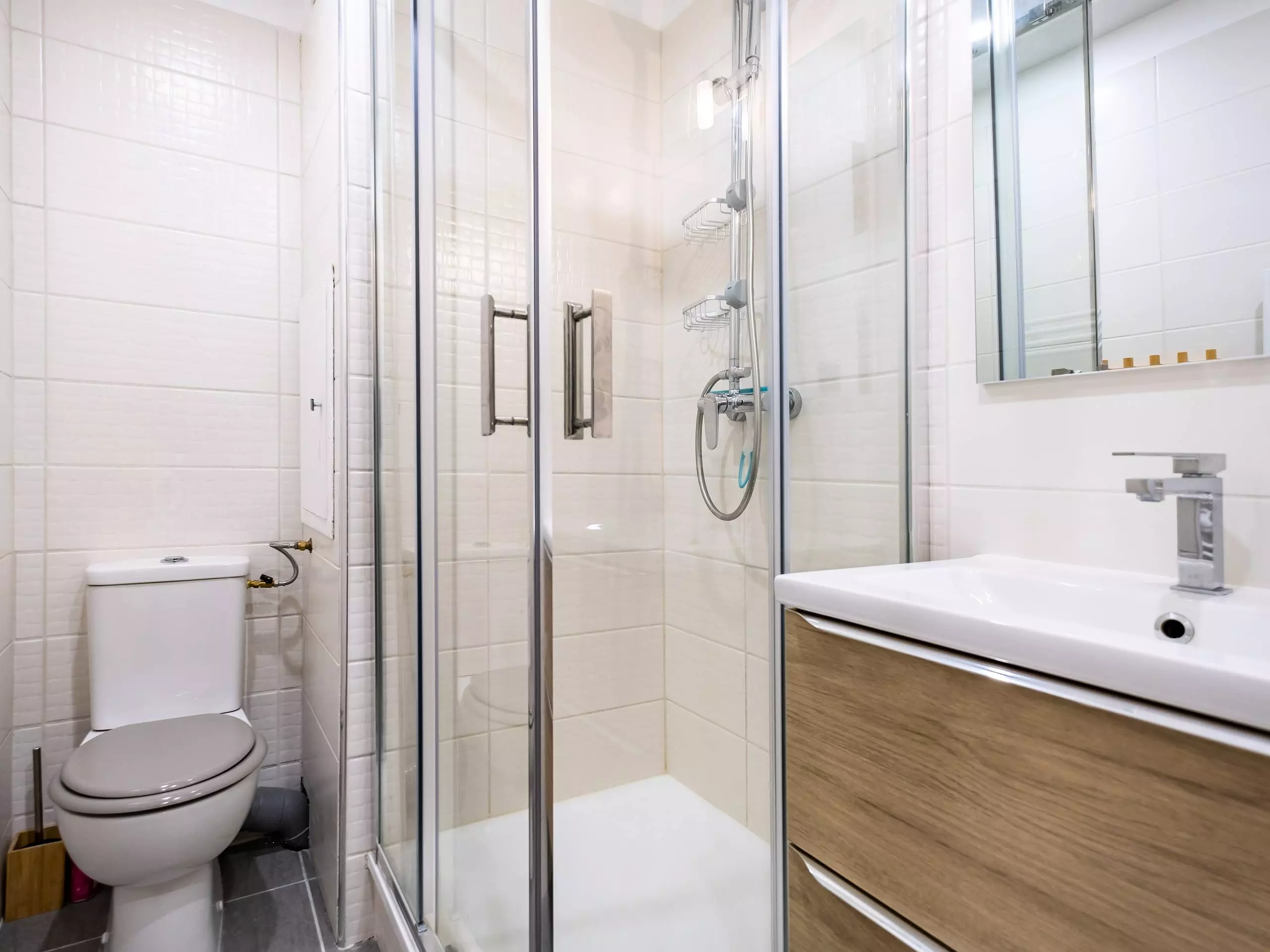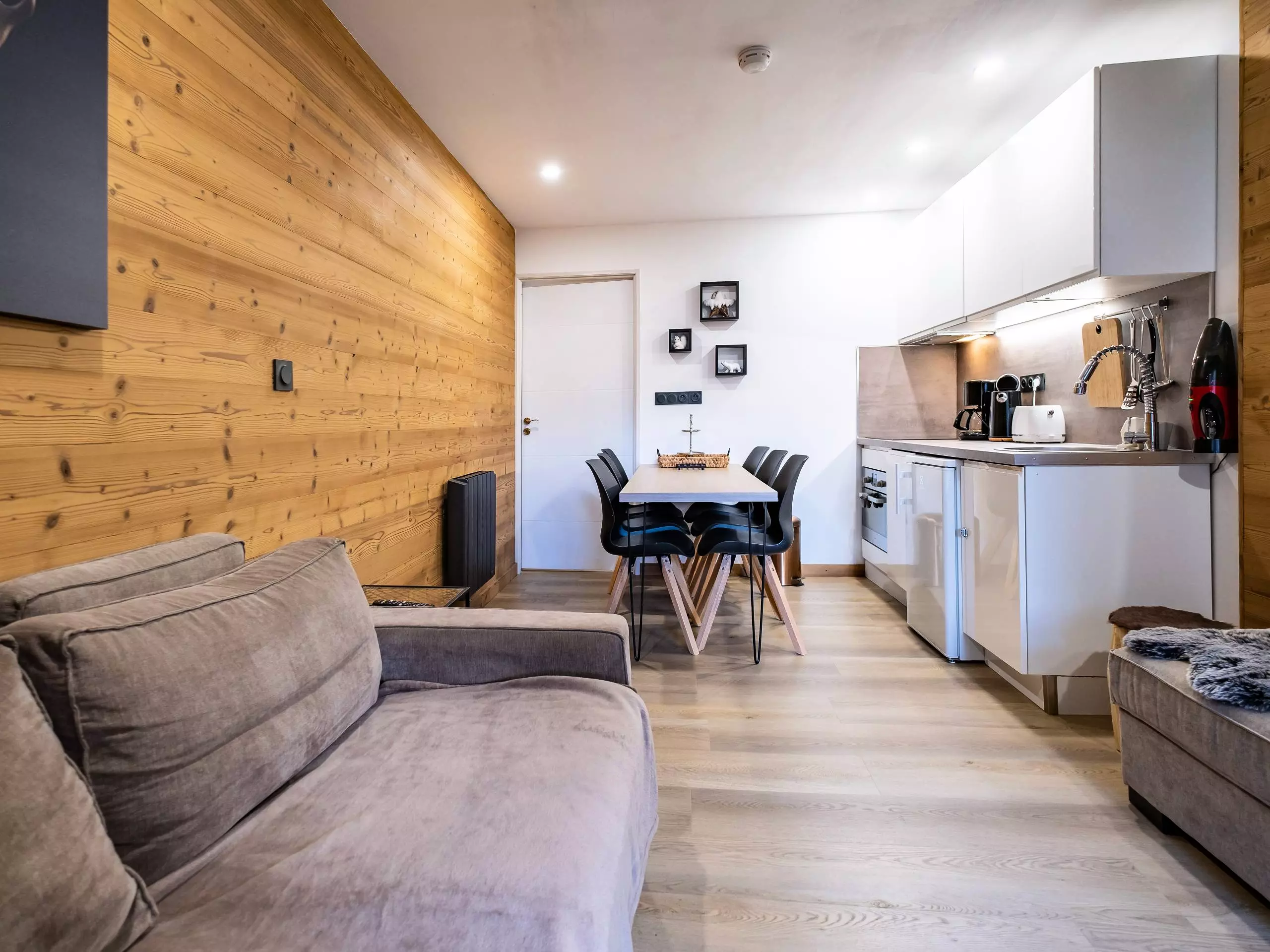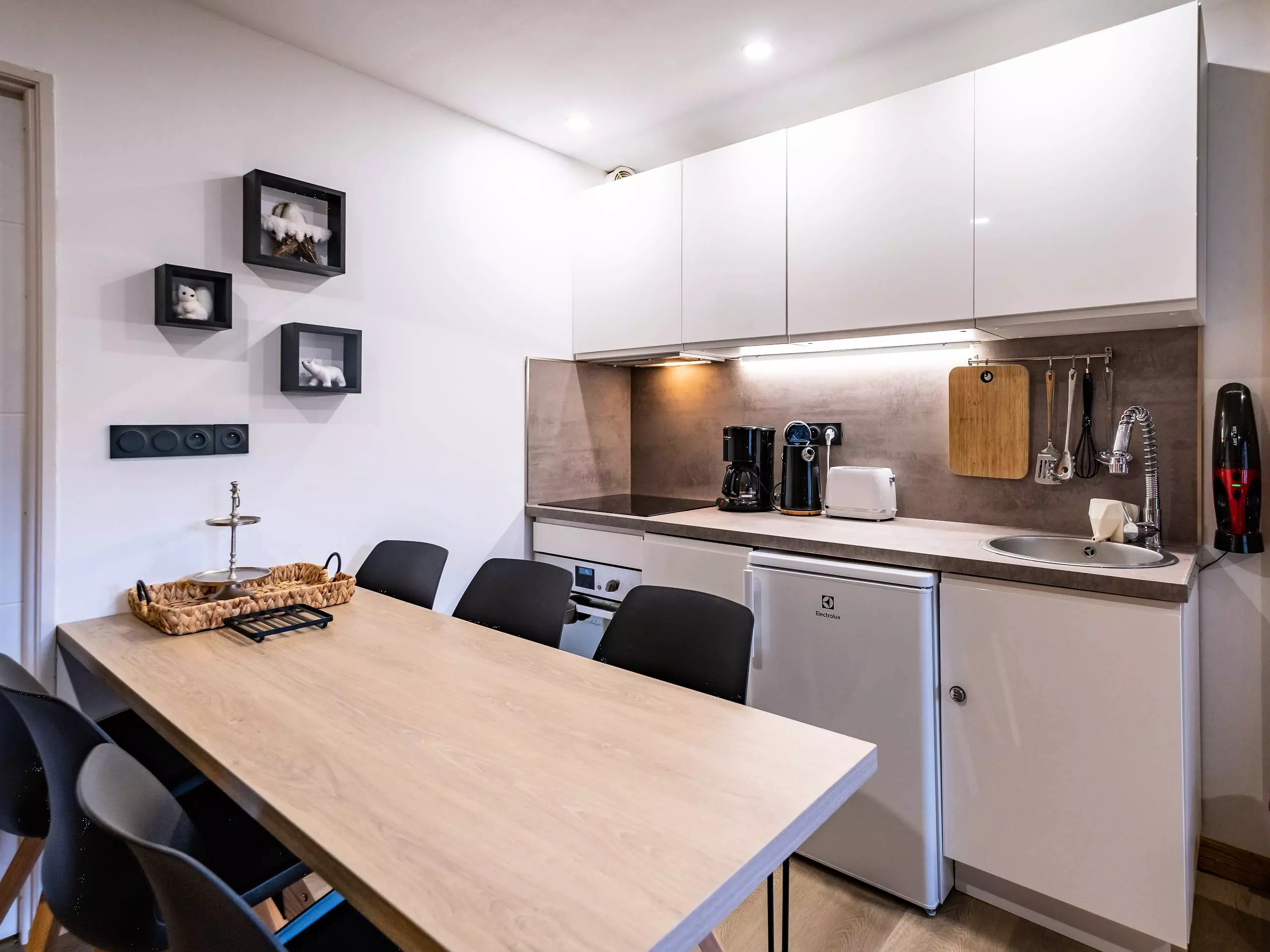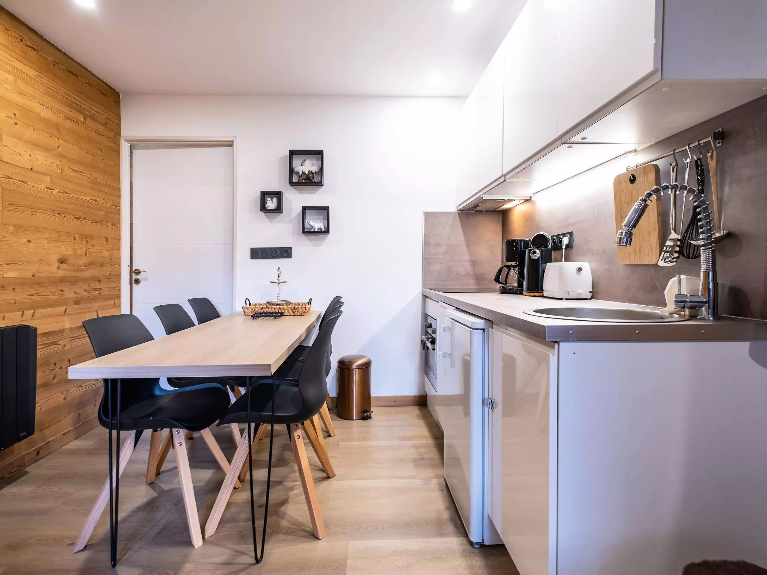 Ein Schlafzimmer mit Doppelbett (140x200), viel Stauraum. Eine Bergecke (Zimmer ohne Fenster) mit Etagenbetten (90x200), viel Stauraum und Flachbildfernseher. Duschraum mit Dusche, Toilette, Waschbecken und Handtuchtrockner. Küche im Wohnzimmer mit 4 Induktionskochfeldern, Geschirrspüler, Kombi-Mikrowelle, Kühlschrank, Nespresso- und herkömmlicher Kaffeemaschine, Wasserkocher, Toaster, Dunstabzugshaube. Balkon mit Tisch und Stühlen. Kostenloser privater WLAN-Zugang. Skiraum und Aufzug in der Residenz. Etage -2. Nichtraucherwohnung / Haustiere erlaubt
