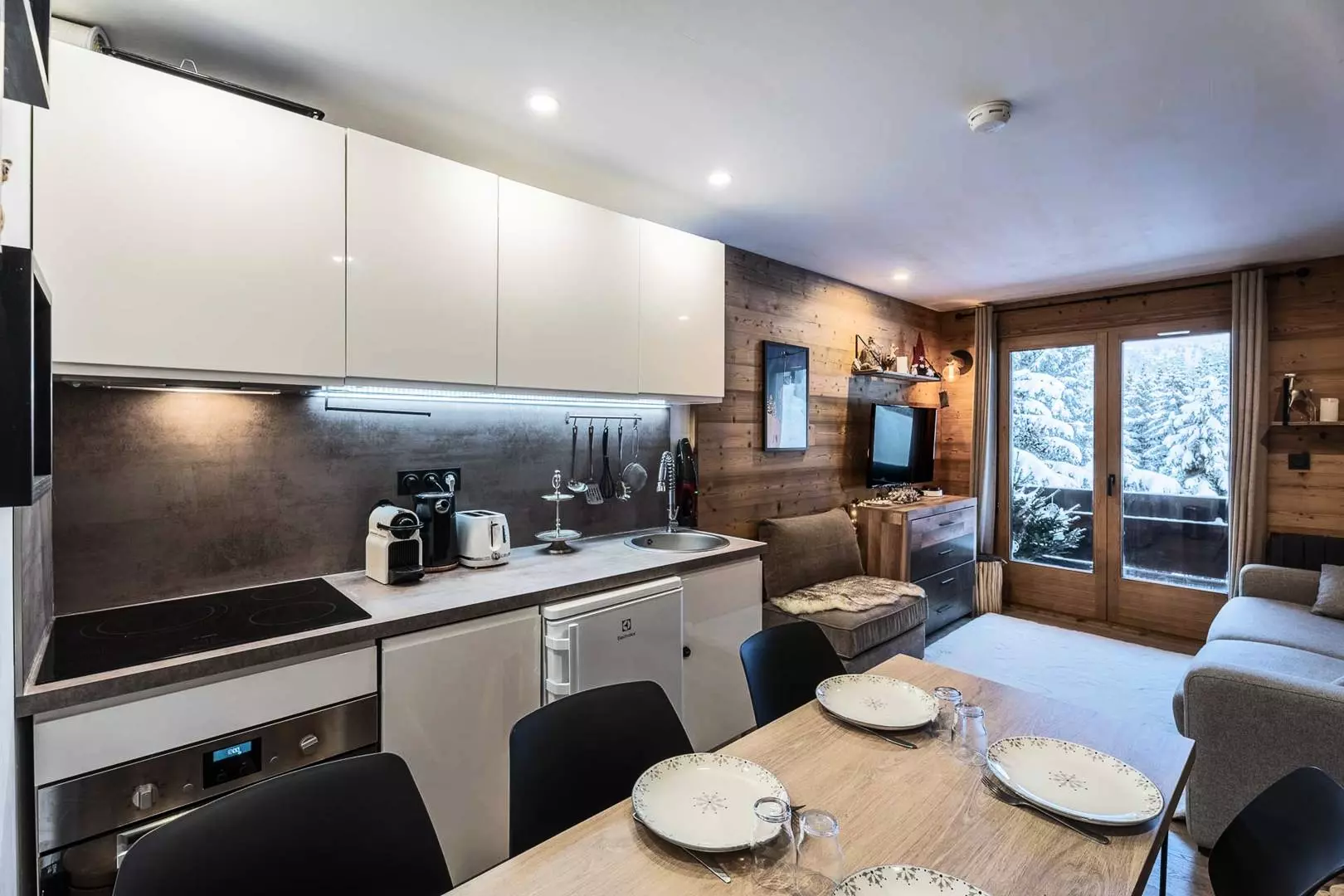 DIE RESIDENZ: Die Residenz Erines liegt zwischen dem Hameau und dem Zentrum des Ferienortes Méribel Mottaret, ist sehr ruhig, sehr gut gelegen, nur wenige Meter von den Pisten entfernt und nach Süden ausgerichtet mit Blick auf die Pisten und den Mont Vallon.