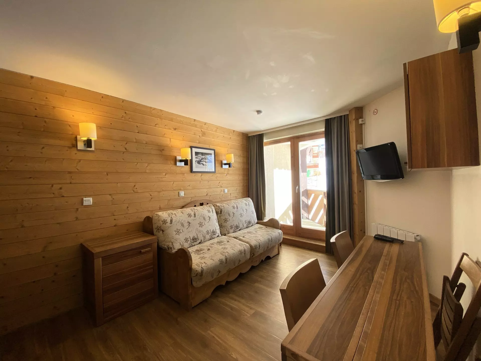 Es verfügt über ein kleines Schlafzimmer (mit Tür und Fenster zum Flur der Residenz) mit zwei Etagenbetten und einem kleinen Einzelbett, ein Wohnzimmer mit ausgestatteter Küche (Geschirrspüler, Mikrowelle, Kühlschrank und Elektroherd), einem Schlafsofa (Doppelmatratze), einem Essbereich, einem nach Südosten ausgerichteten Balkon mit Blick auf die Pisten, einem Badezimmer und einer separaten Toilette.