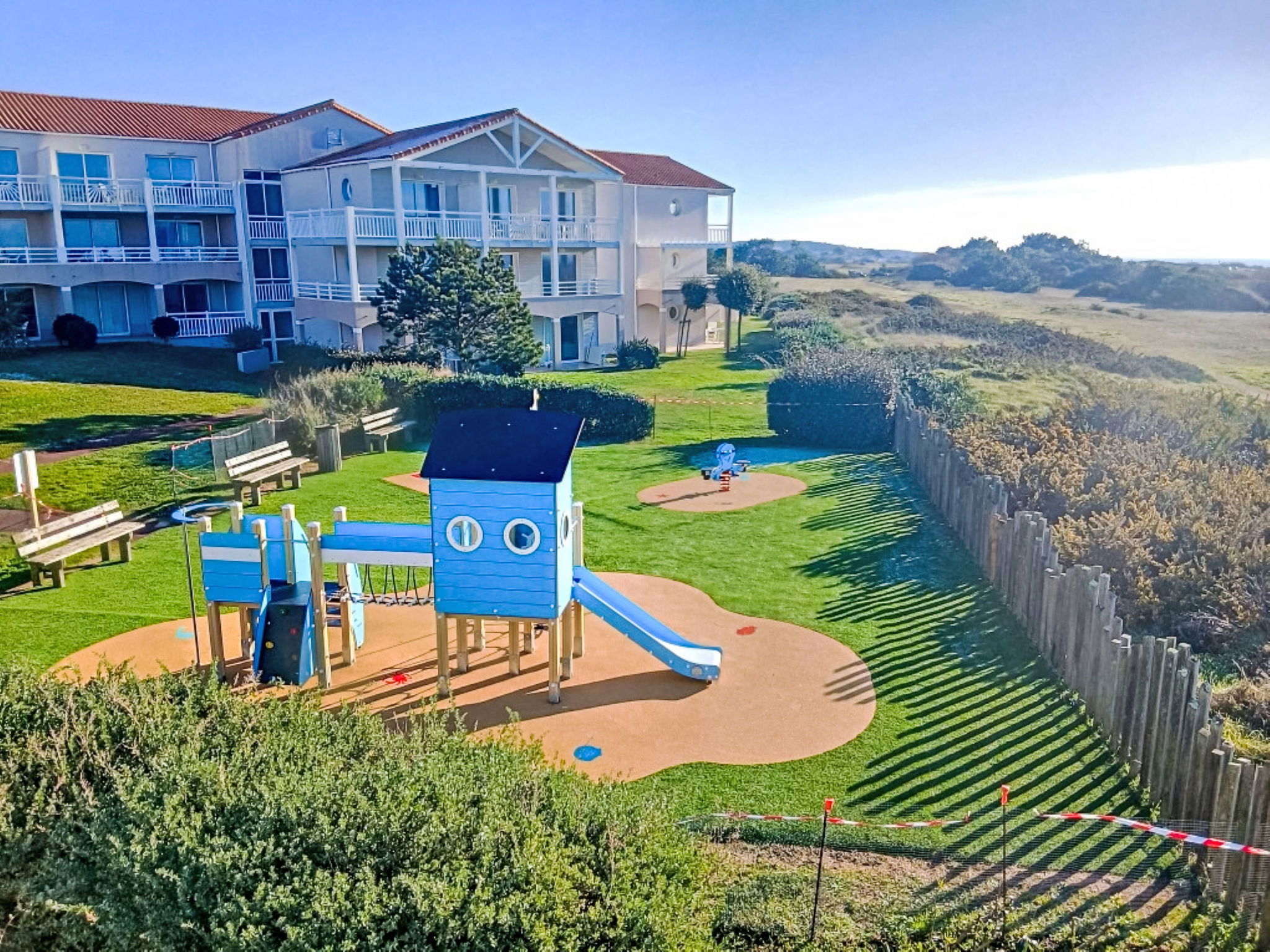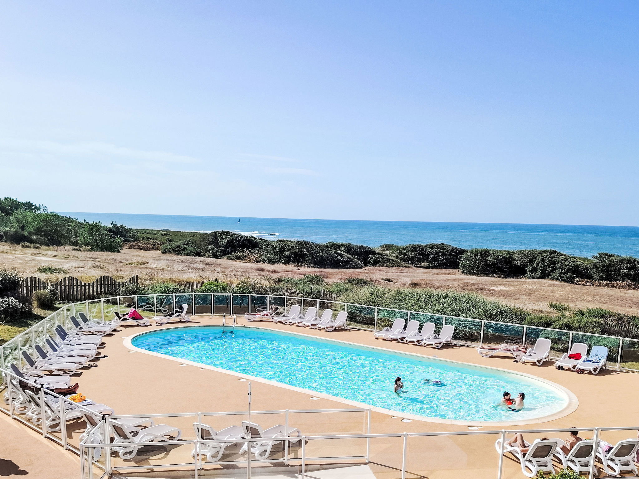 Schöne Residenz. Im Ortsteil La Corniche-Château d'Olonne, 4 km vom Zentrum von Sables d'Olonne, 200 m vom Meer, 1.4 km vom Strand. Zur Mitbenutzung: Grundstück mit Rasen und Pflanzen, wunderschöner Garten zum Entspannen, 2 Schwimmbäder beheizt (12 x 5 m, 150 cm tief, saisonale Verfügbarkeit: 01.Mai. - 30.Sep.). Tischtennis, Boccia, Kinderspielplatz. In der Anlage: Empfang, Waschmaschine (zur Mitbenutzung, extra). Parkplatz. Lebensmittelgeschäft 300 m, Einkaufszentrum 2 km, Bushaltestelle 300 m, Bahnstation "Les Sables Olonne" 4.5 km, Sandstrand "Plage du Tanchet" 1.4 km, Thermalbad "Thalassothérapie" 2 km. Sporthafen 5 km, Surfschule 1.4 km, Radweg 200 m. Nahe gelegene Sehenswürdigkeiten: St Gilles Croix de Vie 30 km, Noirmoutier 65 km, Le Puy du Fou 80 km, Nantes 95 km, La Rochelle 100 km. Wandergebiete: GR8 200 m. Die Residenz wird durch elektrische Tore geschlossen.