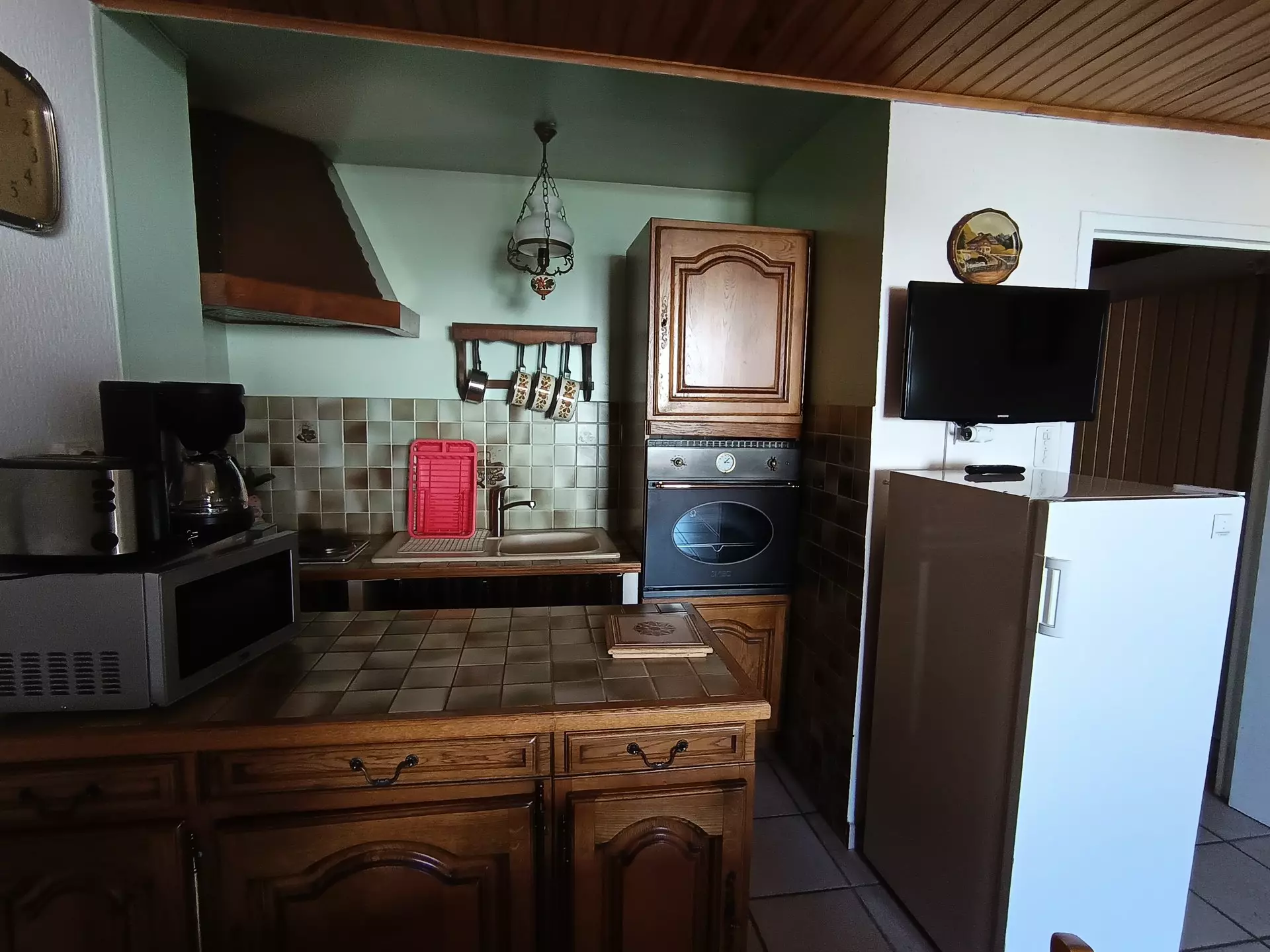 Küchenbereich: 2 E-Kochplatten, Backofen, Mikrowelle, Kühlschrank, Dunstabzugshaube, Kaffeemaschine, Toaster, Wasserkocher.