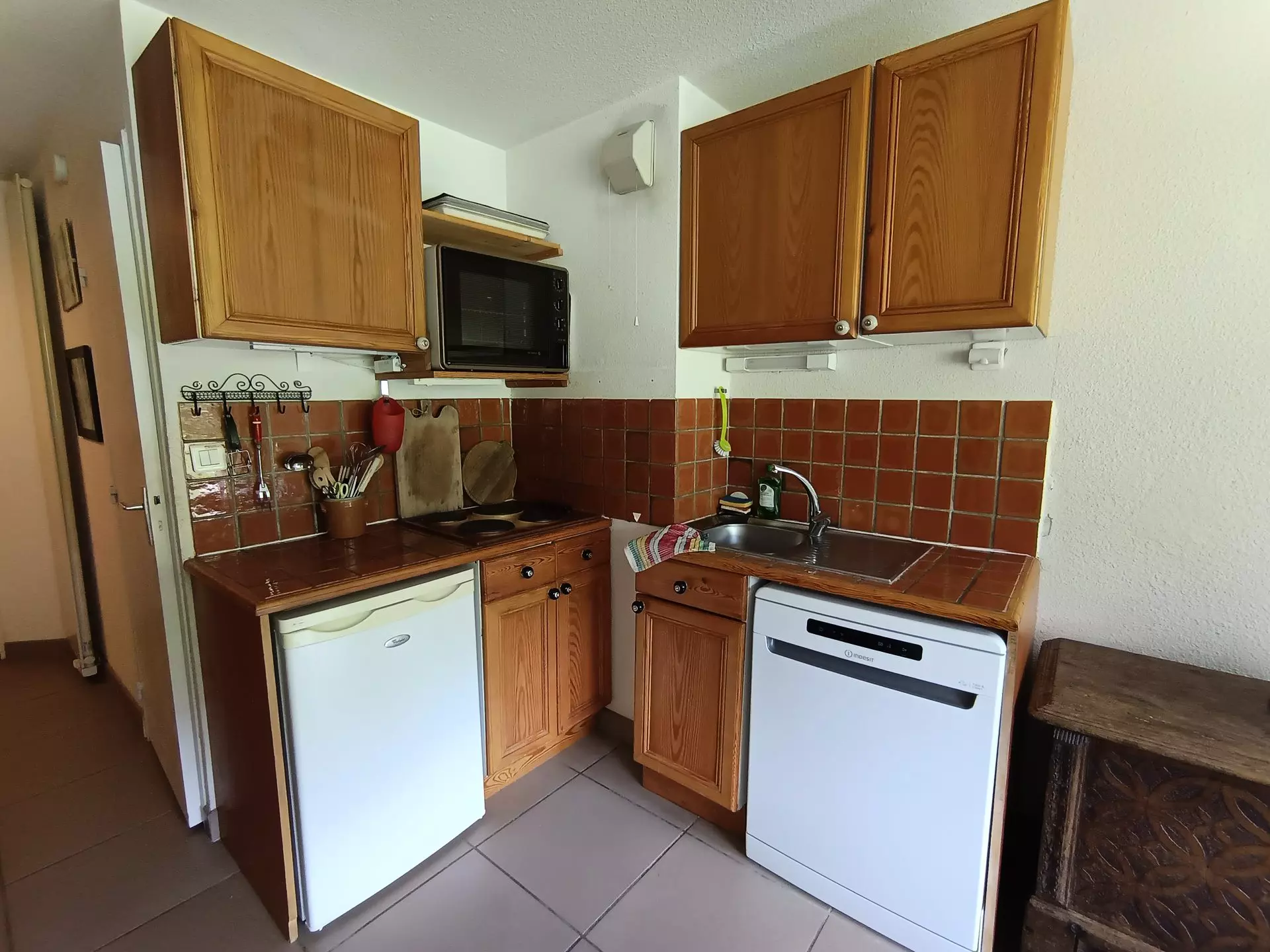 Küchenbereich: Top-Kühlschrank (ohne Gefrierfach, da keine Gefrierfachtür vorhanden), 4 Elektrokochplatten, kleiner Backofen, Geschirrspüler, Kaffeemaschine, Toaster, Wasserkocher, Schnellkochtopf, zahlreiches Küchenzubehör.