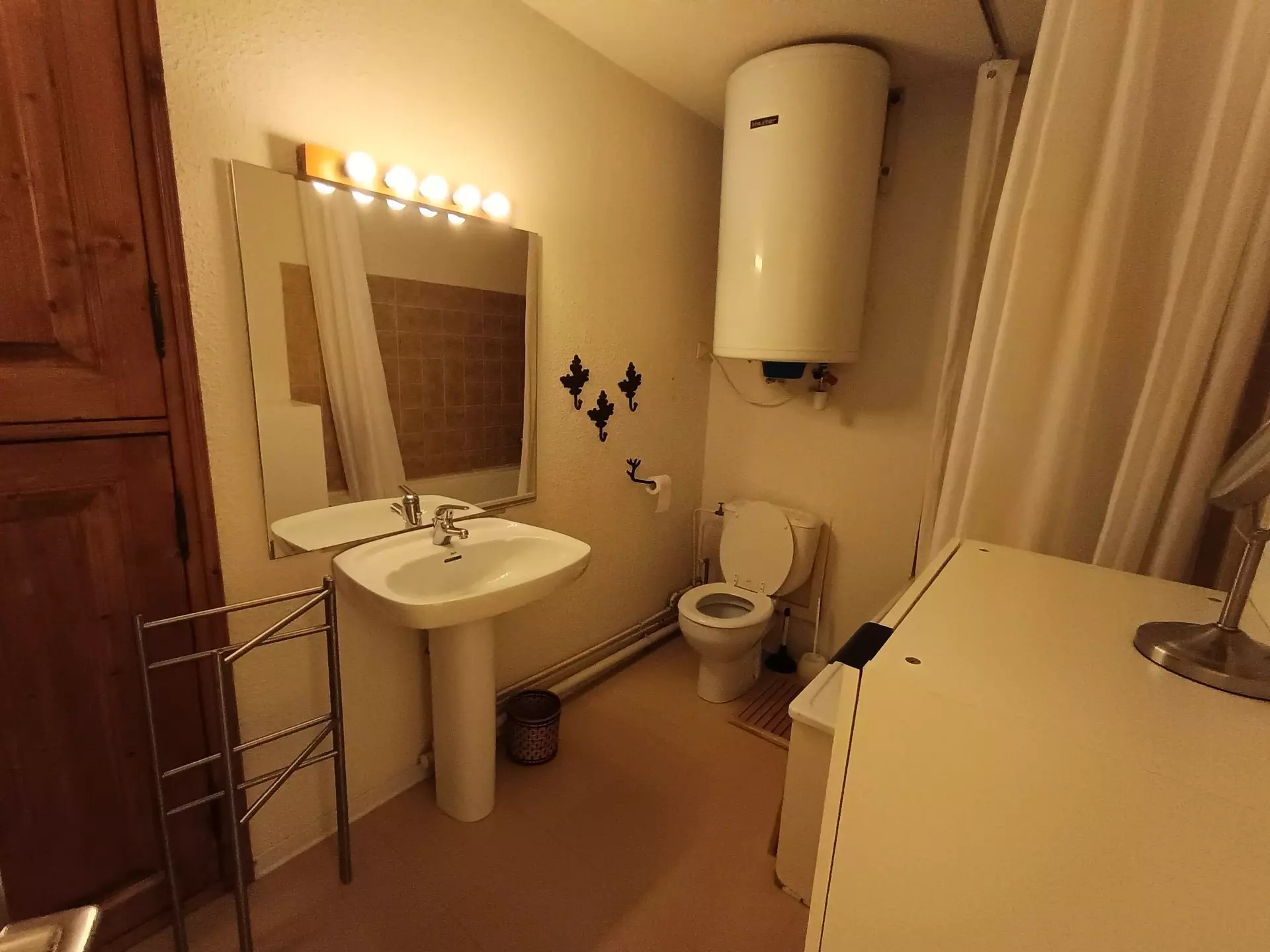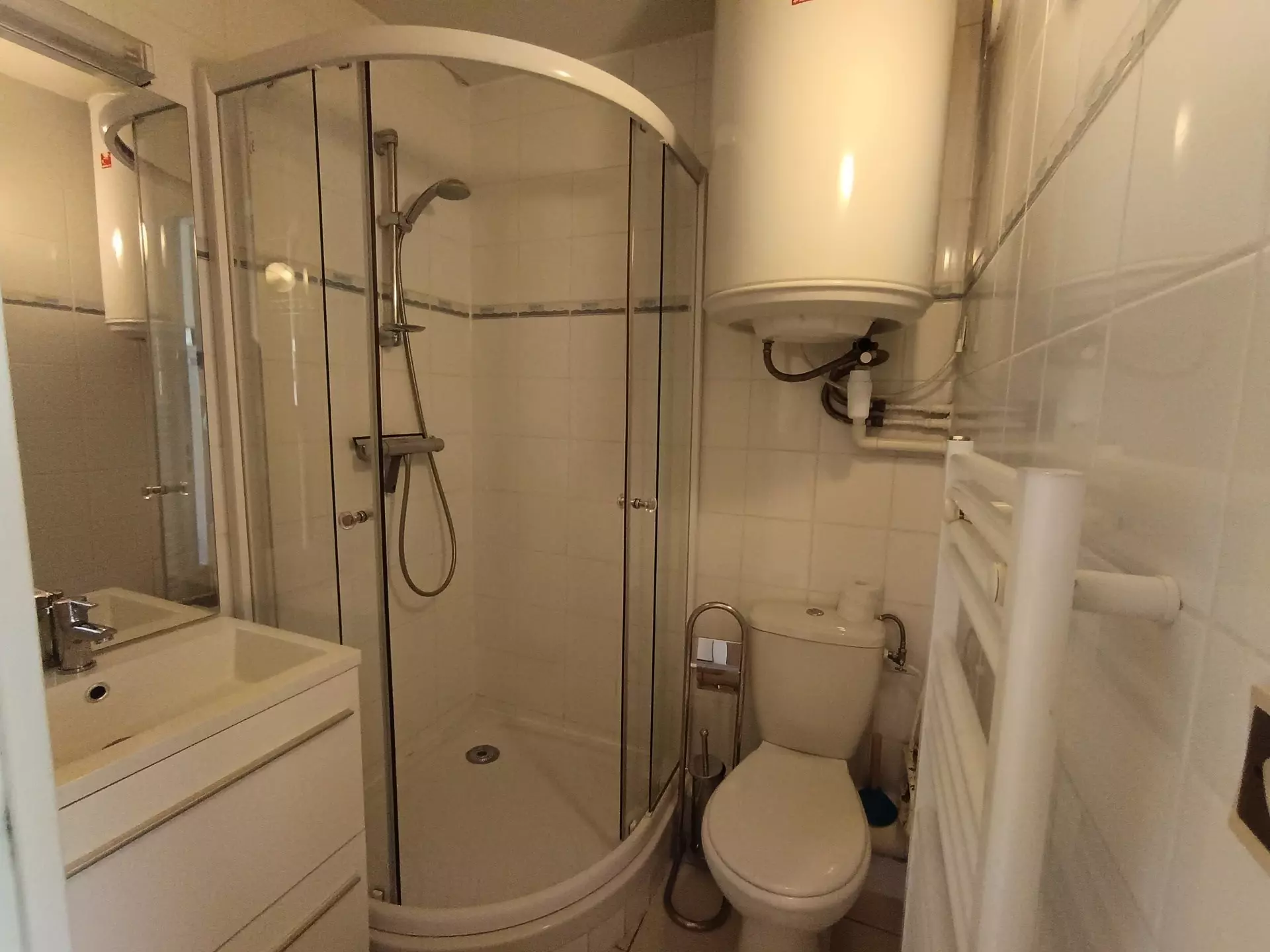 Duschraum: Eckduschkabine, WC, Waschtisch mit Waschbecken, Handtuchtrockner.