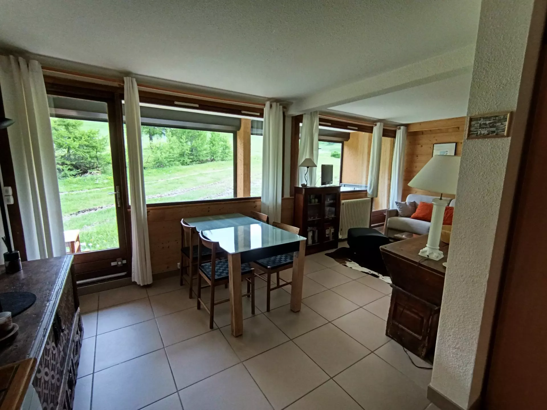 Wohnzimmer: Fernseher, großes Ecksofa für 6 bis 8 Personen, Couchtisch, Sitzecke mit Zugang zu einer großen Terrasse mit direktem Zugang zu den Pisten.