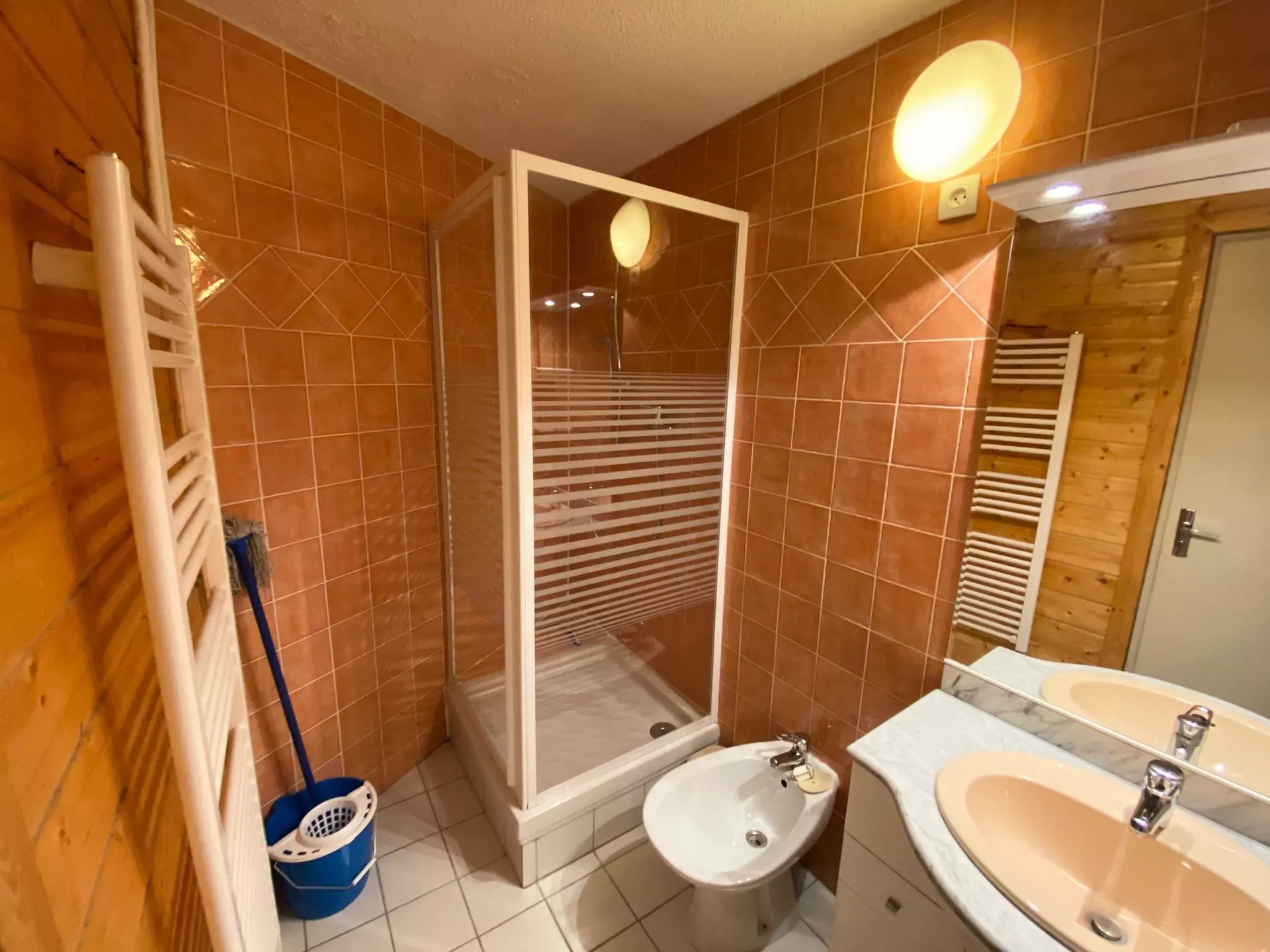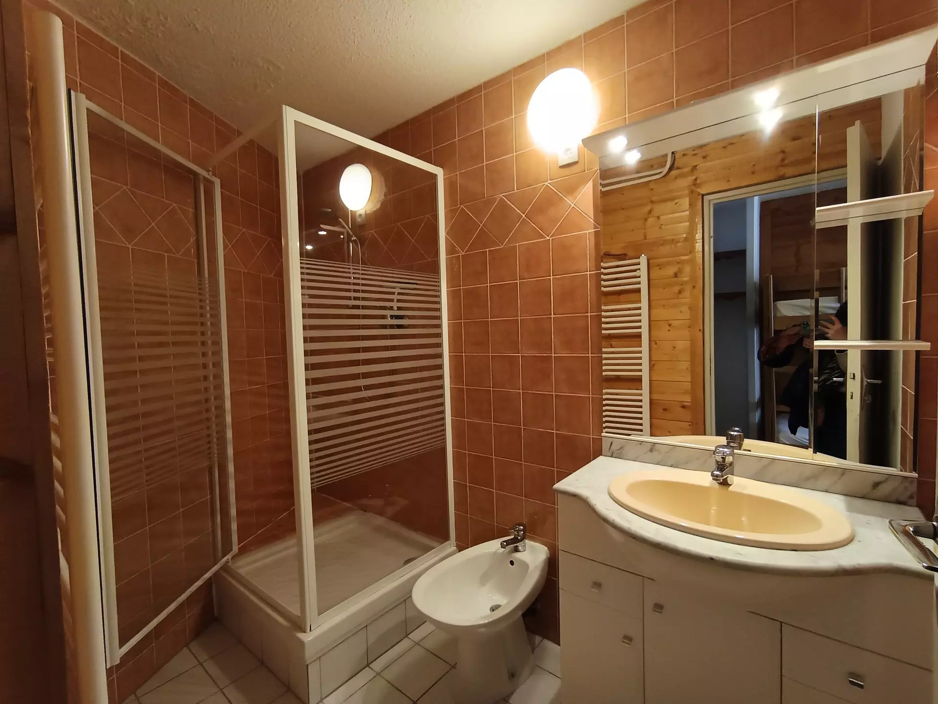 Duschraum: Duschkabine mit Duschwand, Schrank mit Waschbecken, wandmontierter elektrischer Handtuchwärmer, großer Spiegel mit Ablagen.