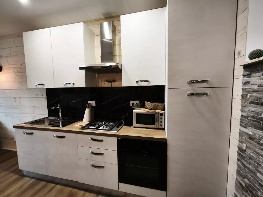 Sorgfältig ausgestattete Küche, Mikrowelle, Backofen, großer Kühlschrank mit Gefrierfach, Geschirrspüler, Nespresso-Kaffeemaschine.