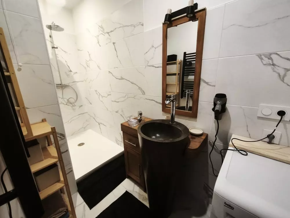 Badezimmer mit Dusche, Waschmaschine.