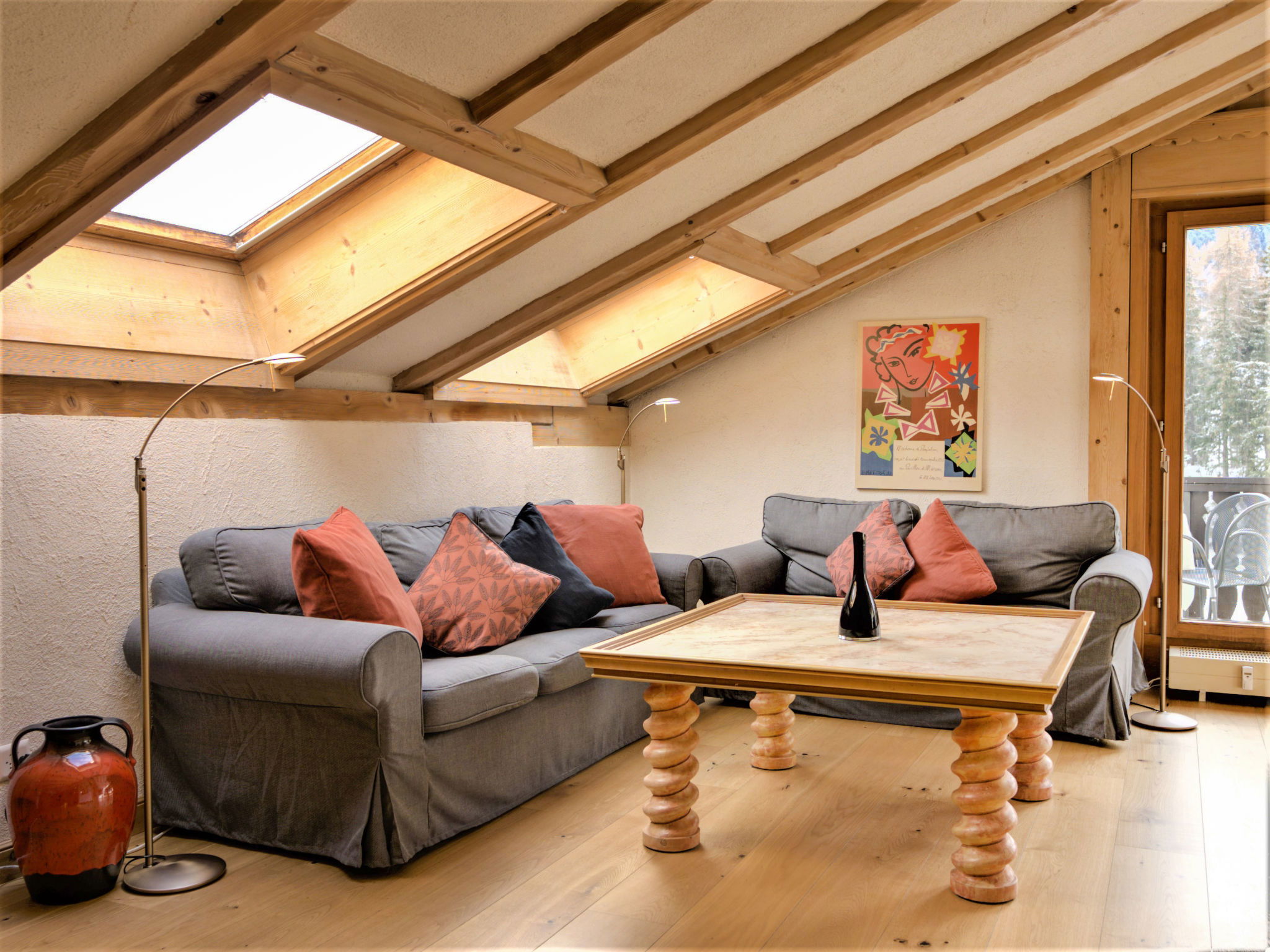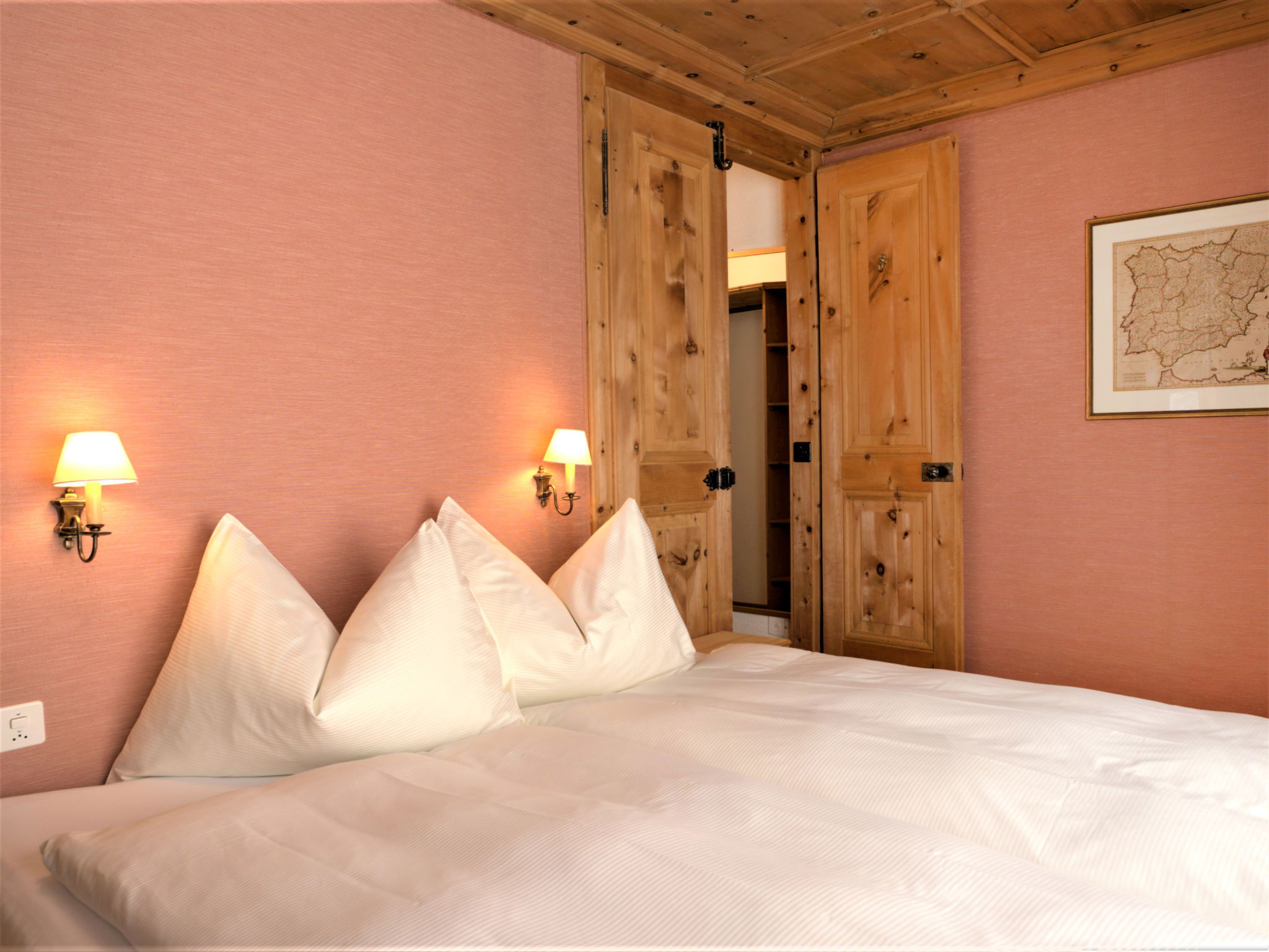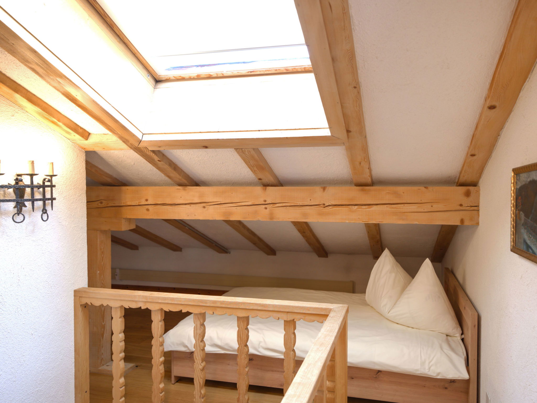 "Chesa Misaun", 3-Zimmer-Wohnung 95 m2 auf 2 Stockwerken, im Dachgeschoss. Gemütlich und mit viel Holz eingerichtet: grosses Wohn-/Esszimmer mit offenem Kamin, Essecke und Sat-TV (Flachbildschirm), Radio. Ausgang zum Balkon, Richtung Süden. 1 Zimmer mit 1 Doppelbett (2 x 90 cm, Länge 185 cm), Bad/WC. Ausgang zum Balkon. Küche (Backofen, Geschirrspüler, 4 Glaskeramikplatten, Toaster, Wasserkocher, Mikrowelle, Tiefkühler, elektrische Kaffeemaschine, Kapseln für die Kaffeemaschine (Nespresso) extra, Fondue Set (Chinoise, Käse)). Dachgeschoss: (steile Treppe) abgeschrägte, offene grosse Galerie mit 1 Bett (120 cm, Länge 200 cm), 1 Doppelbett (2 x 90 cm, Länge 200 cm), Dusche/WC. 2 kleine Balkone. Terrassenmöbel (3). Sehr schöne Sicht auf die Berge, den Fluss und den Wald. Zur Verfügung: Bügeleisen, Haartrockner. Internet (Wireless LAN, gratis). Garage Nr. 6 in 300 m, Höhe 200 cm, Breite 225 cm. Maximal 1 Haustier/Hund erlaubt. Anstelle eines abgeschlossenen Schlafzimmers befinden sich manche Schlafplätze in einem offenen Bereich (Galerie, Nische etc.).