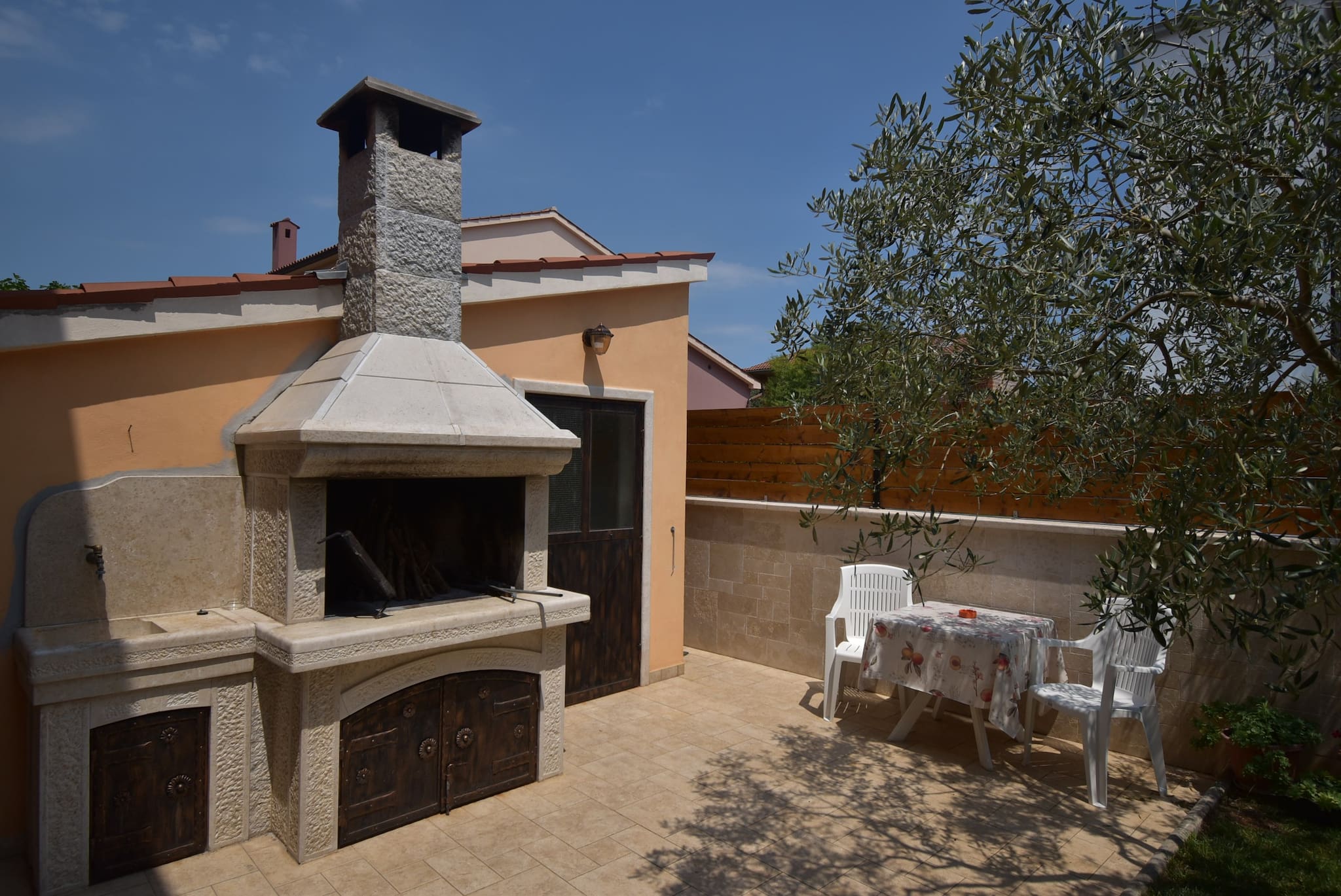 Die Gäste können in einem schönen Garten entspannen und köstliche Mahlzeiten auf einem gemeinsamen Grill zubereiten.