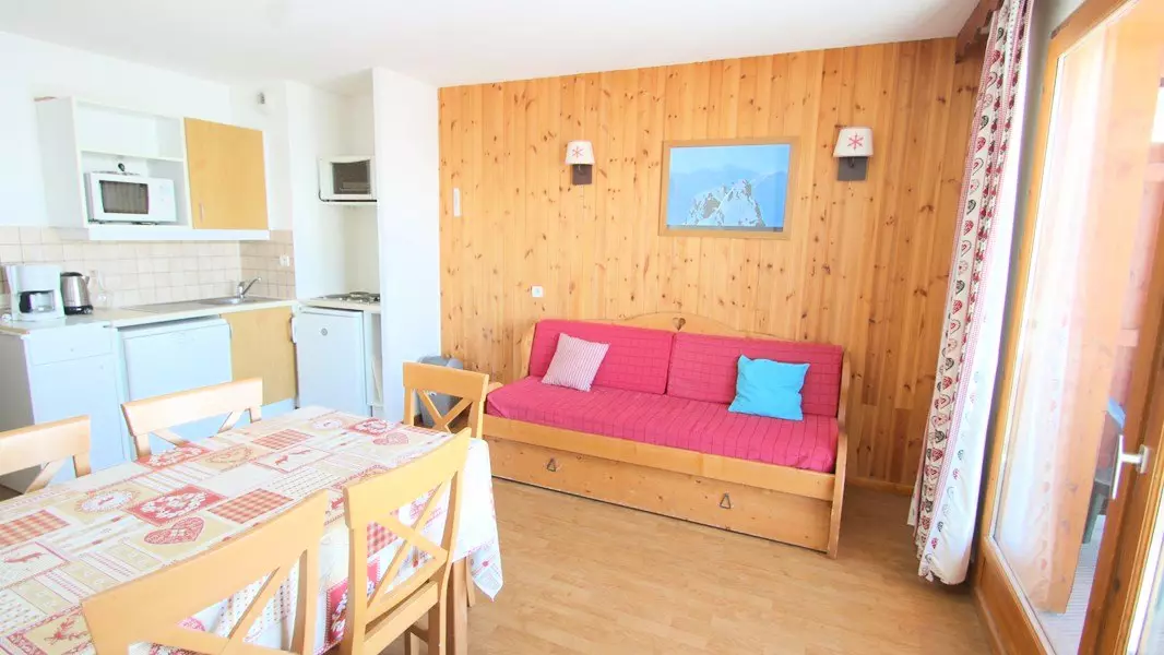 Mitten in der Piste, hübsche, hochwertige Wohnung, Balkon, möbliert und ausgestattet für 4/6 Personen. RESIDENCE LE PARC AUX ETOI SCHWIMMBAD UND SAUNA