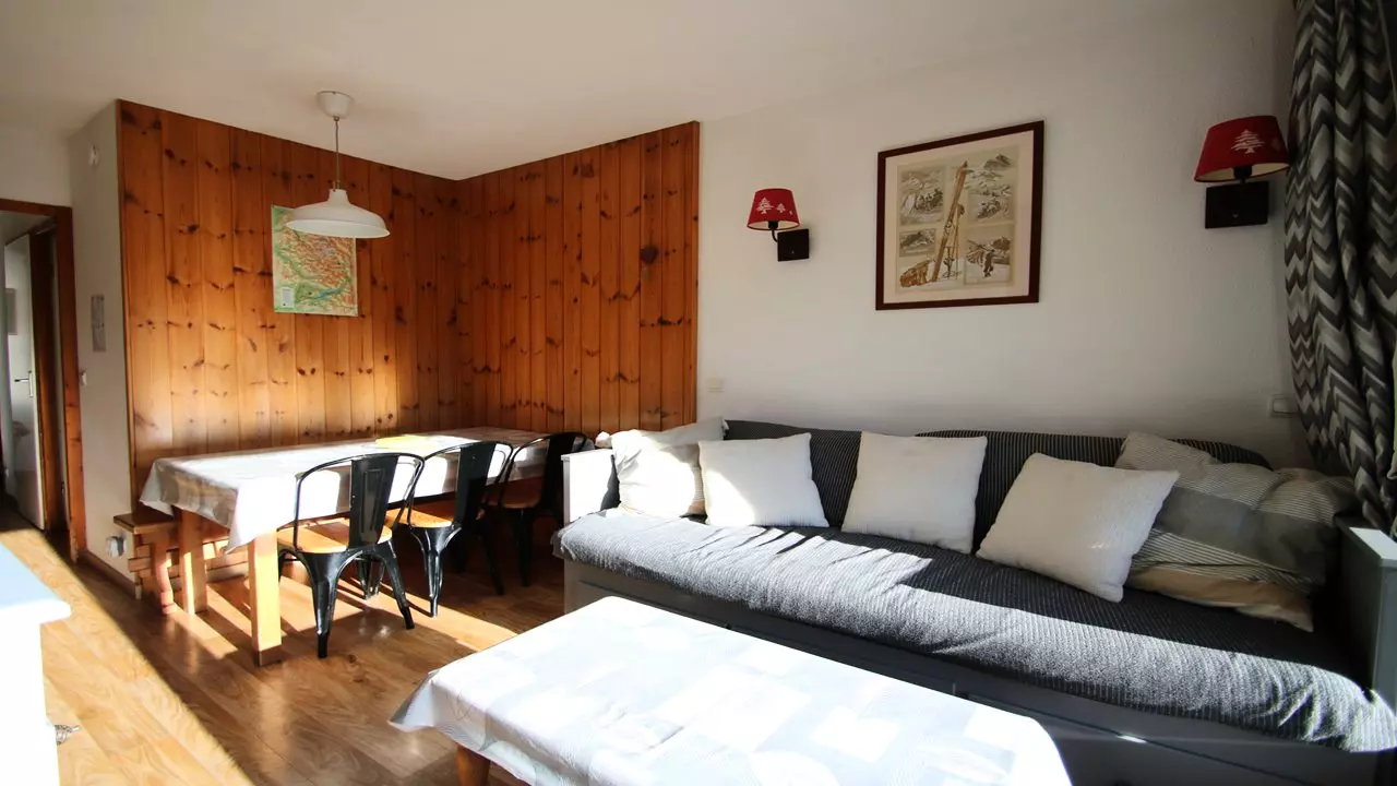 - Wohnzimmer mit ausziehbarem Schlafsofa (2x80 oder 1x160), Esstisch, Flachbildfernseher, Zugang zur Terrasse mit Tisch und zwei Stühlen