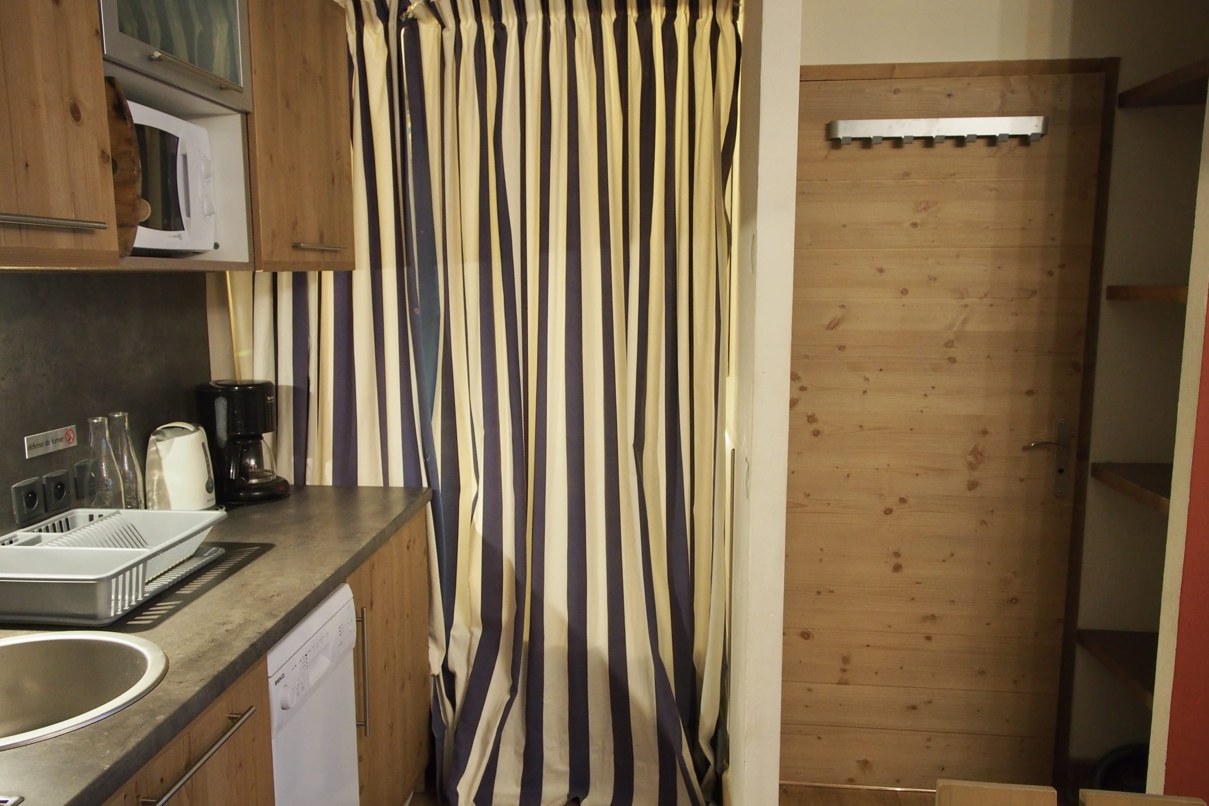 - Voll ausgestattete Küche: Geschirrspüler, Mikrowelle, herkömmlicher Backofen, Filterkaffeemaschine, Wasserkocher, Raclette-/Pierrerade- und Fondue-Set, Toaster, Mixer und Zitruspresse. Aber auch jede Menge Geschirr: Teller, Gläser, Besteck, Töpfe, Pfannen...