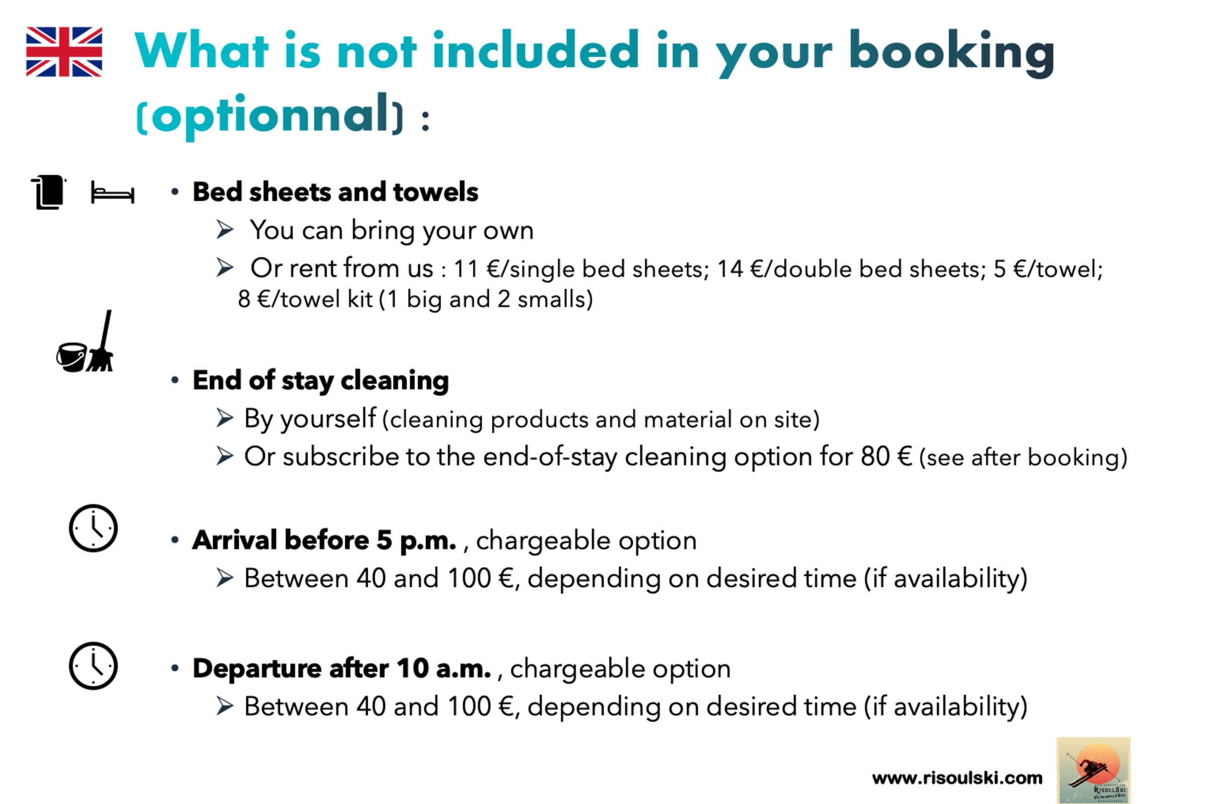 - Entweder Sie mieten eines über RisoulSki: 11 €/Einzelbett-Set; 14 €/Doppelbett-Set; 5 €/großes Handtuch; 8 €/Set Handtücher (ein großes und zwei kleine)