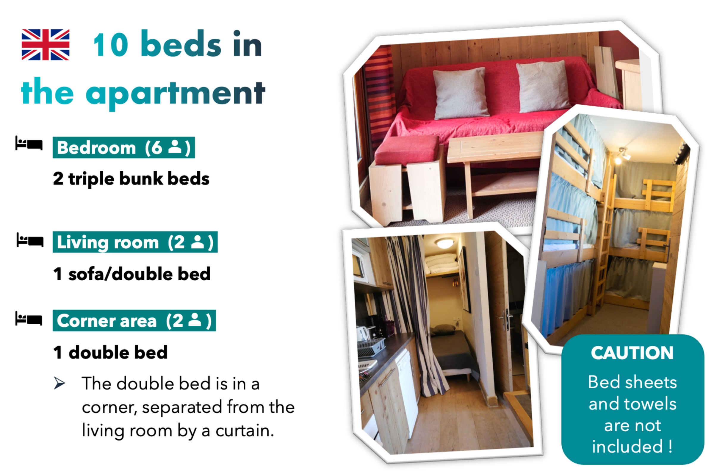 - Bettdecken, Kissen, Matratzenschoner auf jedem Bett. Hinweis: Bettwäsche muss selbst mitgebracht oder gemietet werden!