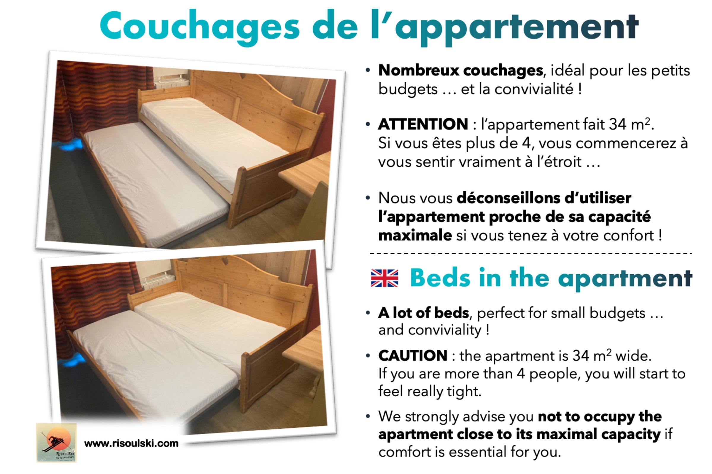 Die Unterkünfte sind praktisch und komfortabel gestaltet. Der Raum wurde optimiert, um zahlreiche Betten, aber auch viel Stauraum unterzubringen. RisoulSki ermöglicht es Familien oder Gruppen von Freunden, in einer Wohnung zusammenzukommen, sei es aus dem Wunsch nach Zusammensein oder aus finanziellen Gründen.