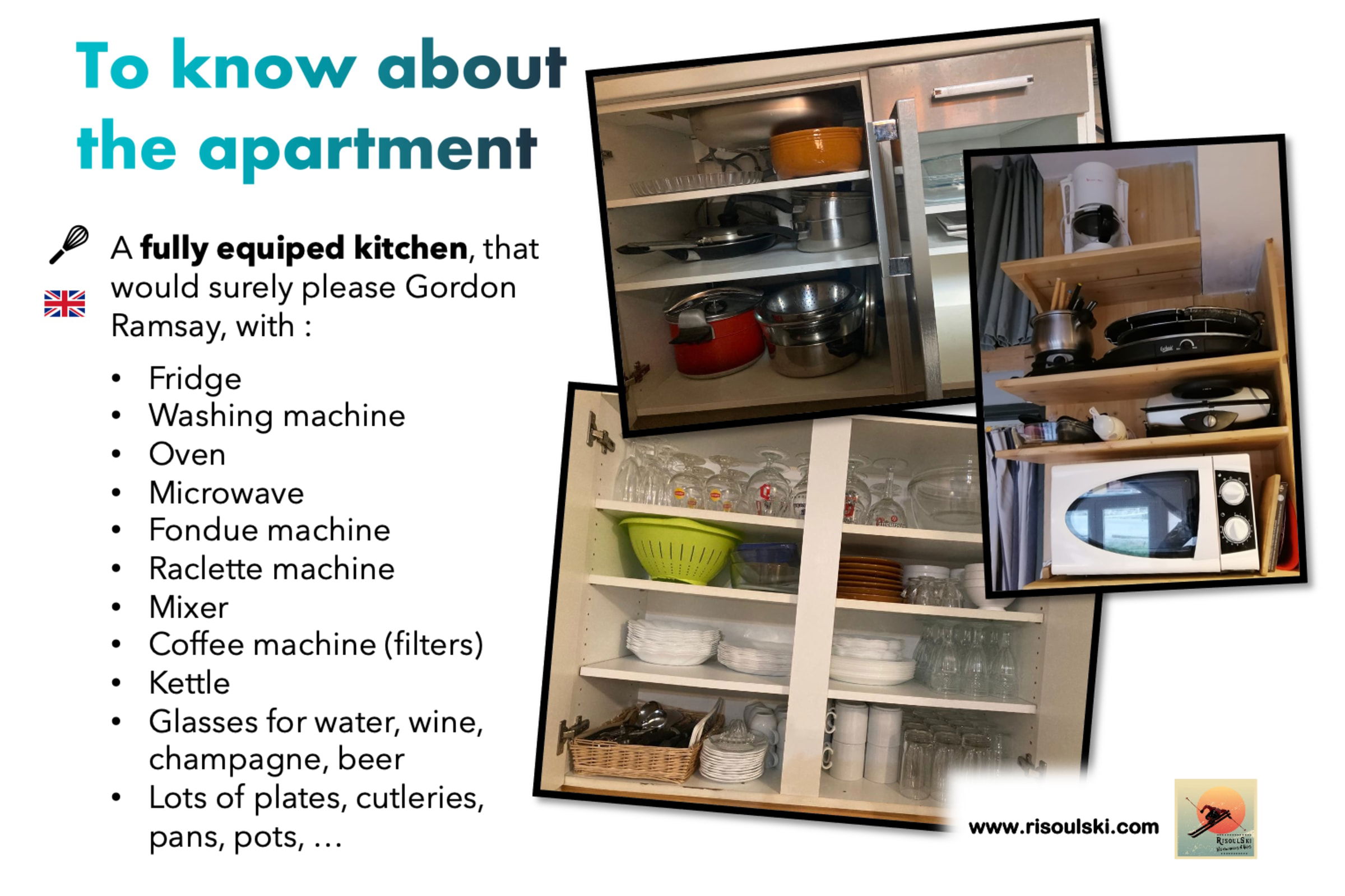 - Voll ausgestattete Küche: Geschirrspüler, Mikrowelle, traditioneller Backofen, Filterkaffeemaschine, Wasserkocher, Raclette-/Pierrade- und Fonduegerät, Toaster, Mixer und Zitruspresse. Aber auch jede Menge Geschirr: Teller, Gläser, Besteck, Töpfe, Pfannen...