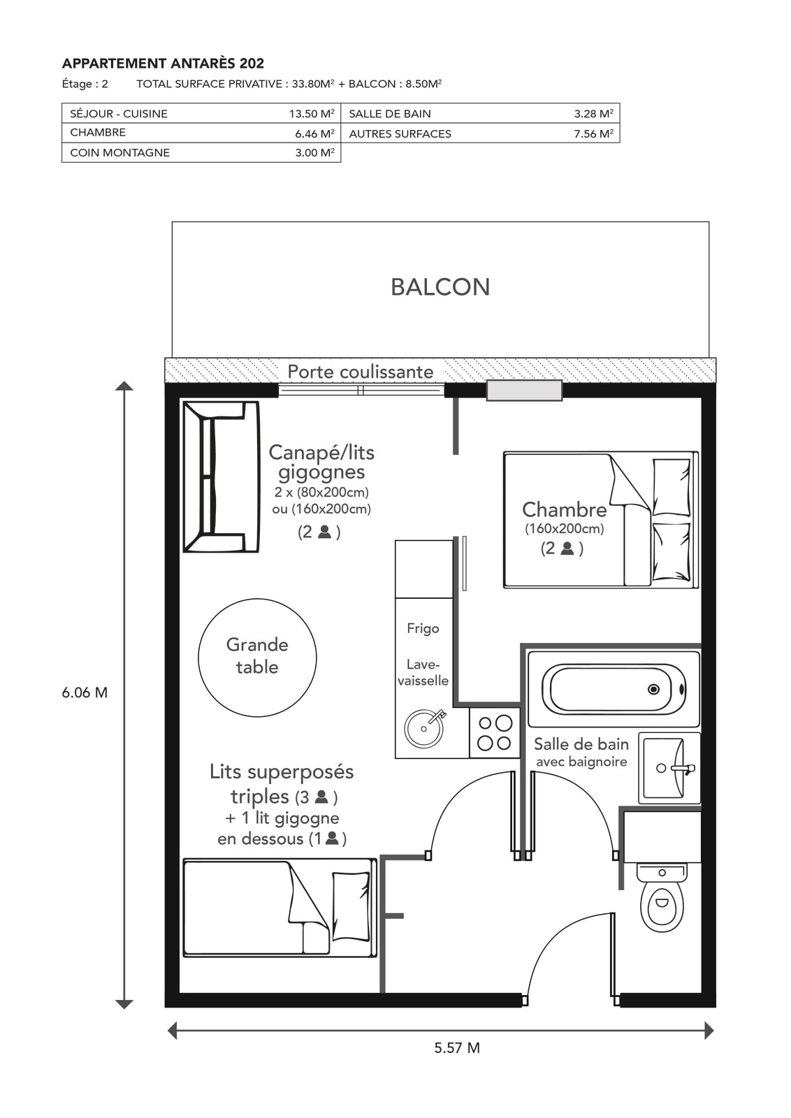 Die Unterkunft befindet sich im 2. Stock der Antarès-Residenz, genau wie das Schwimmbad. Es ist wie folgt gegliedert: