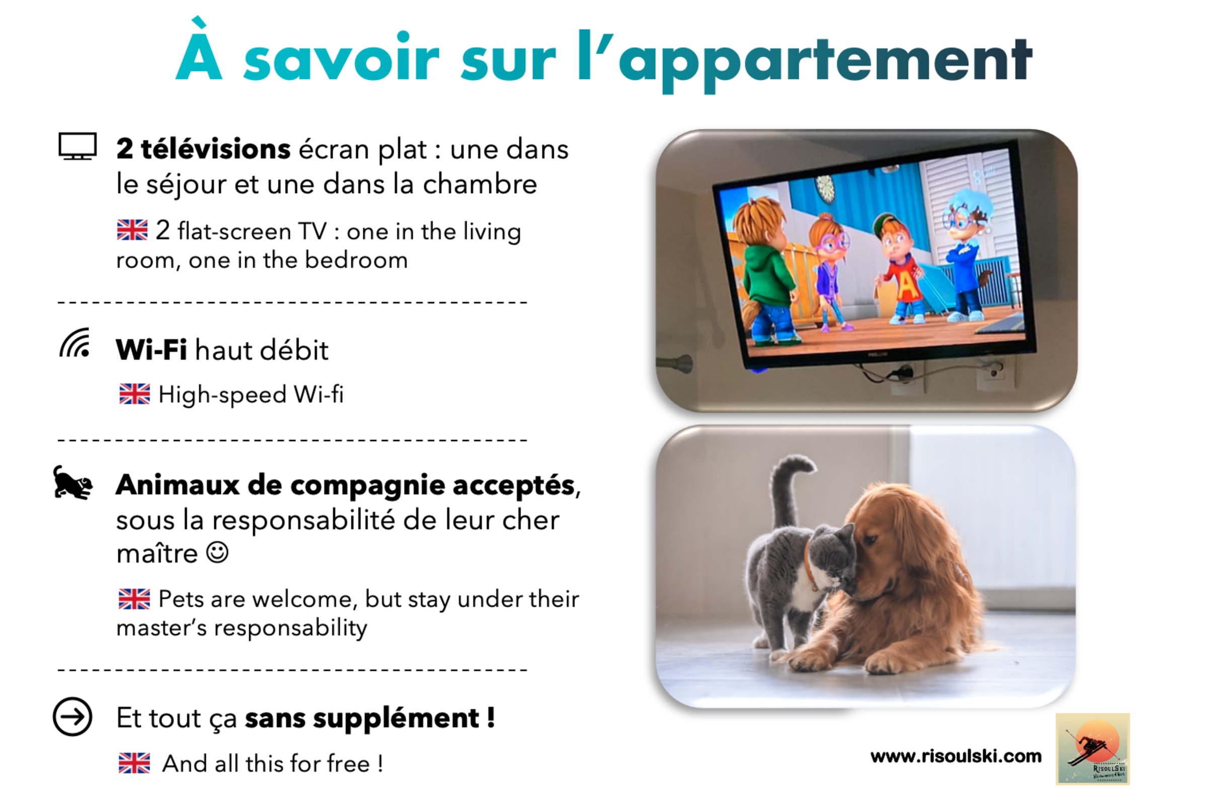 Haustiere sind bei RisoulSki ohne Aufpreis erlaubt. Sie unterliegen jedoch weiterhin der Verantwortung ihres Meisters.
