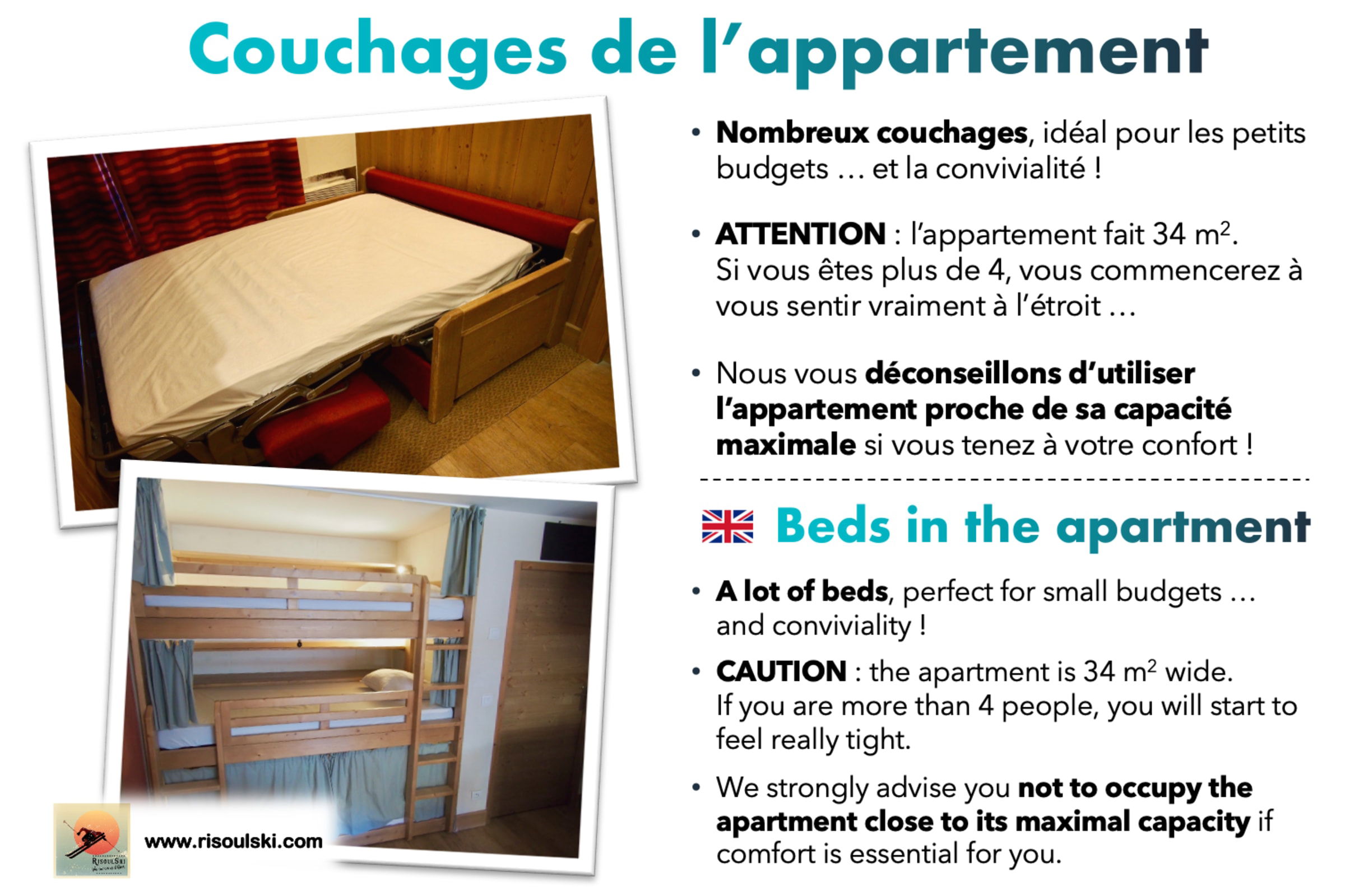 Die Unterkünfte sind praktisch und komfortabel gestaltet. Der Raum wurde optimiert, um viele Betten, aber auch viel Stauraum unterzubringen. RisoulSki bietet Familien oder Freundesgruppen die Möglichkeit, in einem einzigen Apartment zusammenzukommen, sei es aus gemeinsamem Wunsch oder aus finanziellen Gründen.