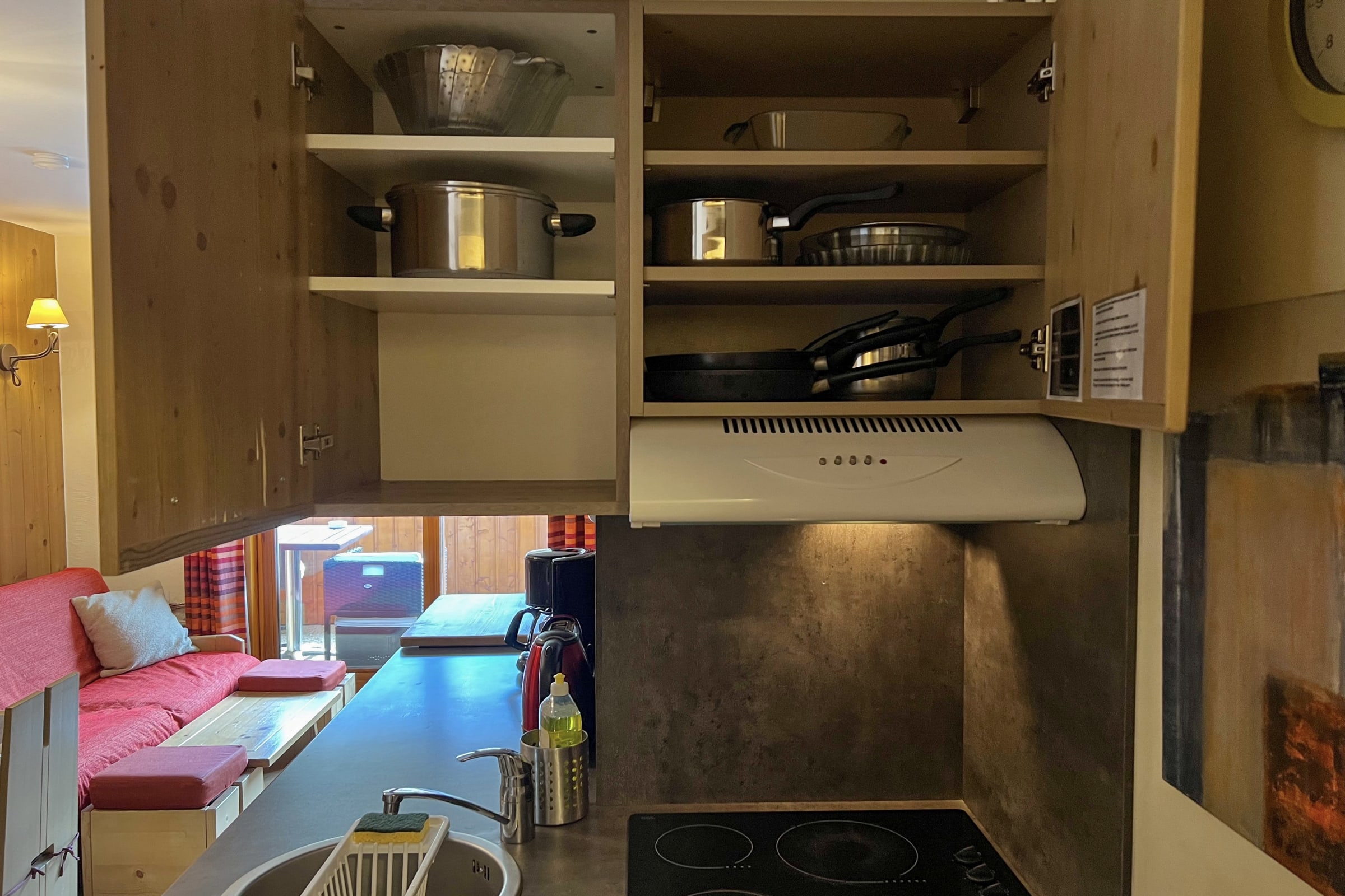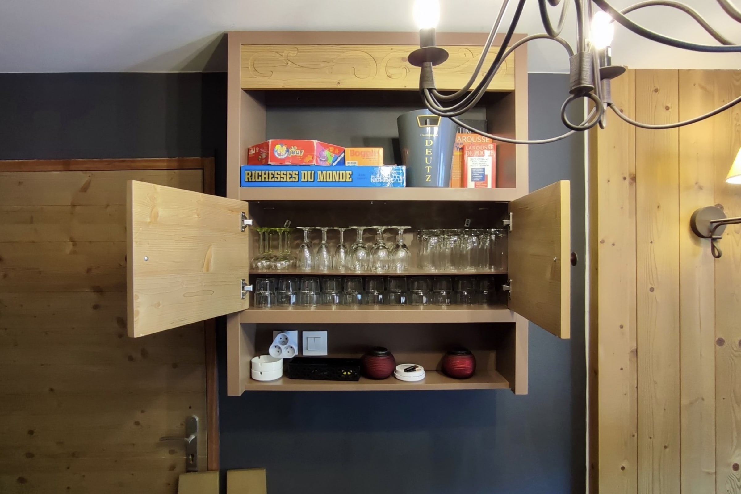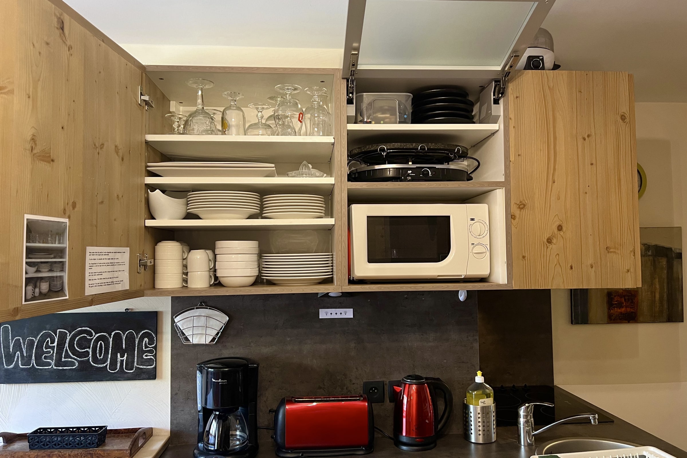 - Voll ausgestattete Küche: Geschirrspüler, Mikrowelle, herkömmlicher Backofen, Filterkaffeemaschine, Wasserkocher, Raclette-/Pierrerade- und Fondue-Set, Toaster, Mixer und Zitruspresse. Aber auch jede Menge Geschirr: Teller, Gläser, Besteck, Töpfe, Pfannen...