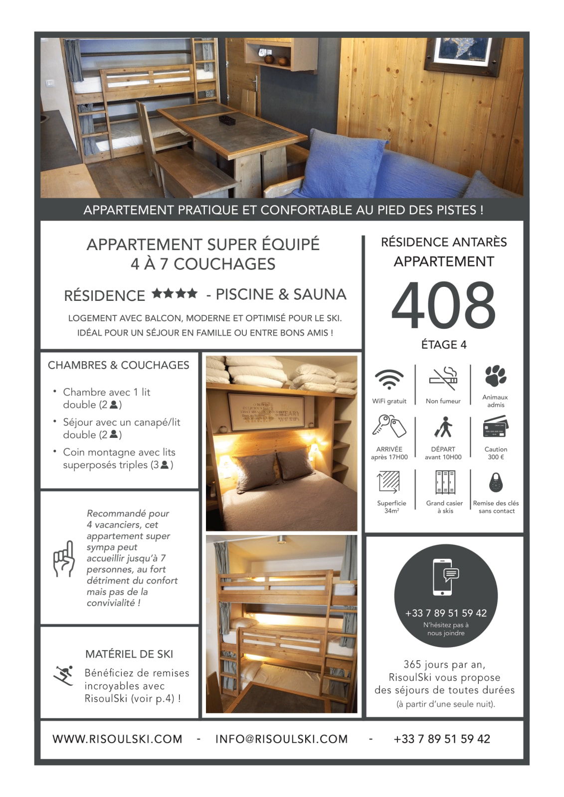 Es ist möglich, dieses Apartment mit anderen Apartments in derselben Residenz zu kombinieren. Zögern Sie nicht, RisoulSki zu kontaktieren!