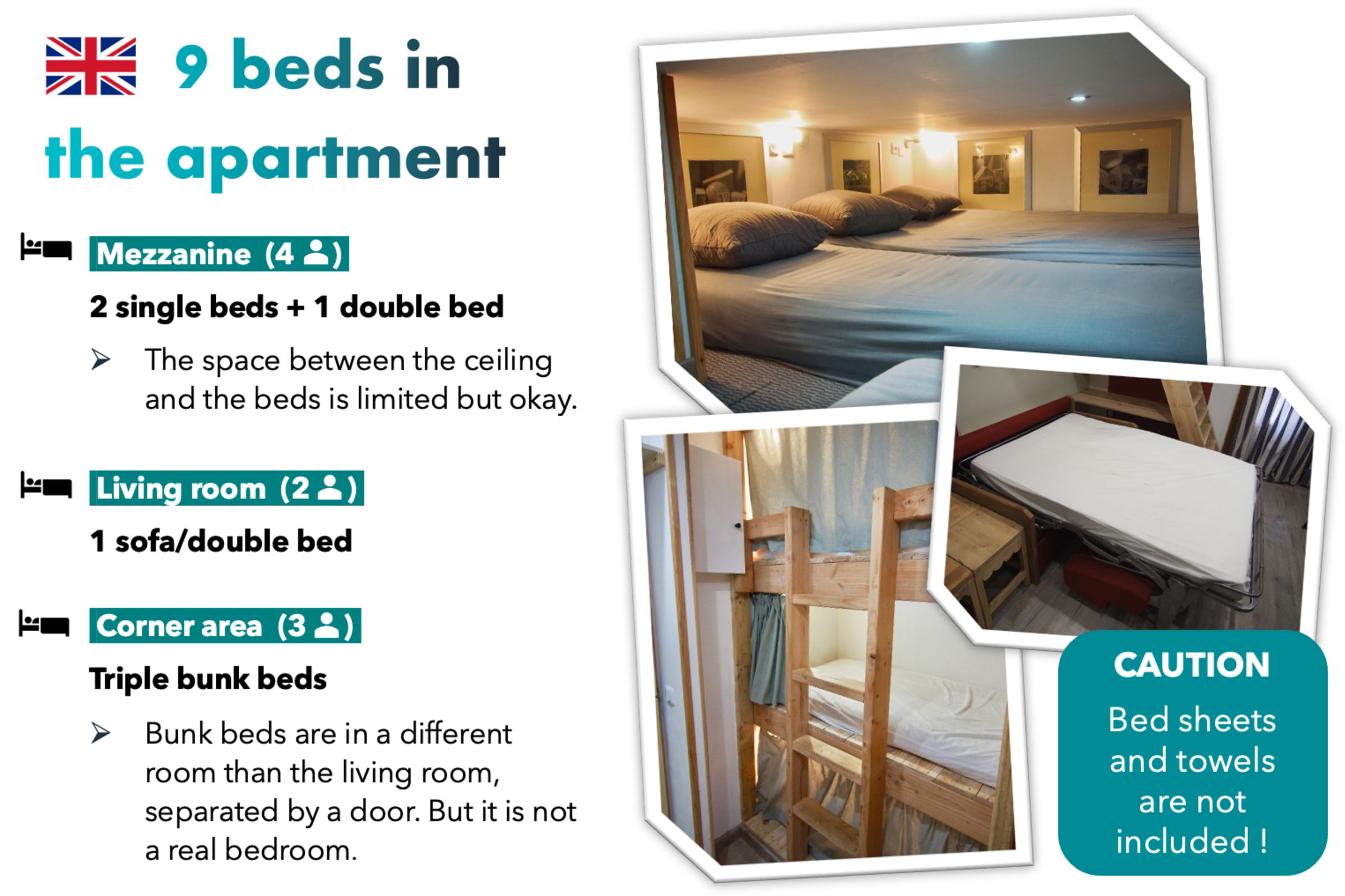 - Bergecke mit drei Etagenbetten (also kein richtiges Schlafzimmer), in der Eingangshalle gelegen
